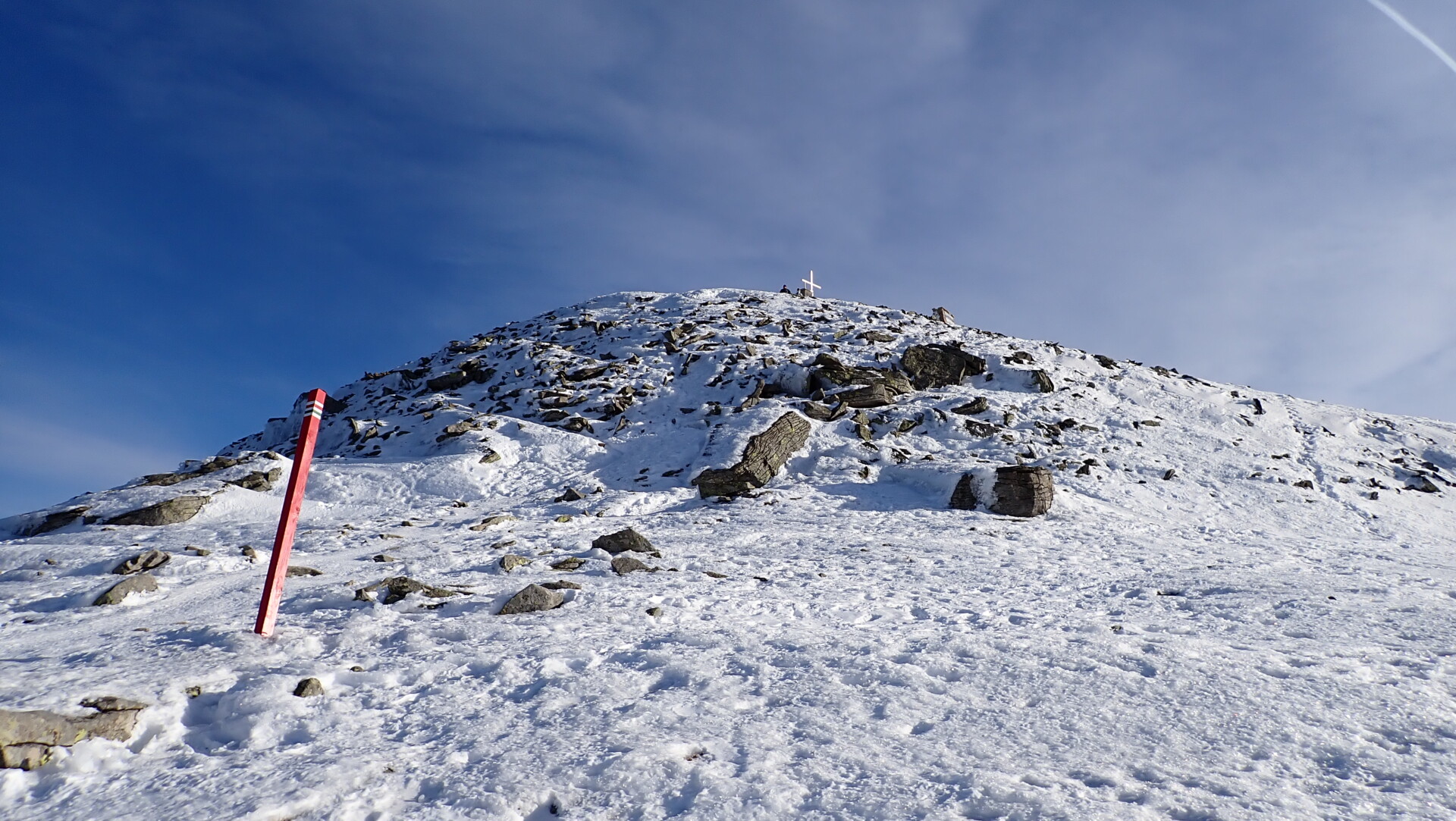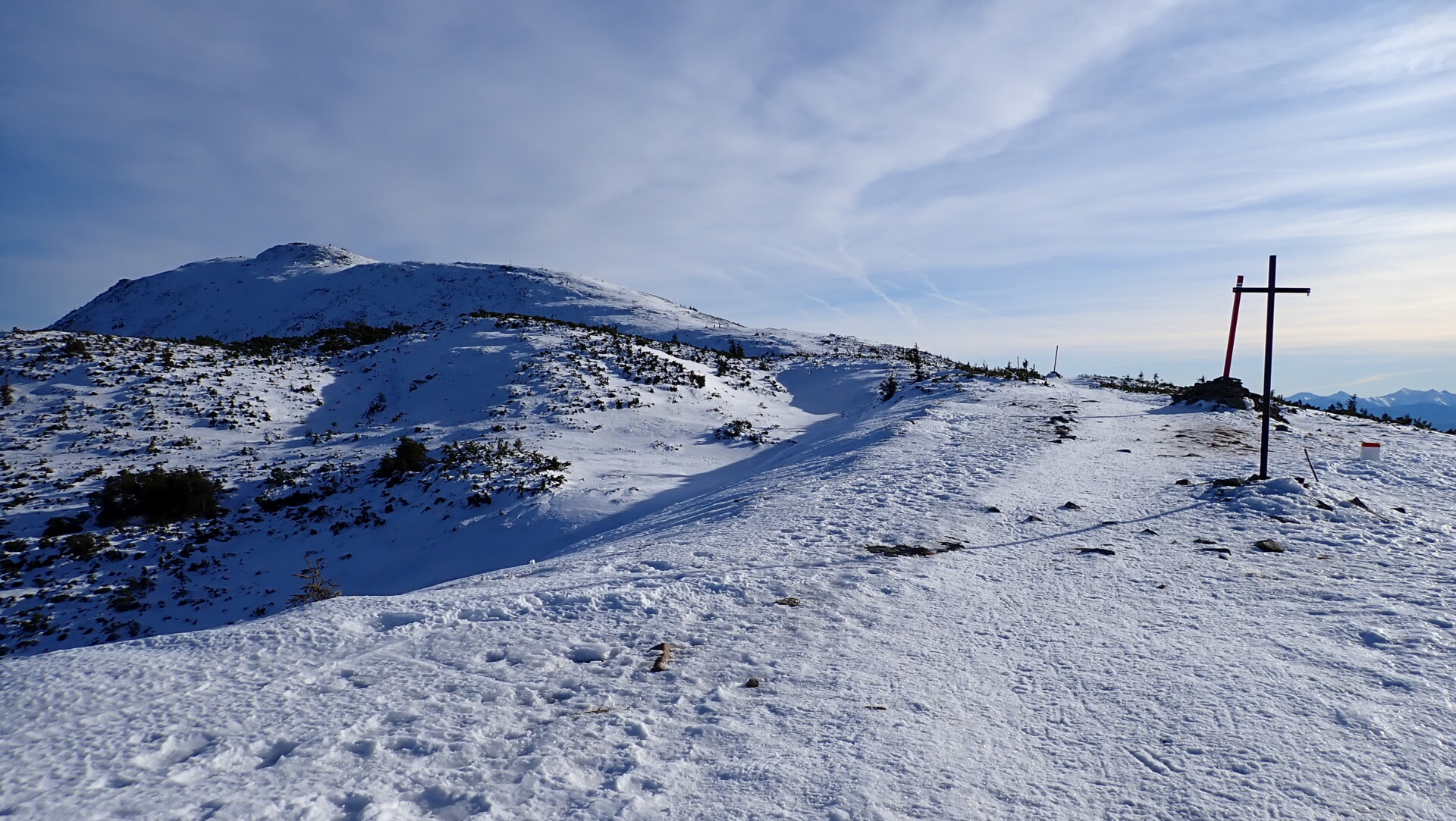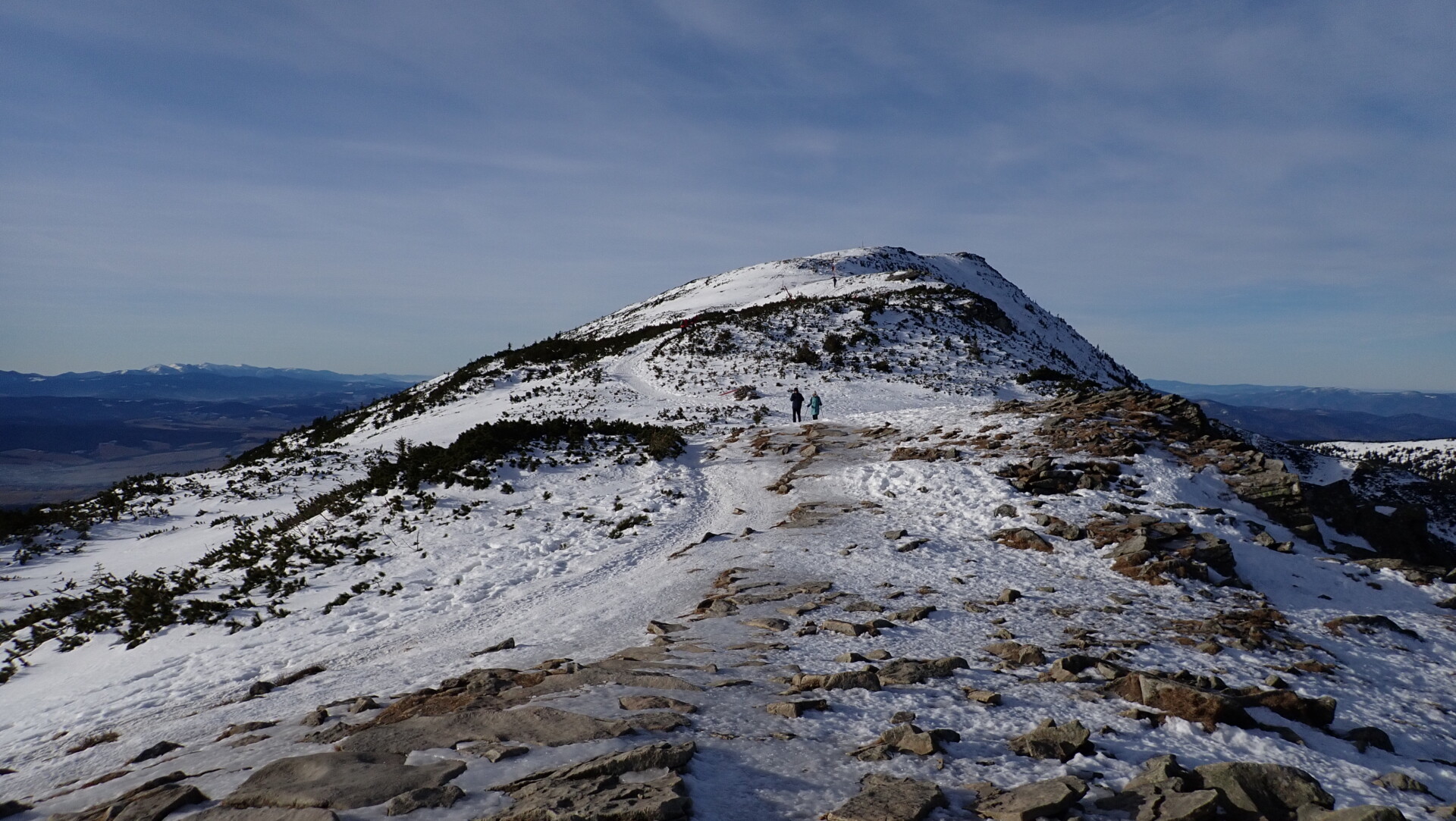 Tłumy na górze nie były zaskoczeniem, ale dzięki rozległej kopule szczytowej zawsze można znaleźć swój kawałek ciszy. Pogratulowałem sobie osiągnięcia, zjadłem szybkie śniadanie (~15 minut) i ruszyłem dalej czerwonym szlakiem w dół — w Markowych miała przecież czekać ekipa nizinna.