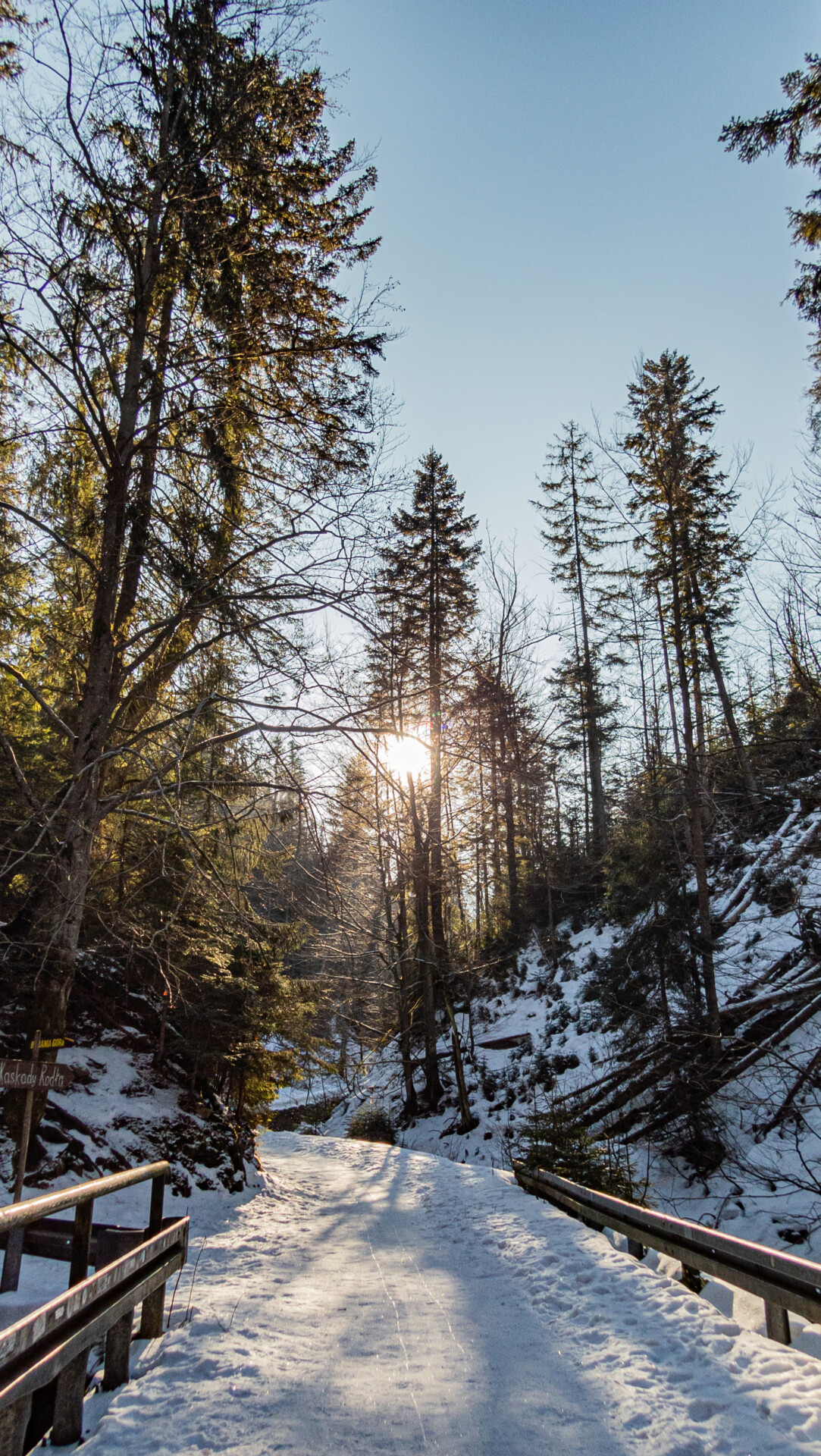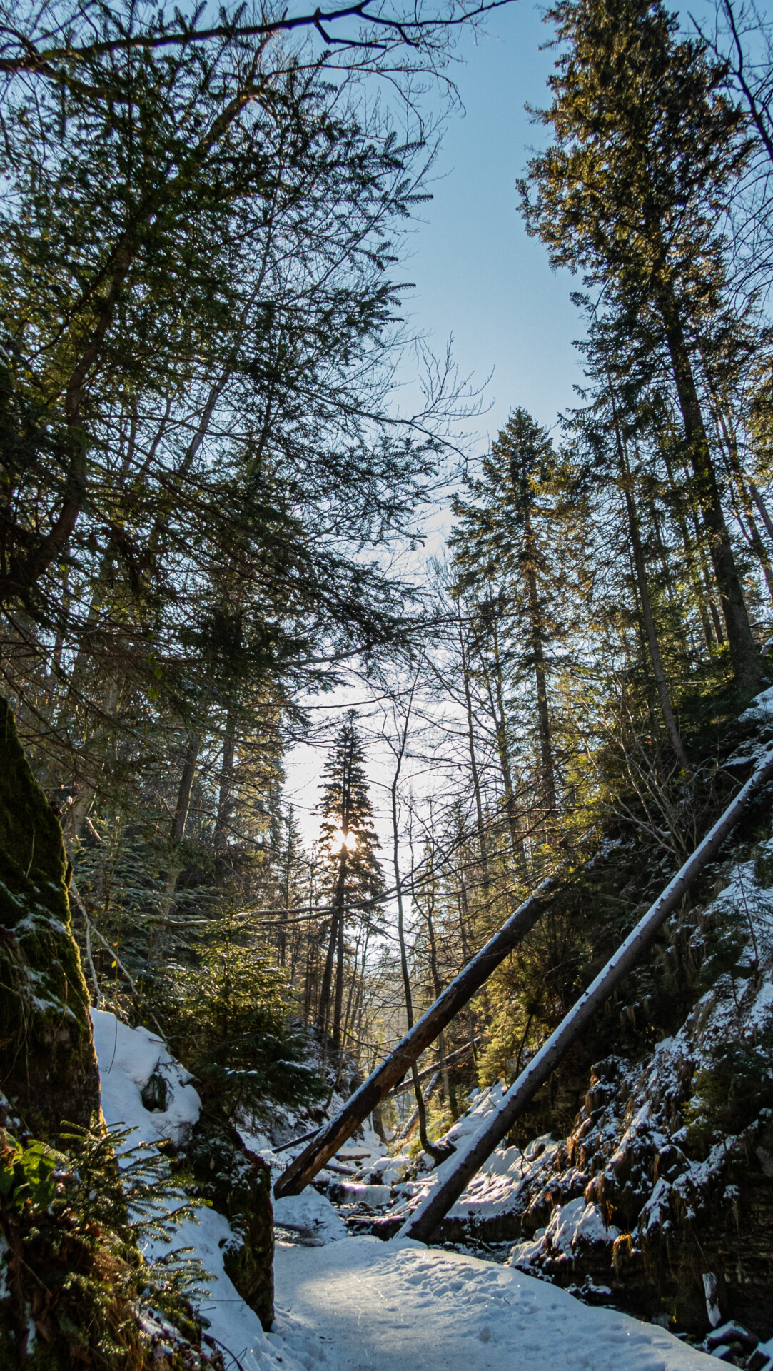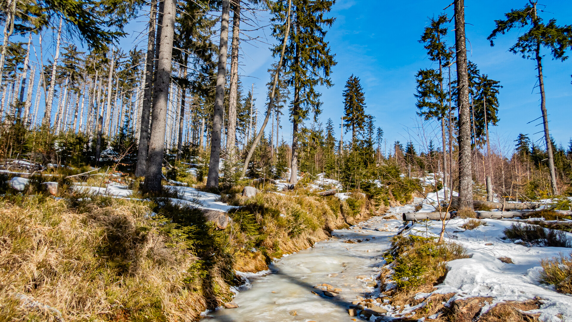 Swój marsz rozpocząłem z ostatniego płatnego parkingu w Wiśle-Czarnem, gdzie sympatyczny pan parkingowy wyjaśnił, jak kupić bilet (10 zł) w automacie tuż obok. Mróz szczypał policzki, a jednocześnie słońce przyjemnie je ogrzewało – dzień zapowiadał się idealnie. Punkt 8:30 ruszyłem pustym niebieskim szlakiem w stronę Kaskad Rodła. Pierwsze trzy kilometry to dość monotonny spacer asfaltem wzdłuż Białej Wisełki, aż do momentu, gdy szlak odbija od głównej drogi i wchodzi do lasu. Stamtąd prowadzi przez kolejne 4 km w górę, o średnim nachyleniu około 12%, aż na szczyt Baraniej.