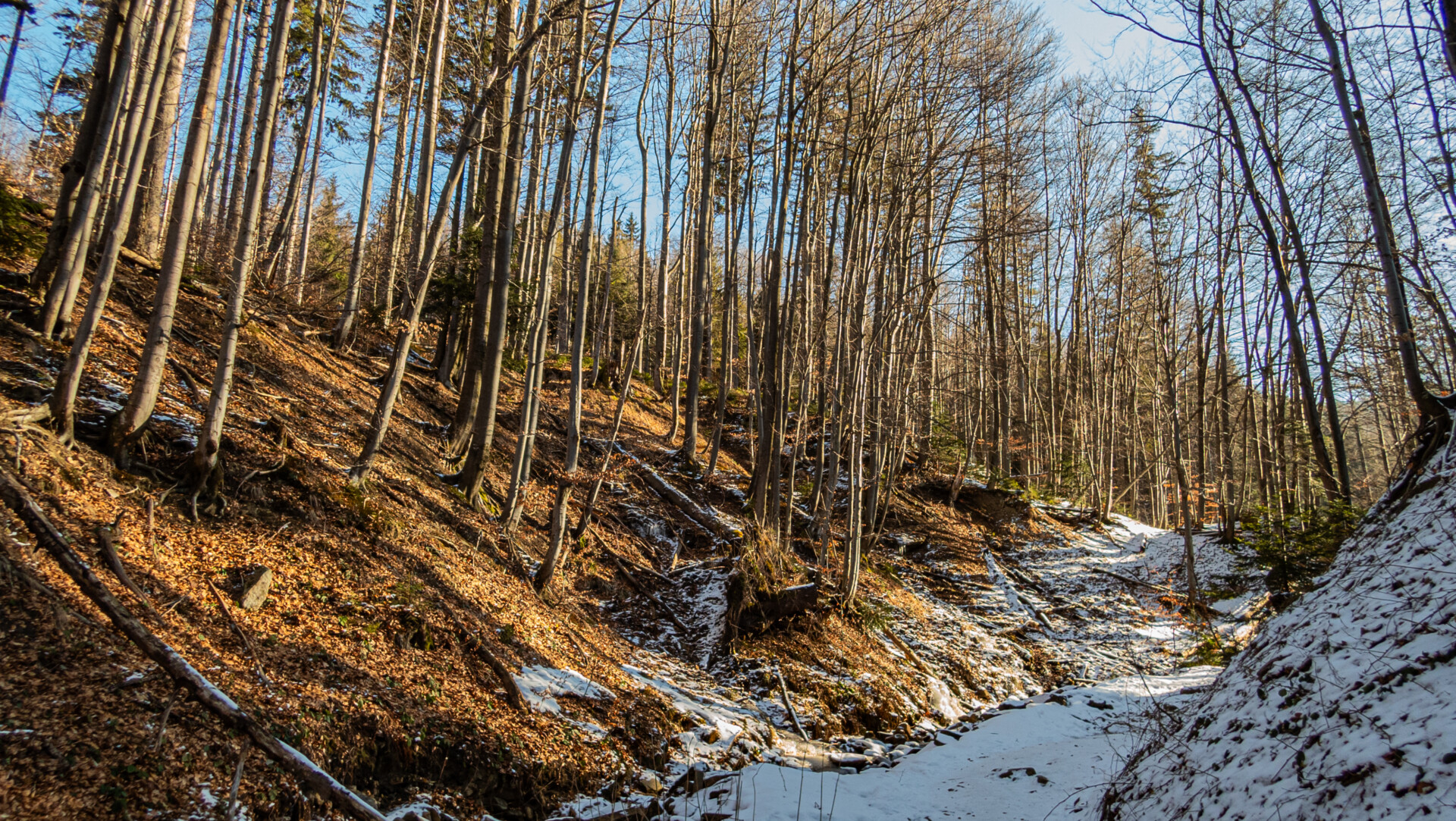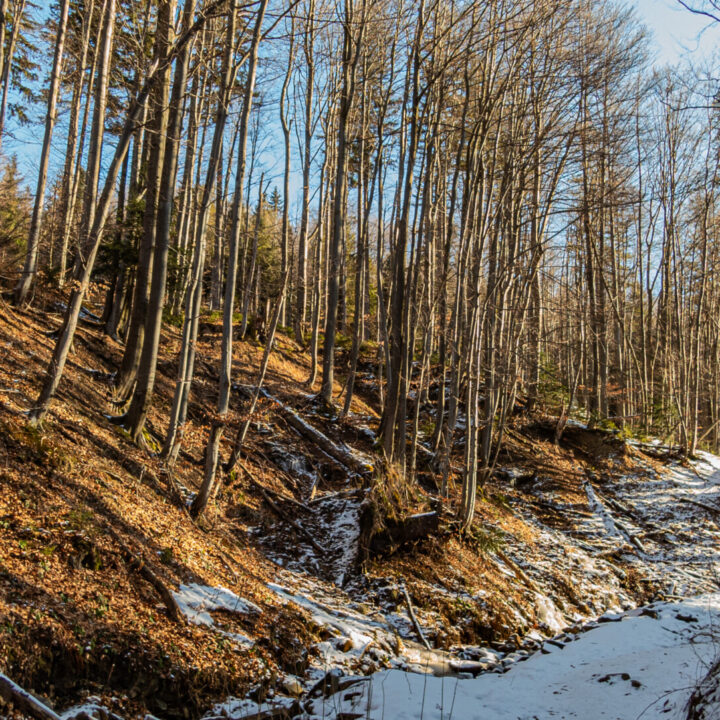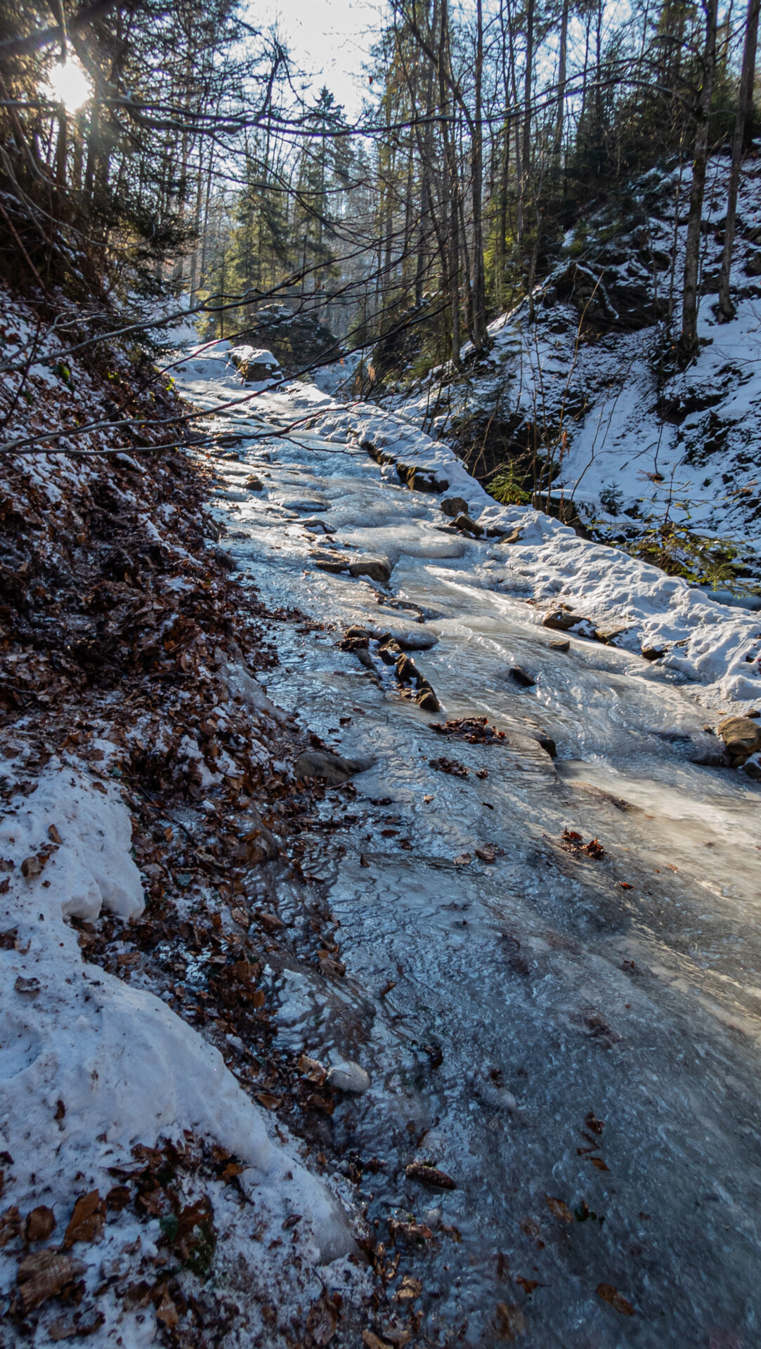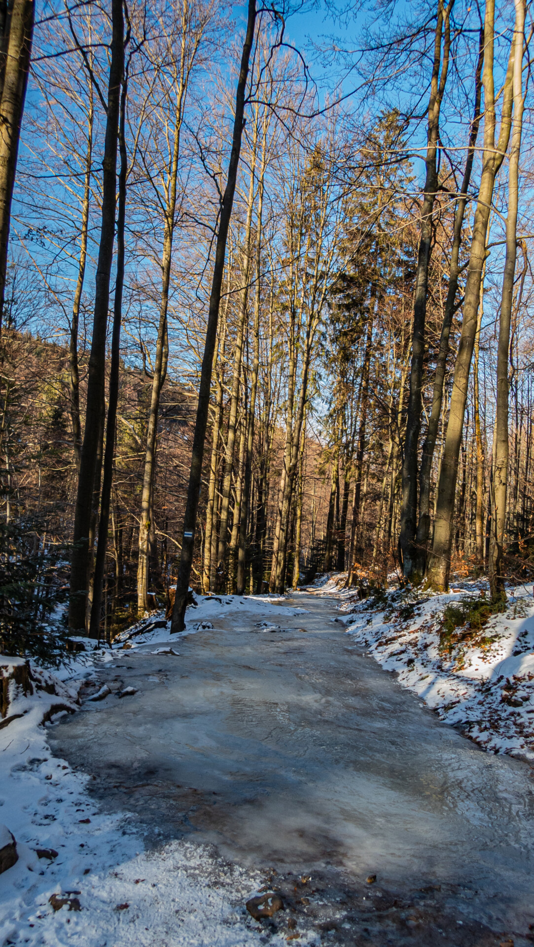 Największym wyzwaniem całej wyprawy okazały się: dające się we znaki zapalenie Achillesa, droga powrotna przez Szczyrk (odcinek 10-ciu kilometrów w 30 minut samochodem…) oraz lodowe potoki rozlane na szlaku – szczególnie w okolicy Kaskad Rodła. Choć miałem raczki, uznałem, że mogą nie wystarczyć na twardych lodowych jęzorach – czasem kilku-, czasem kilkunastometrowych – więc trasę pokonywałem bocznymi obejściami. Trzeba było mocno uważać, bo powyżej 1000 m n.p.m., w wąskich i stromszych miejscach, nawet niewielkie lodowe barykady były potencjalnie bardzo niebezpieczne – upadek mógł zakończyć się niekontrolowanym zsunięciem w dół.