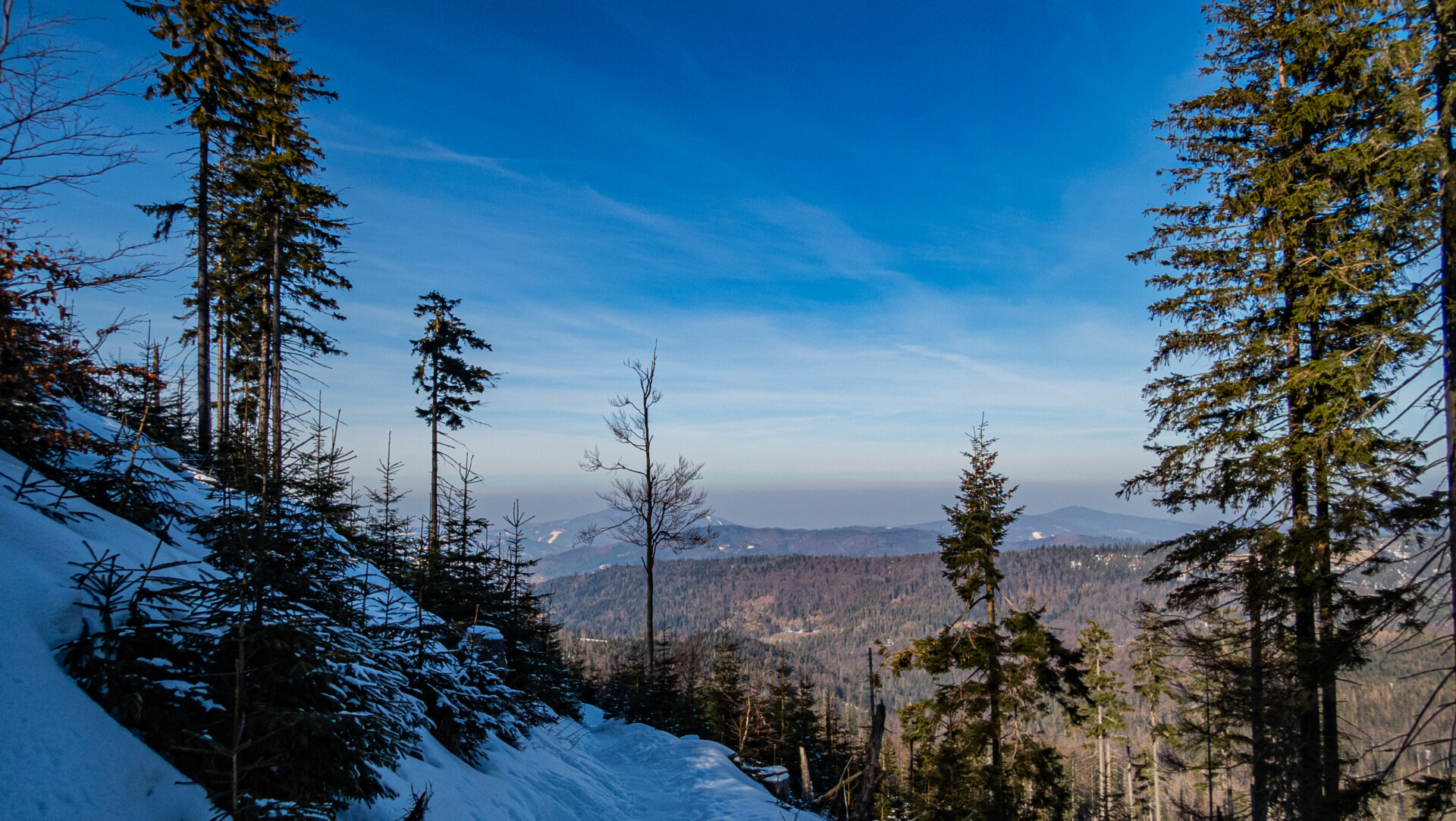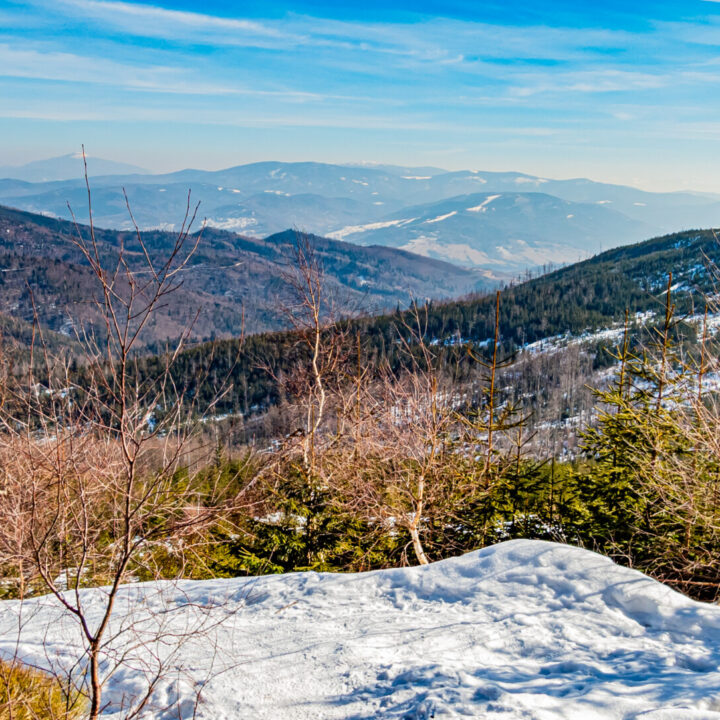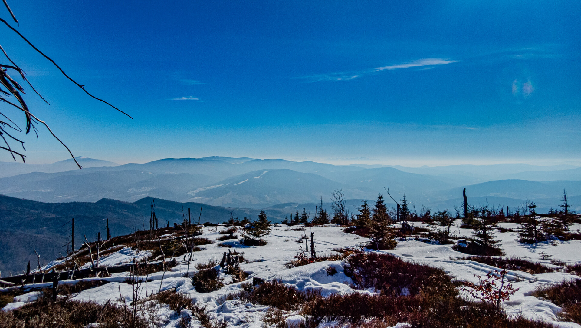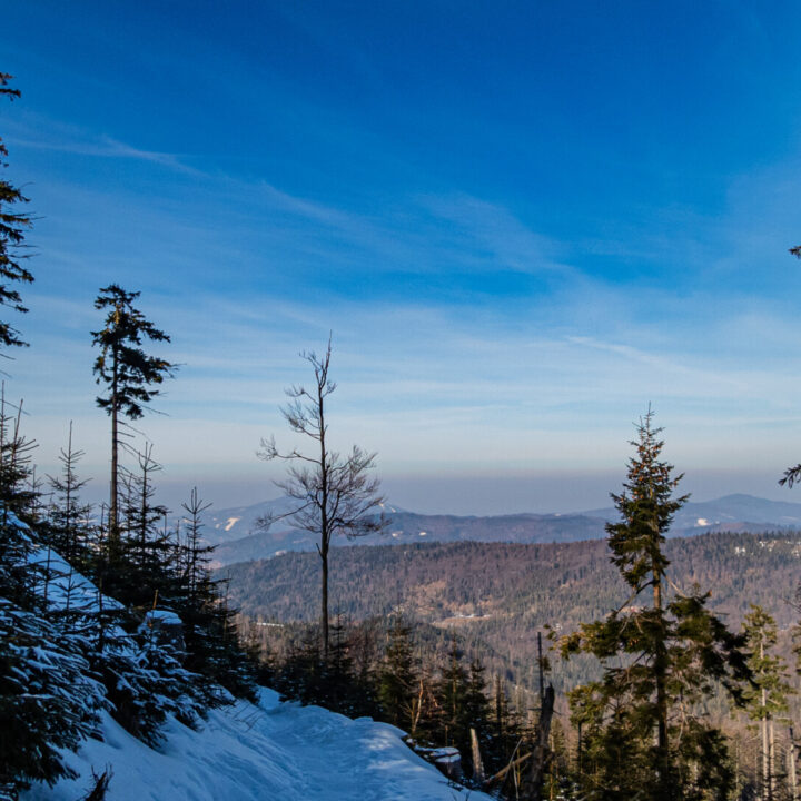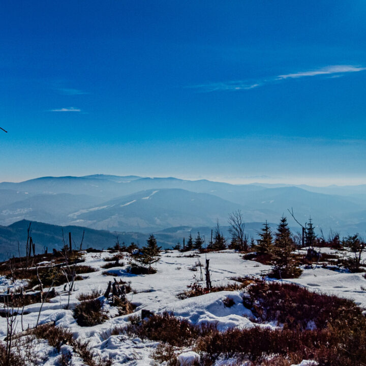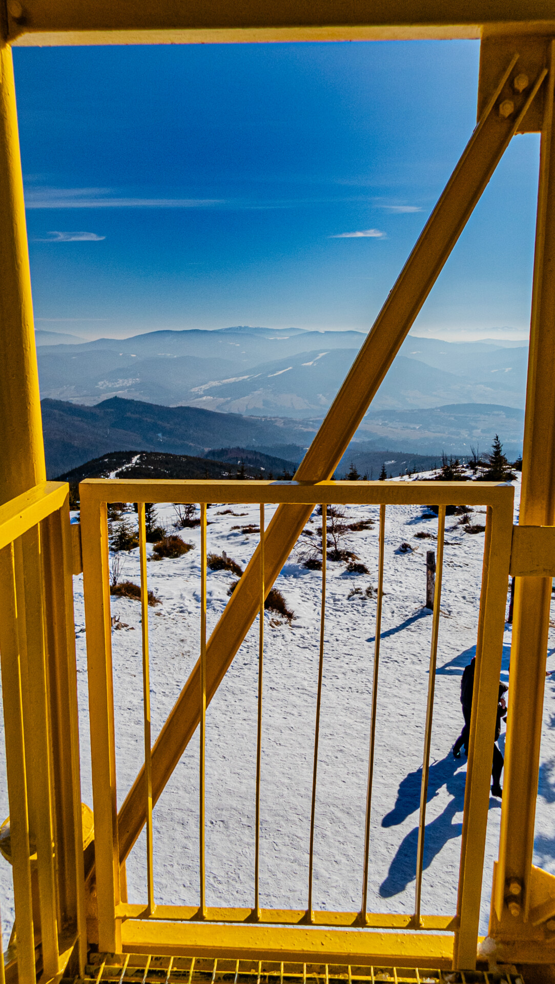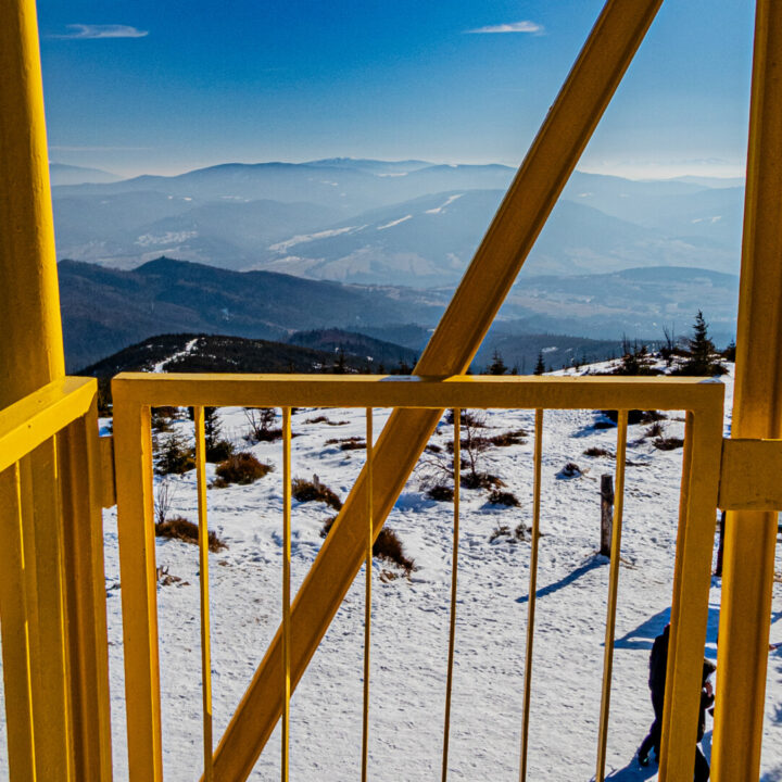 Poza tym szlak był bardzo przyjemny i nie specjalnie dał mi w kość – choć zegarek pokazał ponad 4500 kcal. Ruch był znikomy dzięki wczesnej porze. Na Baranią dotarłem w niecałe dwie godziny (gdyby nie lodowe przeszkody – byłoby znacznie szybciej). Choć niebo było czyste, Tatry majaczyły na horyzoncie ledwo widoczne z wieży widokowej.