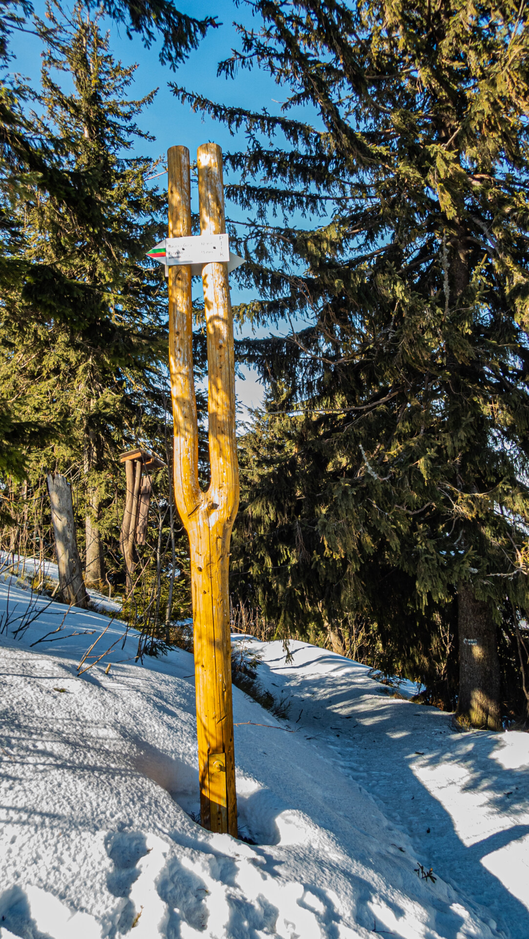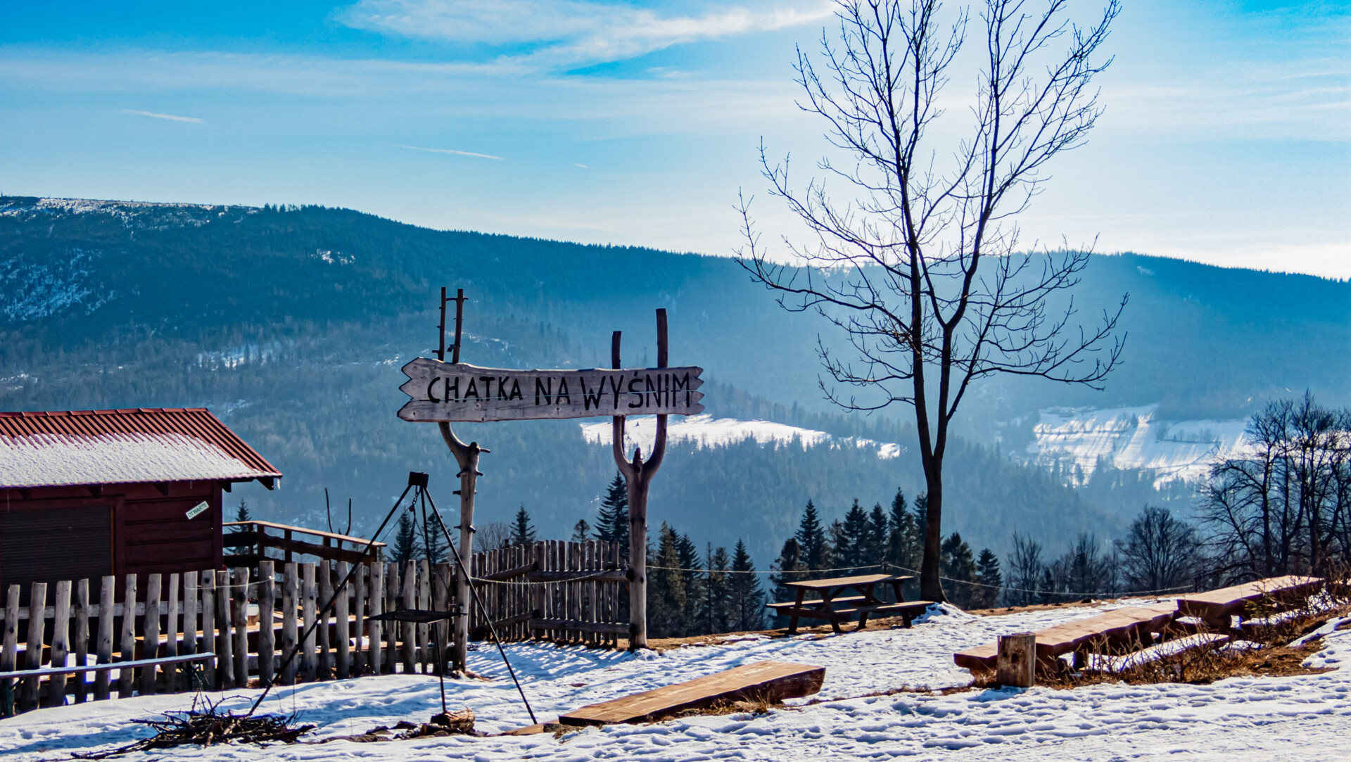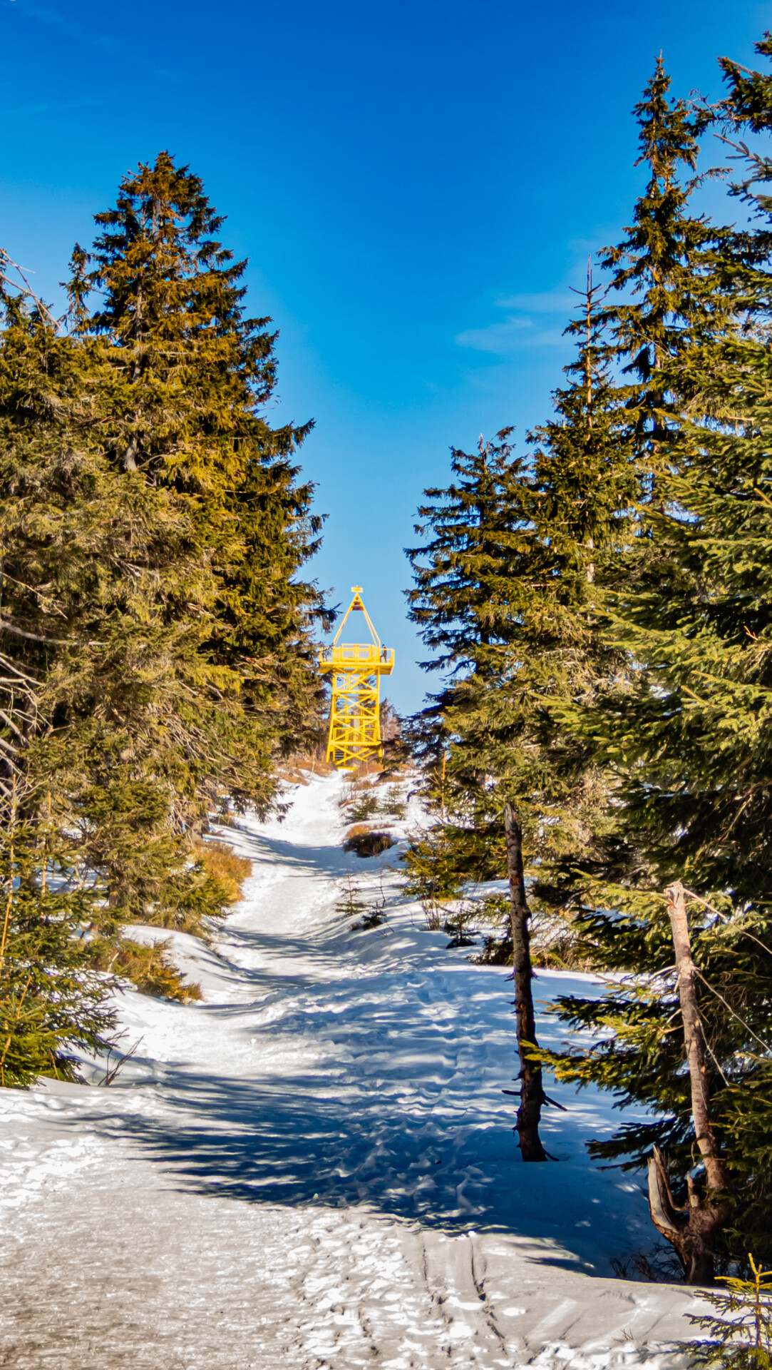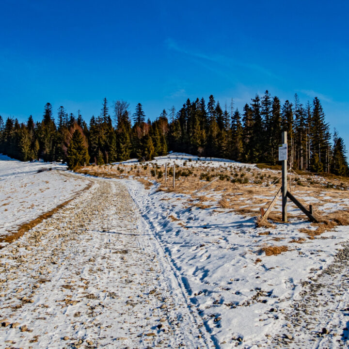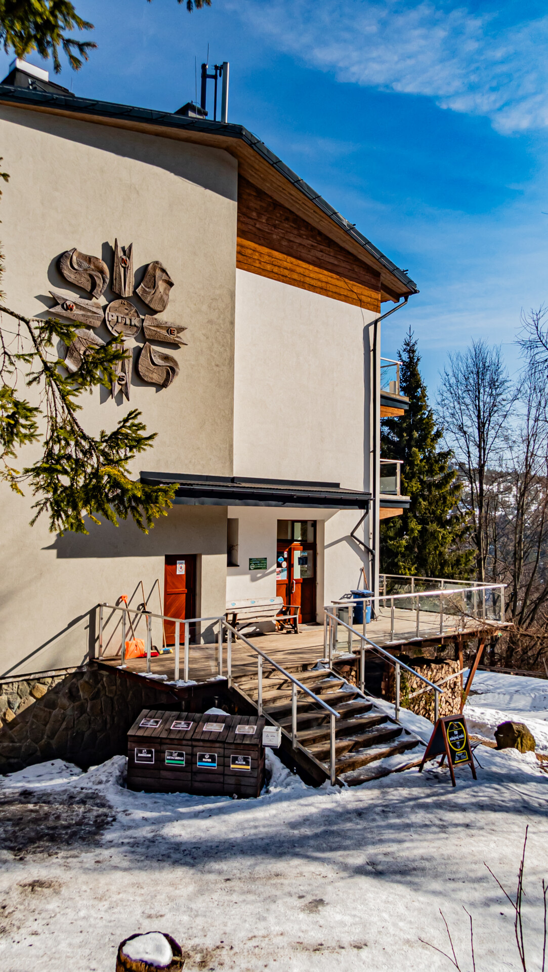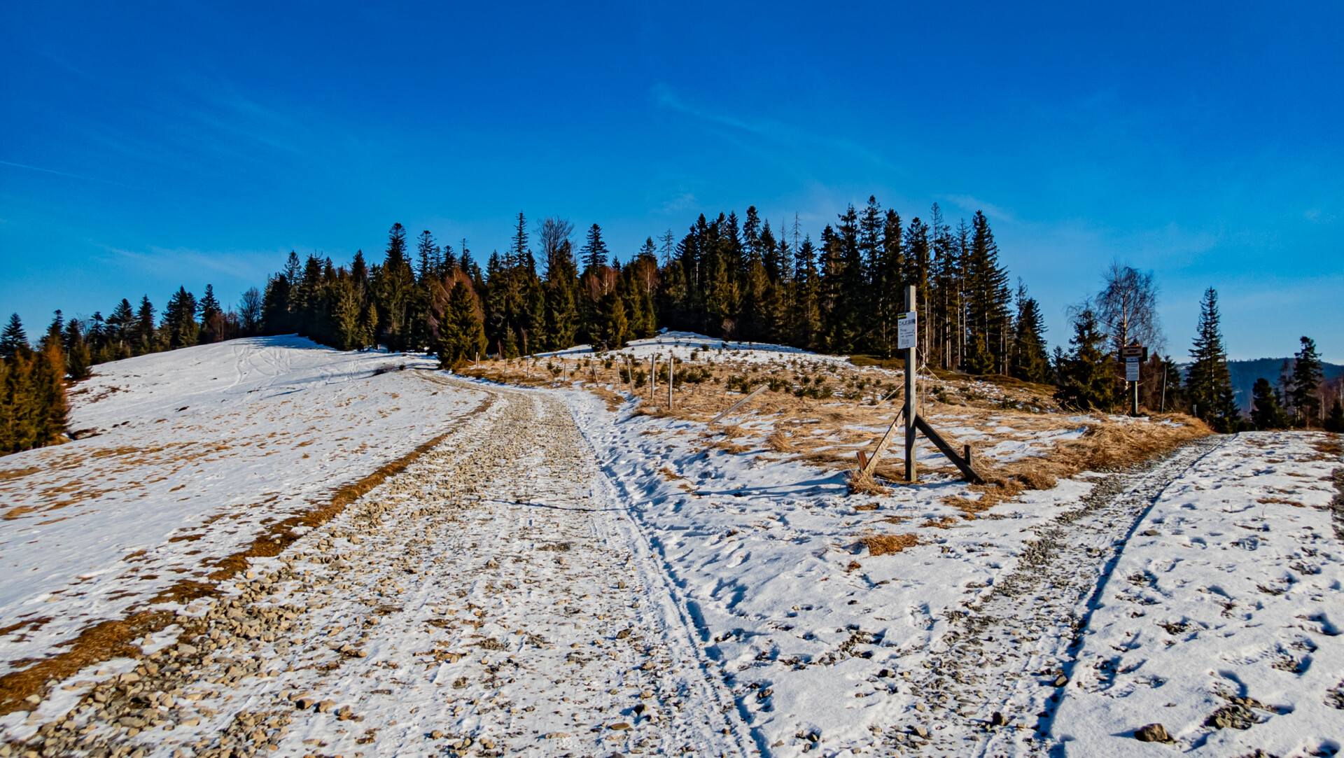 Mróz nie odpuszczał, a lodowaty wiatr na 15-metrowej, żółtej wieży widokowej wzmógł we mnie chęć na coś ciepłego. Dopisałem więc do trasy dodatkowe 5,6 km i 261 m przewyższenia – w dół i z powrotem w górę – żeby zjeść bardzo dobry żurek w schronisku PTTK na Przysłopie (dostępna pieczątka dla kolekcjonerów). Niestety, i tutaj czerwono-niebiesko-zielony szlak z Wierchu Równiańskiego był jednym wielkim lodowiskiem – trzeba było ratować się przetartym offroadem. Przeszkody spowalniały marsz i wymagały dodatkowego wysiłku. Ale pogoda wciąż dopisywała – słoneczko grzało, więc nie było na co narzekać.