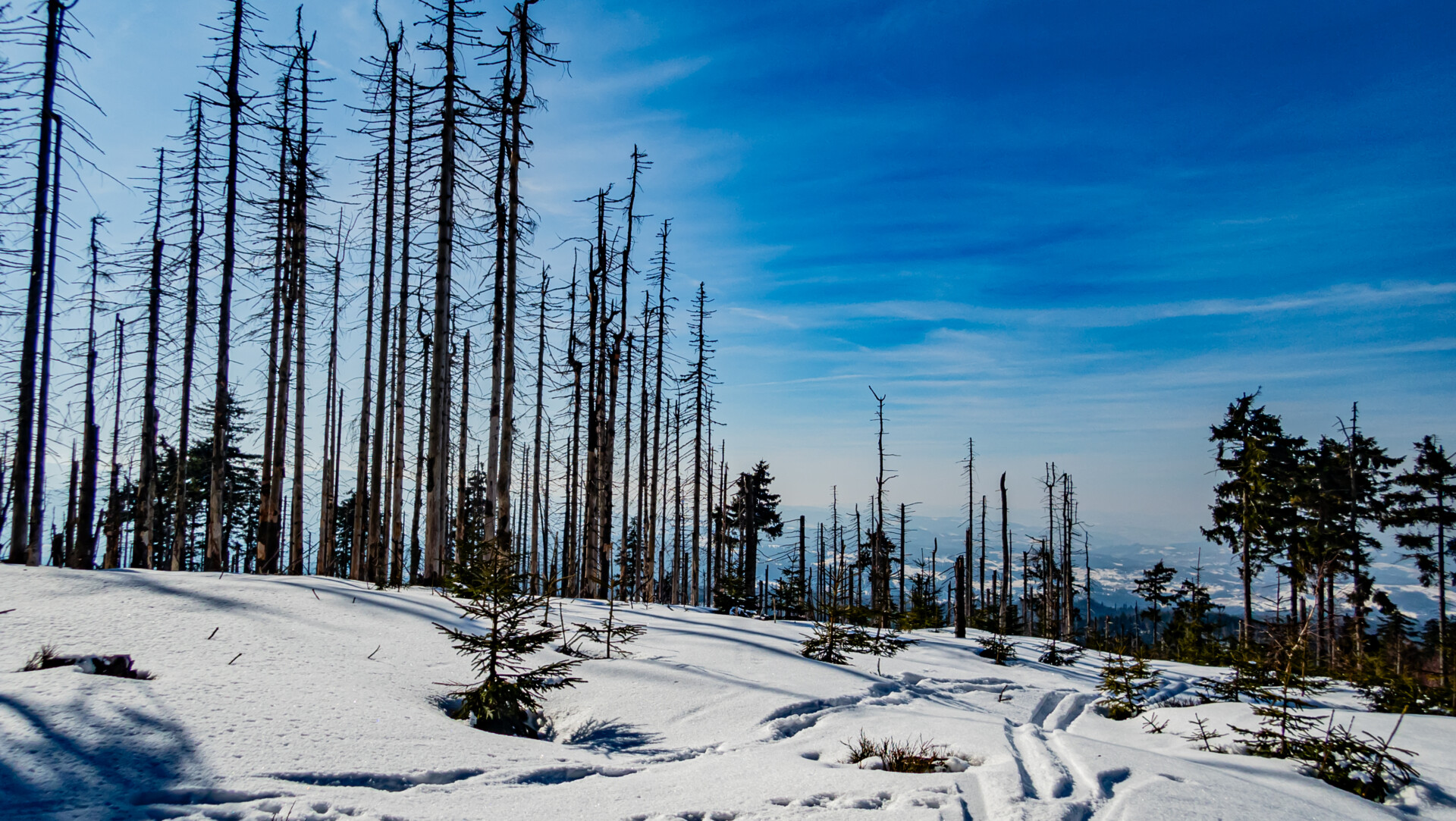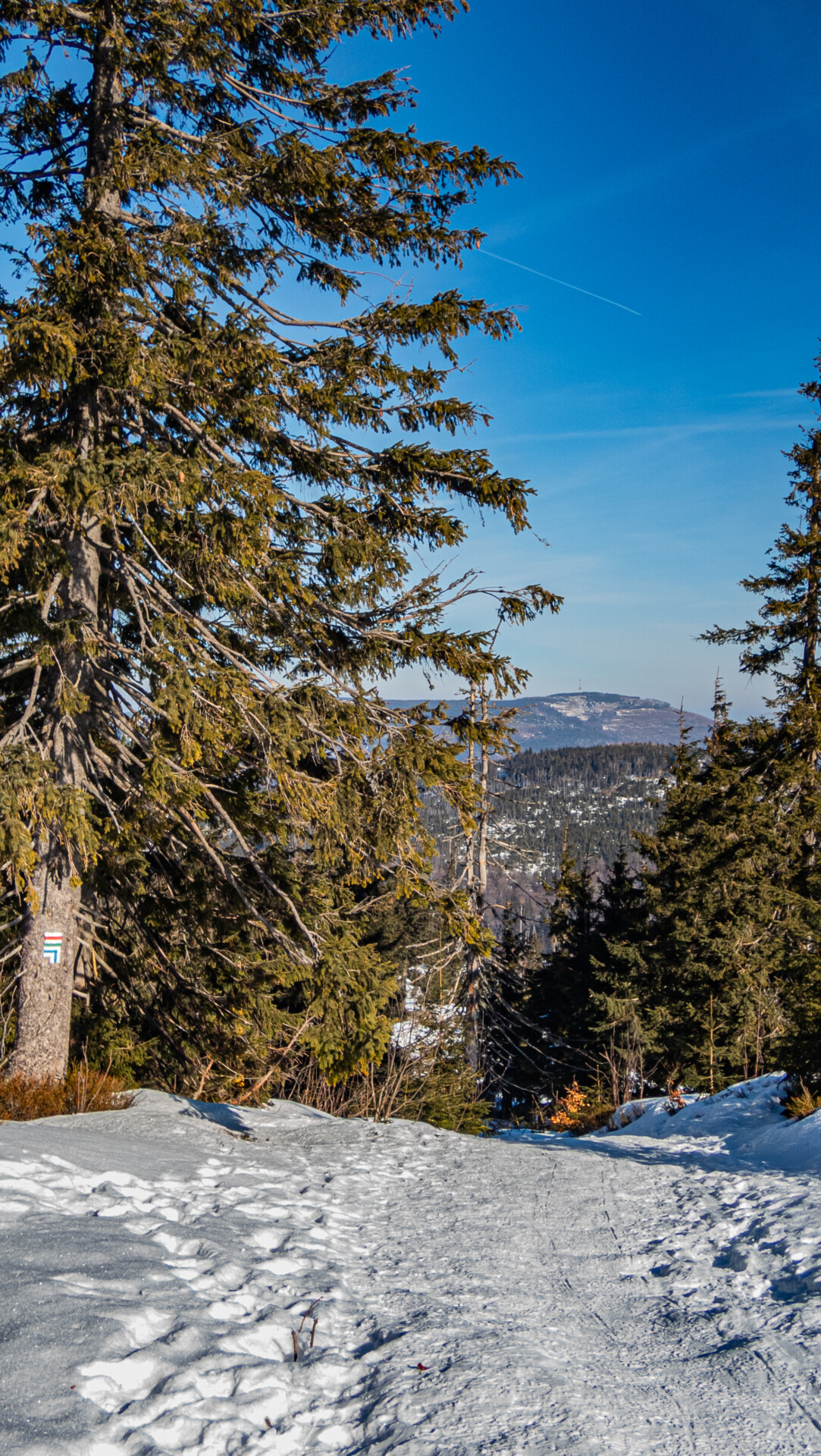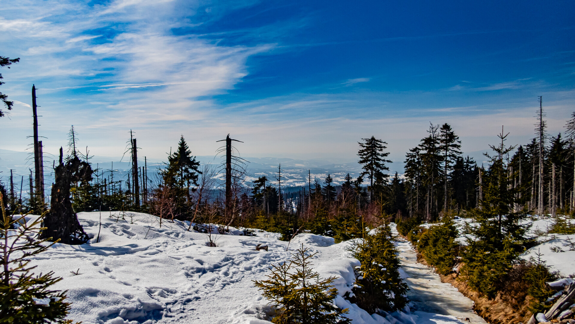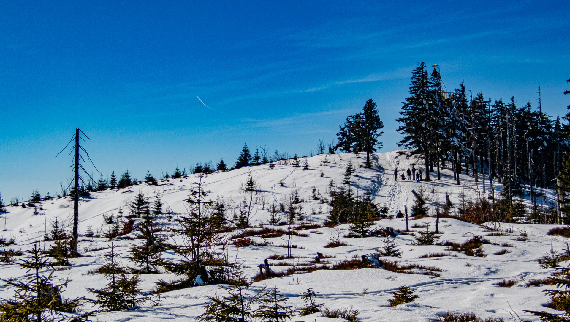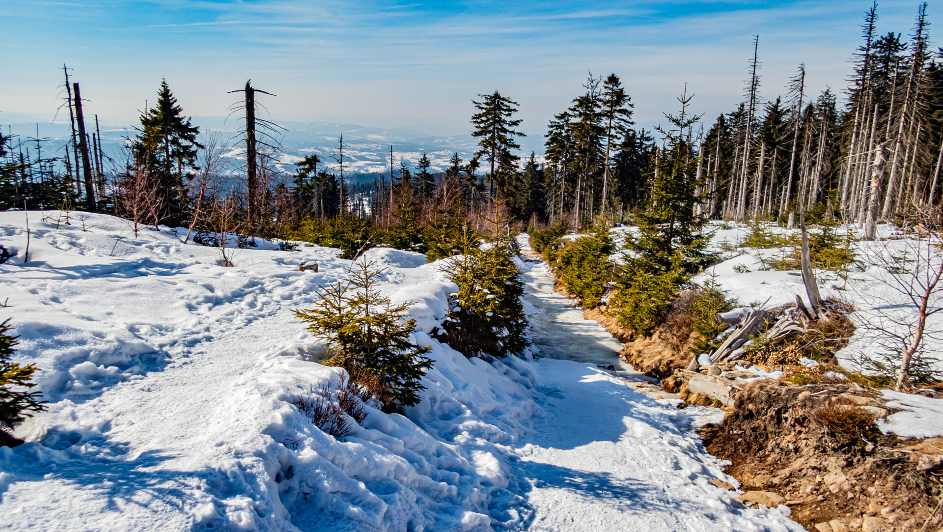 Mróz nie odpuszczał, a lodowaty wiatr na 15-metrowej, żółtej wieży widokowej wzmógł we mnie chęć na coś ciepłego. Dopisałem więc do trasy dodatkowe 5,6 km i 261 m przewyższenia – w dół i z powrotem w górę – żeby zjeść bardzo dobry żurek w schronisku PTTK na Przysłopie (dostępna pieczątka dla kolekcjonerów). Niestety, i tutaj czerwono-niebiesko-zielony szlak z Wierchu Równiańskiego był jednym wielkim lodowiskiem – trzeba było ratować się przetartym offroadem. Przeszkody spowalniały marsz i wymagały dodatkowego wysiłku. Ale pogoda wciąż dopisywała – słoneczko grzało, więc nie było na co narzekać.