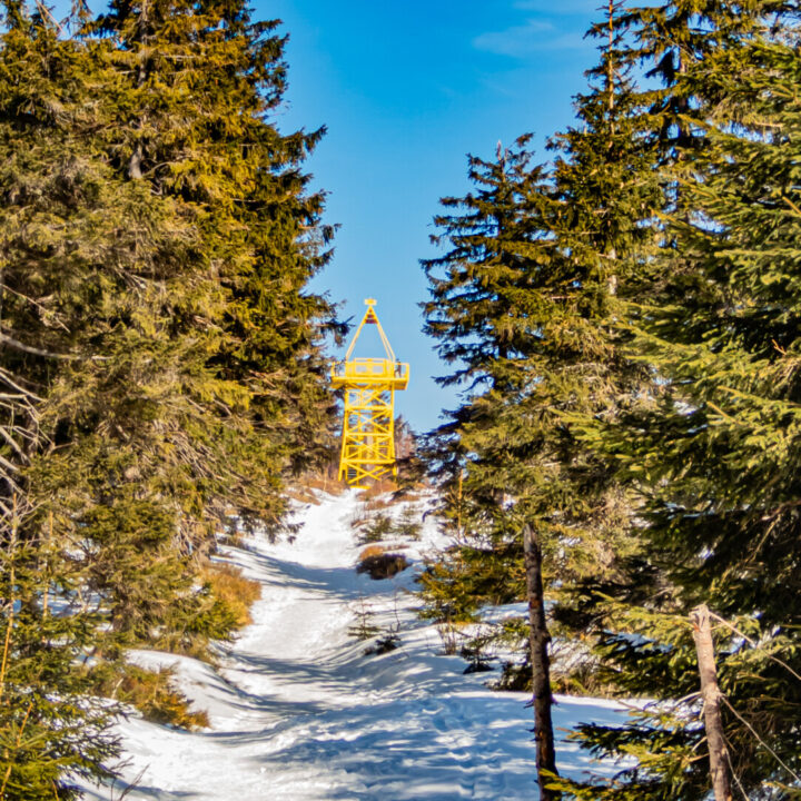 🔹 Ekspozycja: znikoma (3/10). W zasadzie brak realnej ekspozycji na trasie, jednak opcjonalne wejście na wieżę widokową i dostępna wychodnia skalna pod szczytem mogą wywołać chwilowy dyskomfort.