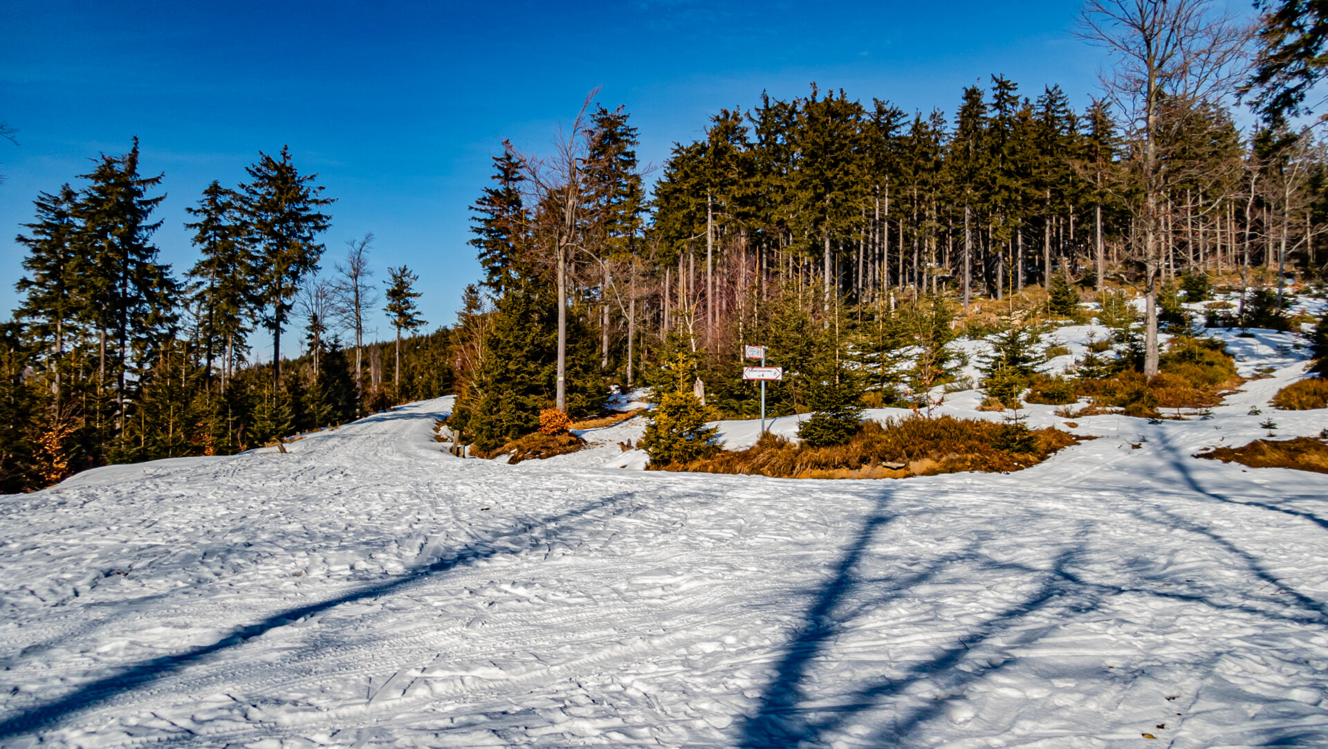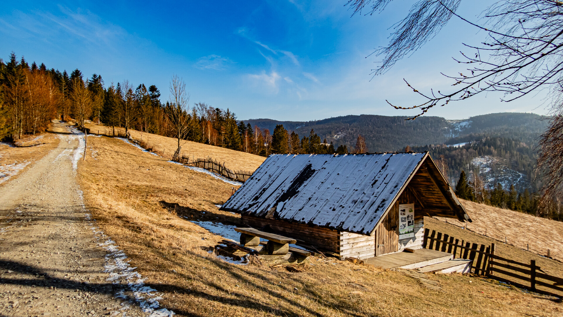 Żółty szlak prowadzi szeroką drogą przeciwpożarową, bardzo łagodnie opadając w stronę Cieńkowa. To blisko 5 km marszu – odcinek monotonny i dość czasochłonny. Po drodze minąłem Cieńków Wyszni i Cieńków Postrzedni (nawet nie wiem kiedy), aż dotarłem do rozległej polany nad Cieńkowem. Stąd rozpościerał się widok na zamarzniętą taflę Jeziora Czerniańskiego, błyszczącą w słońcu.