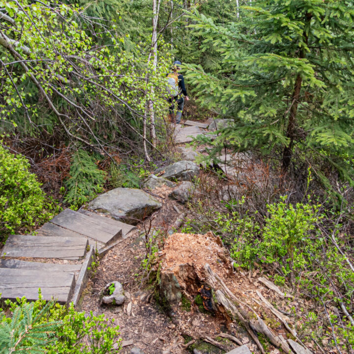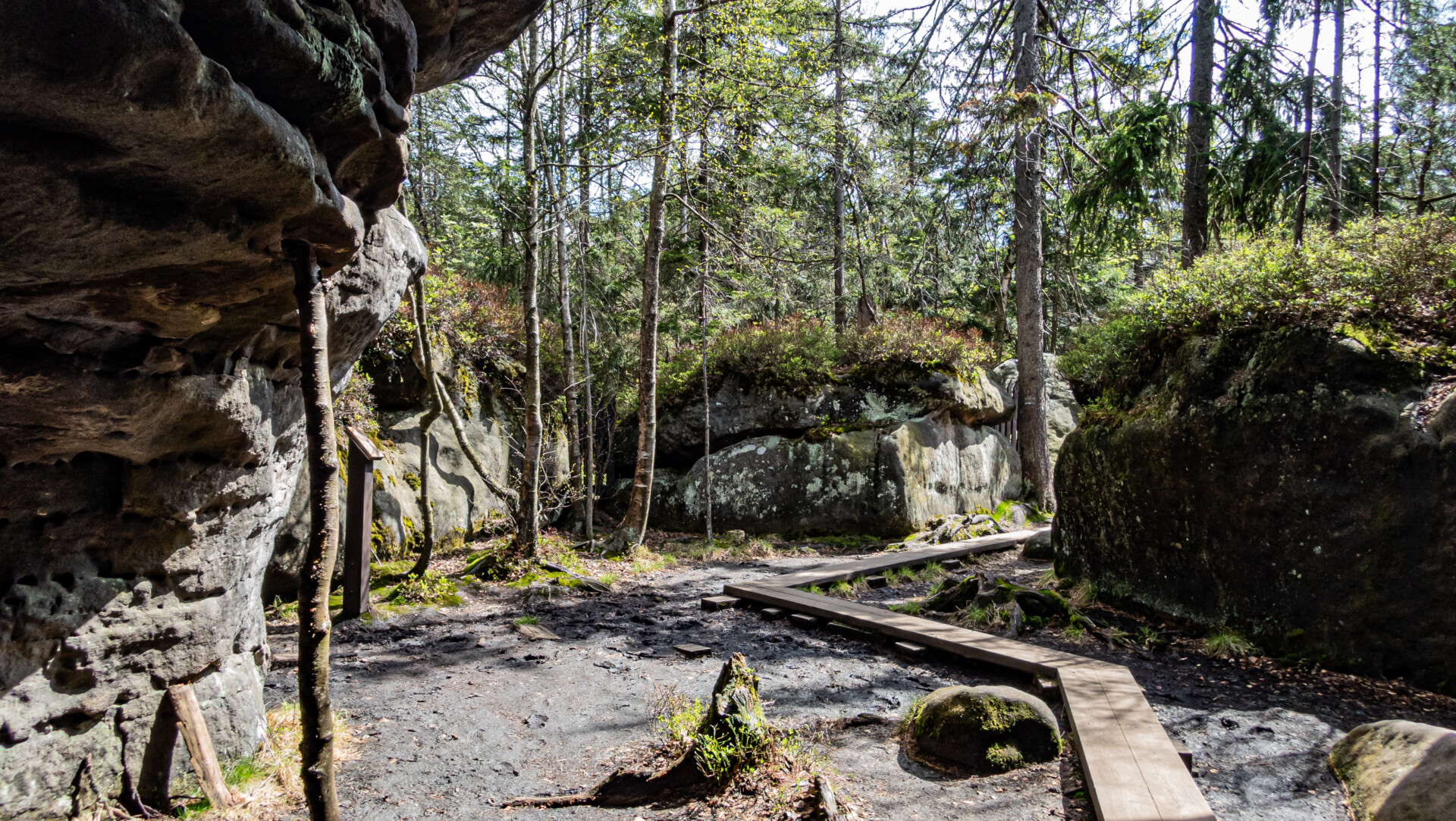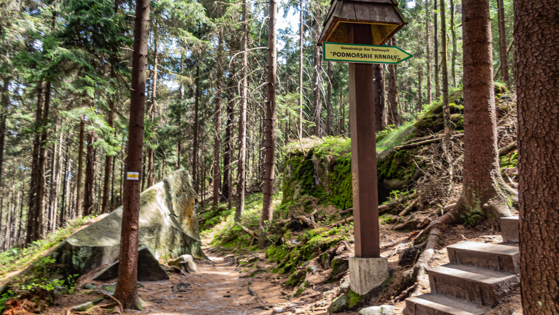 🔹 Trudności techniczne: niskie (3/10). Trasa jest krótka i dobrze utrzymana. Występuje kilka stromych podejść (np. do Wiszącej Skały czy Podmorskich Kanałów), ale ich długość nie przekracza kilkudziesięciu metrów. W miejscach skalnych mogą pojawić się wilgotne fragmenty, a wejścia na niektóre skały wymagają schylenia się lub pokonania niskich stopni terenowych.