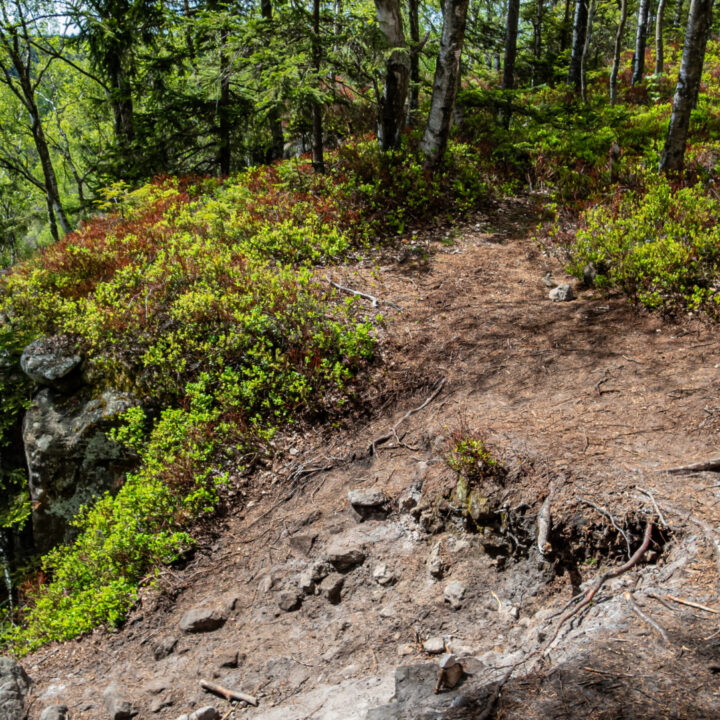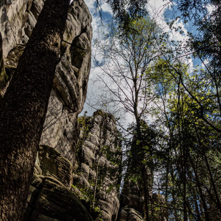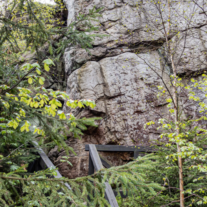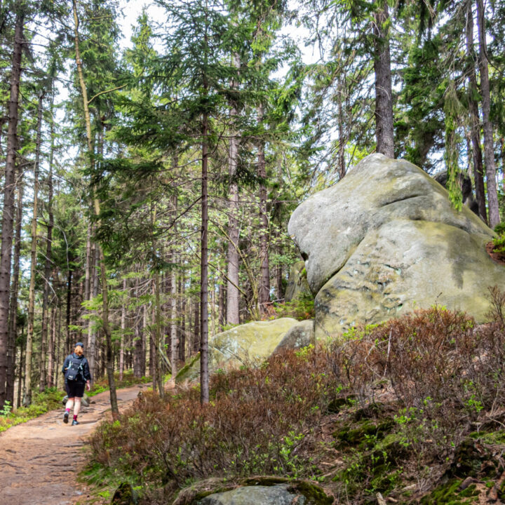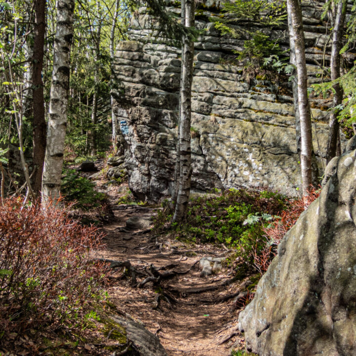 🔹 Ekspozycja: umiarkowana. Większość trasy prowadzi przez bezpieczne, leśne ścieżki i skalne zakamarki bez przepaści. Jednak dwa miejsca mogą budzić niepokój u osób z lękiem wysokości: punkt widokowy na Skałach Puchacza (urwisko bez barierek) oraz okolice Narożnika – zwłaszcza skalna półka z widokiem na Szczeliniec. W obu lokalizacjach występuje otwarta przestrzeń i brak zabezpieczeń.