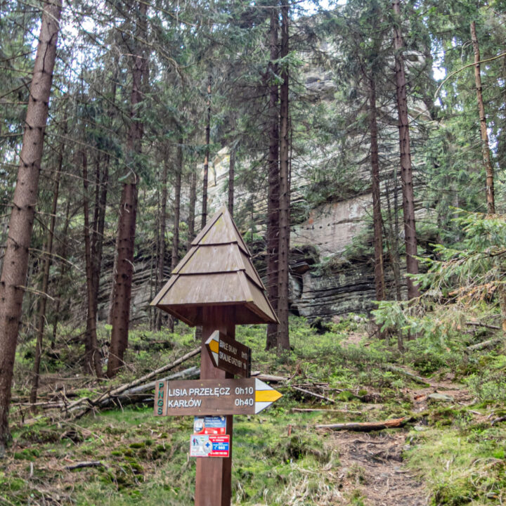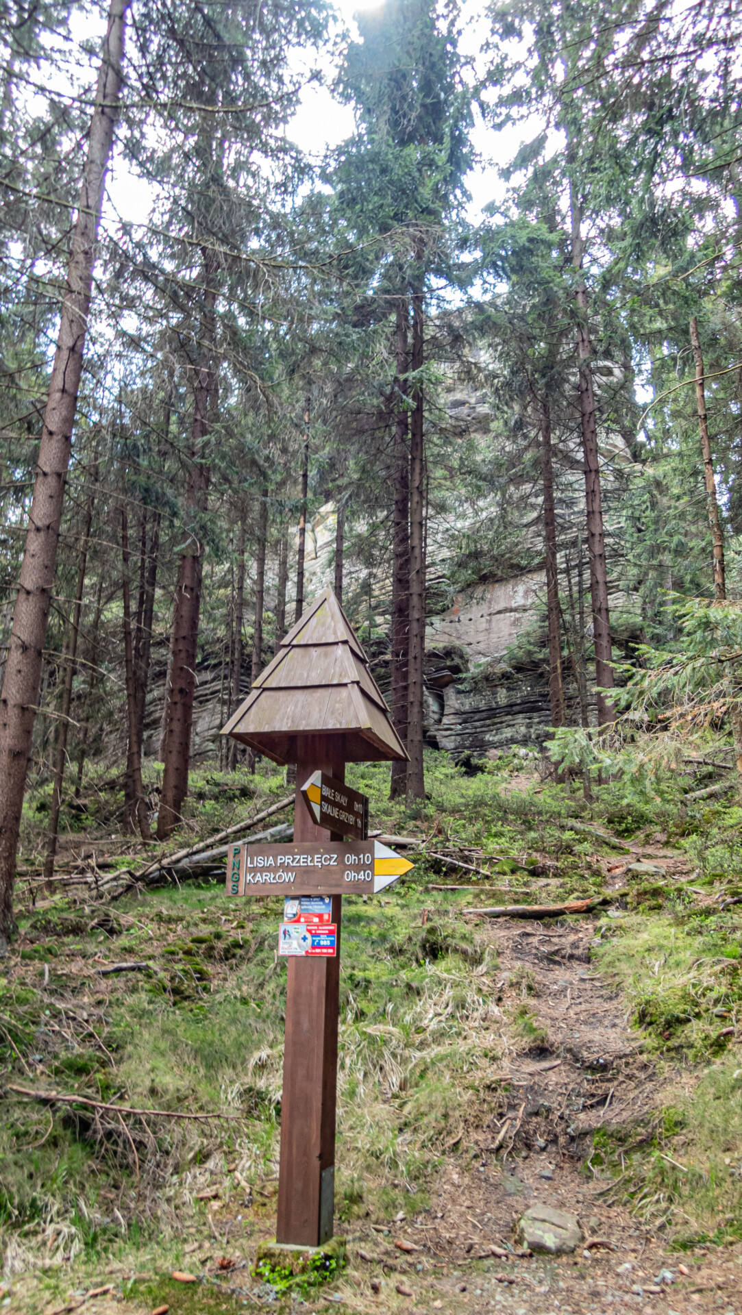 ☕ Schroniska i infrastruktura – Brak schronisk na trasie. Na Lisiej Przełęczy znajduje się tylko parking bez dodatkowej infrastruktury. Na całej pętli brak możliwości uzupełnienia wody lub zakupu posiłków – warto zabrać prowiant i termos. Tablice edukacyjne i opisy formacji skalnych dostępne w kilku punktach.