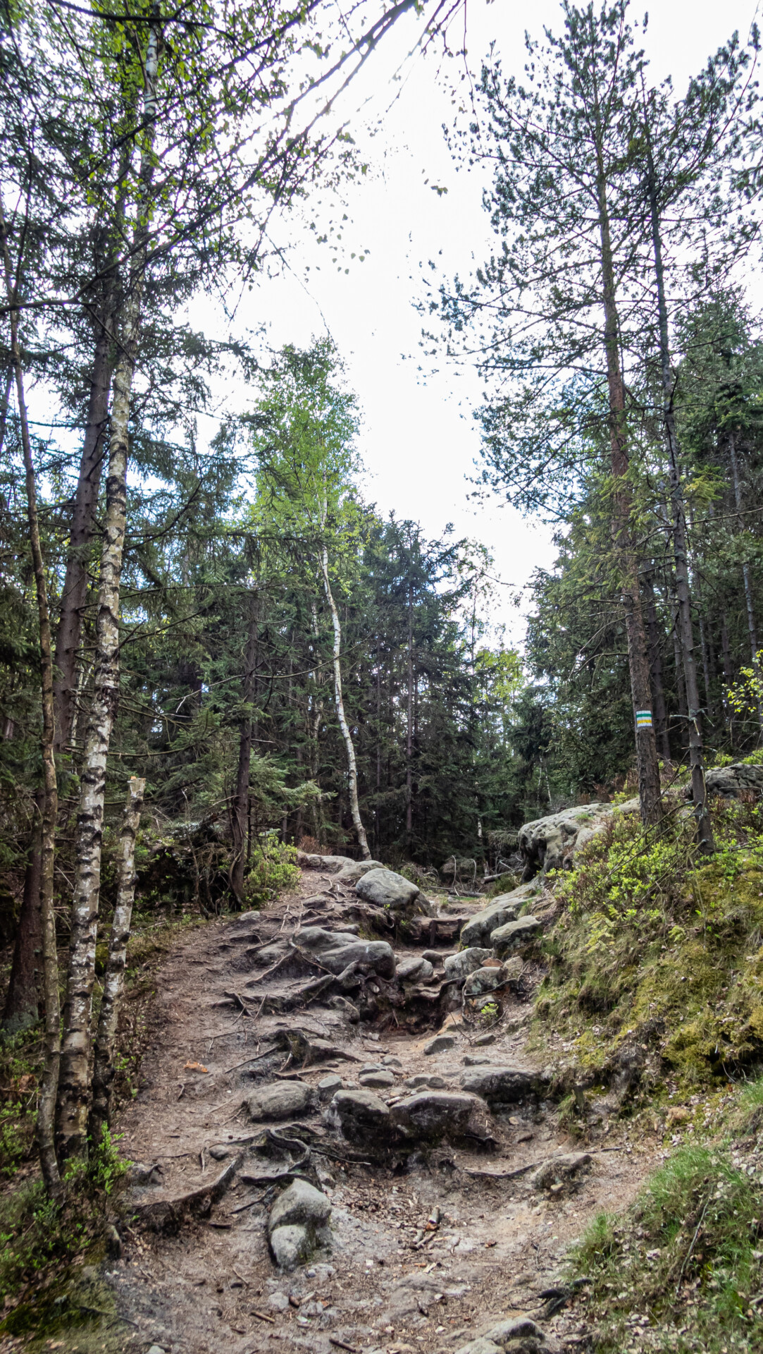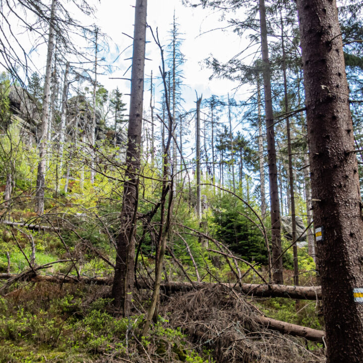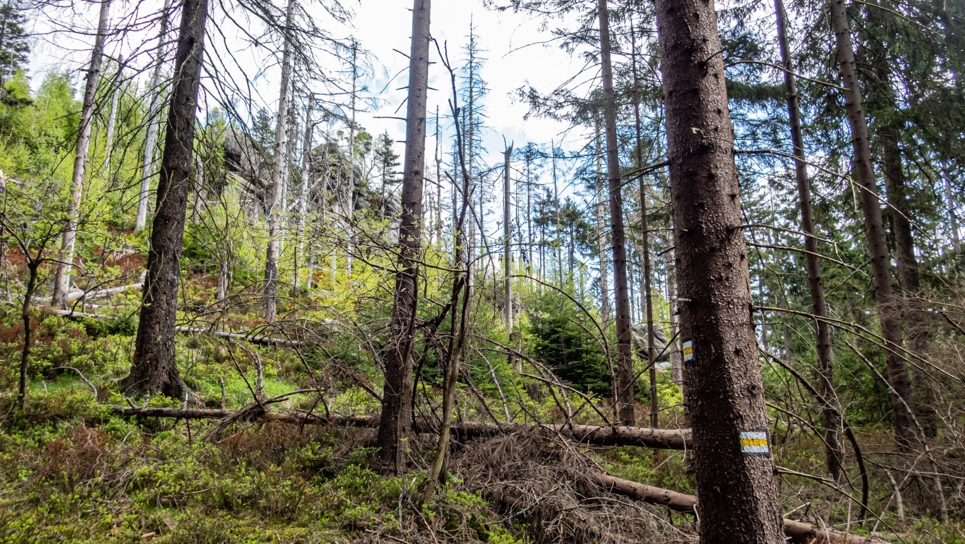 Dotychczas szlak był właściwie płaski (nie licząc odejść na skały) i przez kolejny kilometr nic się nie zmienia. Po drodze mijamy fragment świerkowej monokultury – osłabionej przez zmiany klimatu i inwazję kornika. To kolejna widoczna zmiana krajobrazu, która sprawia, że ta trasa się nie nudzi. Wygodną leśną ścieżką docieramy do Dylówki i odbijamy z żółtego na zielony, w stronę Skał Puchacza.