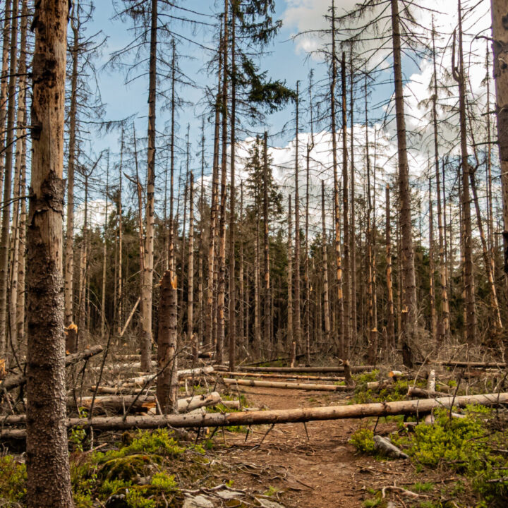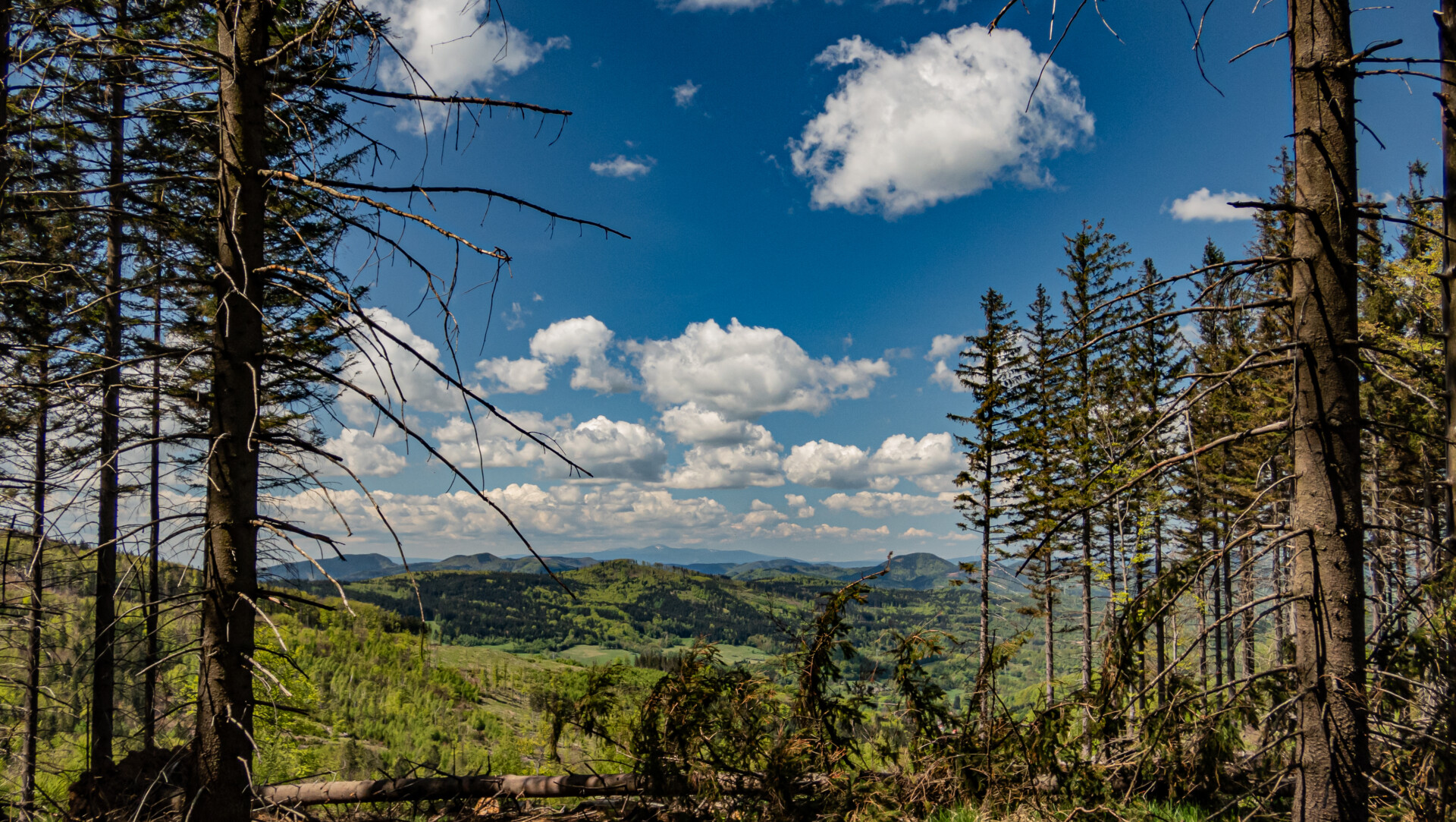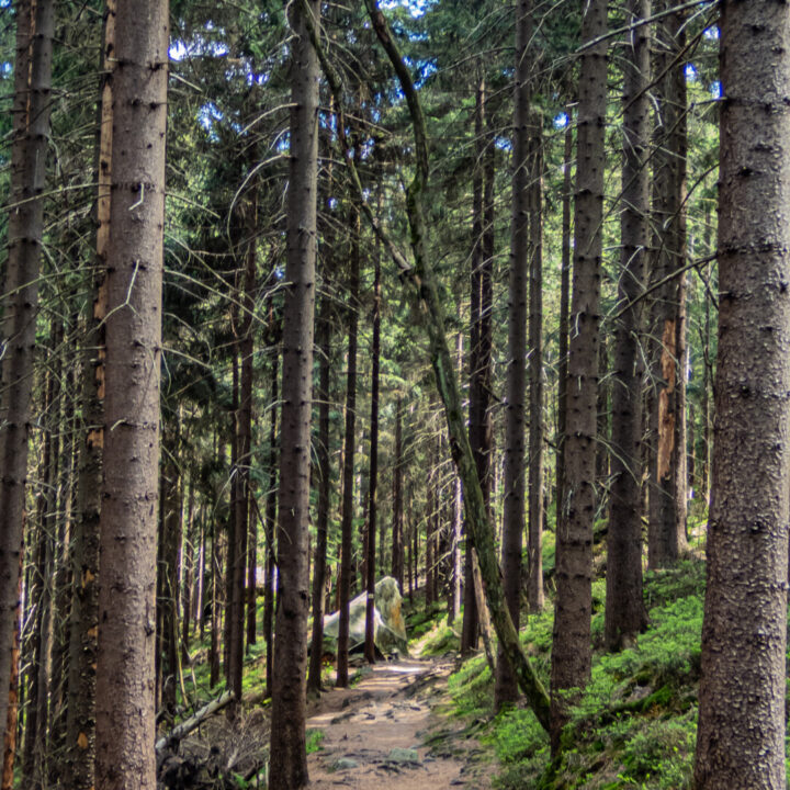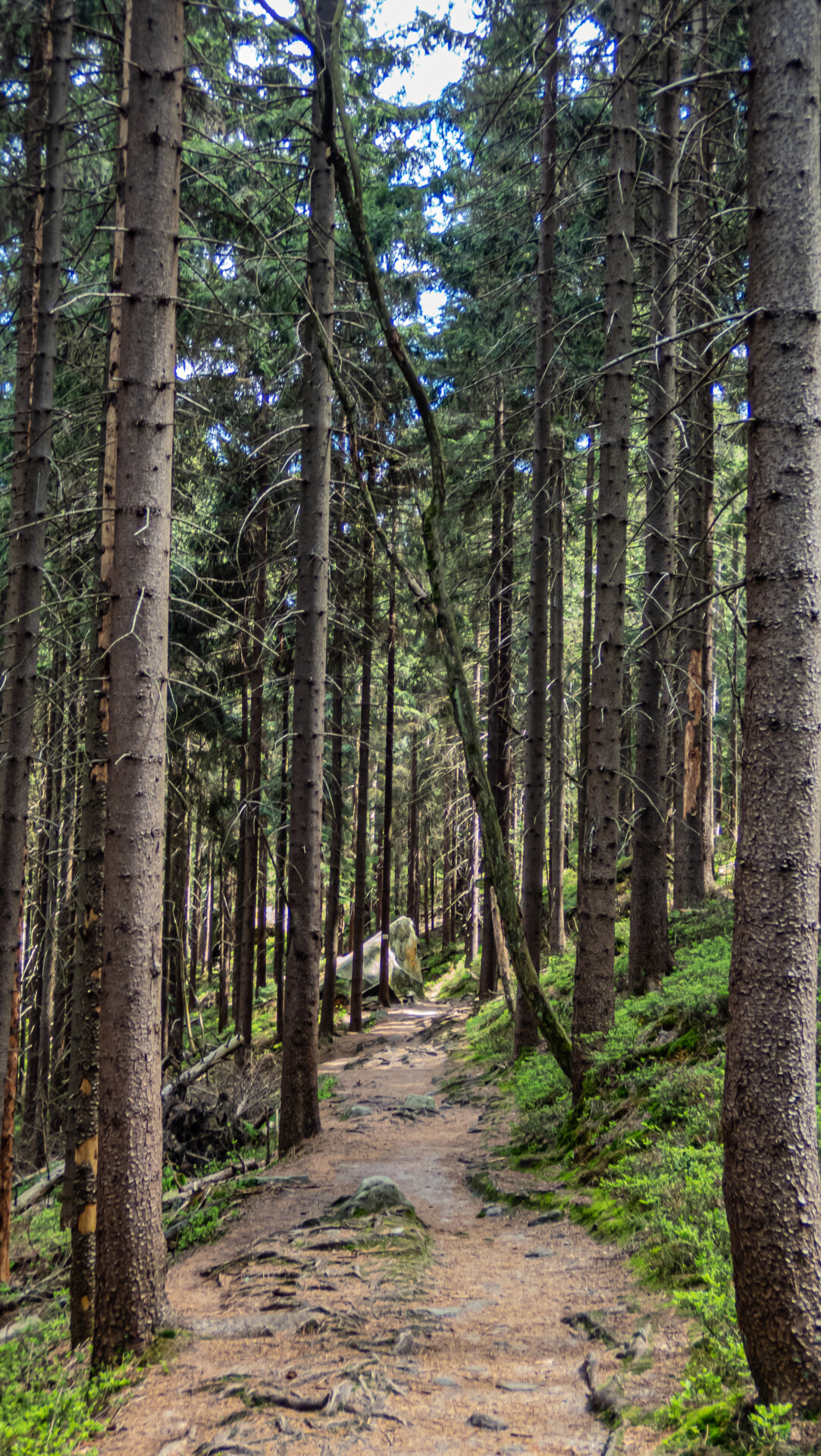 Dotychczas szlak był właściwie płaski (nie licząc odejść na skały) i przez kolejny kilometr nic się nie zmienia. Po drodze mijamy fragment świerkowej monokultury – osłabionej przez zmiany klimatu i inwazję kornika. To kolejna widoczna zmiana krajobrazu, która sprawia, że ta trasa się nie nudzi. Wygodną leśną ścieżką docieramy do Dylówki i odbijamy z żółtego na zielony, w stronę Skał Puchacza.