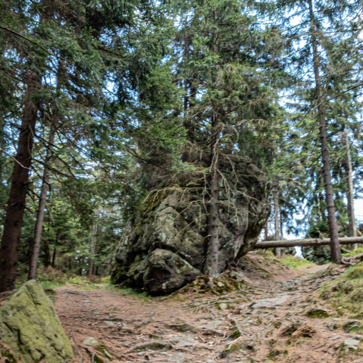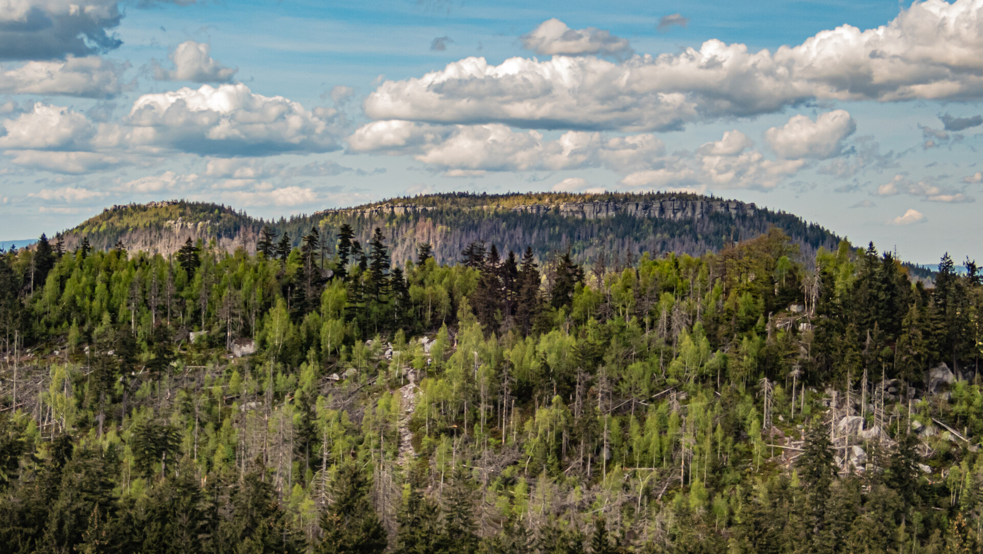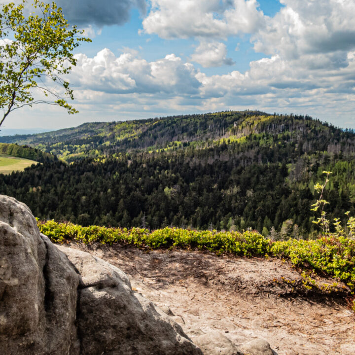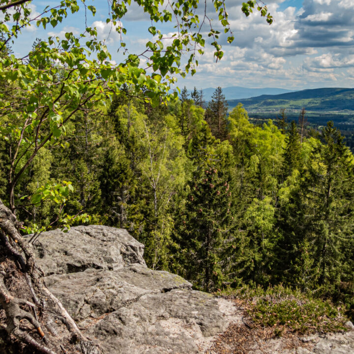 🌄 Widoki – Najciekawsze panoramy z Skał Puchacza i Narożnika – na Góry Bystrzyckie, Orlickie, Masyw Śnieżnika i Ziemię Kłodzką. Po drodze wiele charakterystycznych formacji: As Atu, Zielony Król, Skalna Czaszka, a także relikty dawnego torfowiska z kładką widokową. Trasa oferuje nie tylko skalne atrakcje, ale też ciekawe zmiany środowisk: świerkowe monokultury, torfowiska, lasy mieszane i otwarte punkty widokowe.
