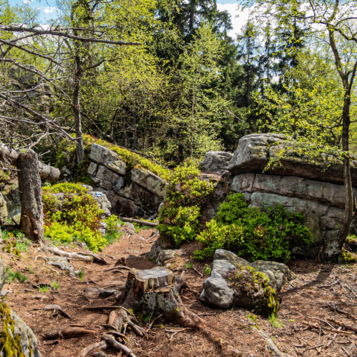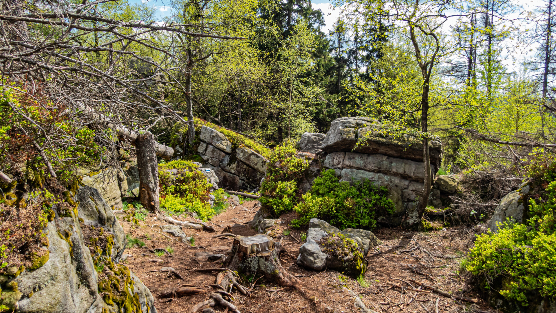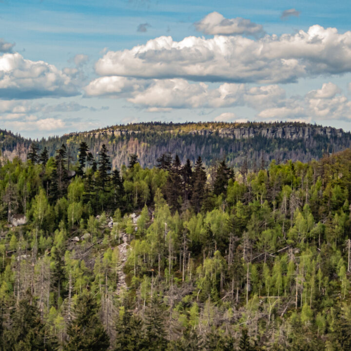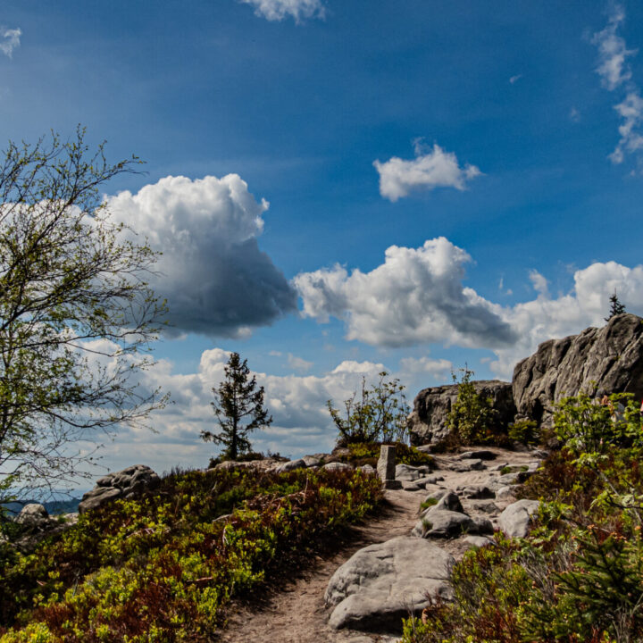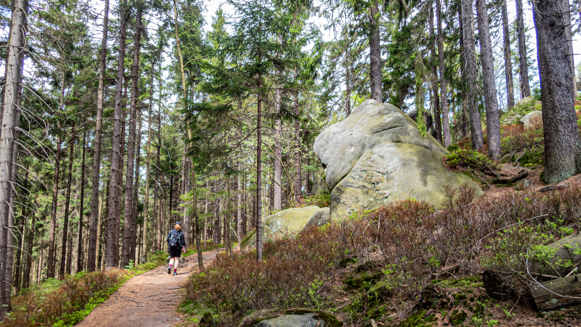 🌄 Widoki – Najciekawsze panoramy z Skał Puchacza i Narożnika – na Góry Bystrzyckie, Orlickie, Masyw Śnieżnika i Ziemię Kłodzką. Po drodze wiele charakterystycznych formacji: As Atu, Zielony Król, Skalna Czaszka, a także relikty dawnego torfowiska z kładką widokową. Trasa oferuje nie tylko skalne atrakcje, ale też ciekawe zmiany środowisk: świerkowe monokultury, torfowiska, lasy mieszane i otwarte punkty widokowe.