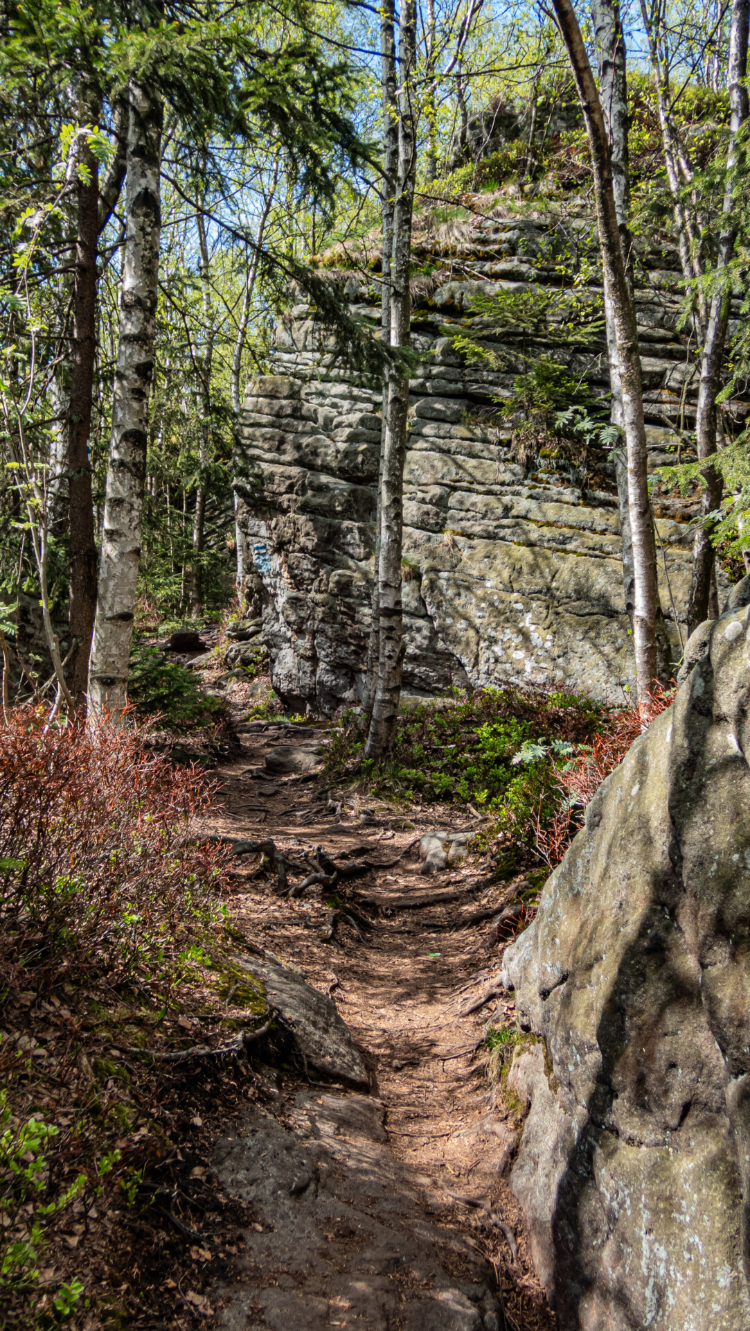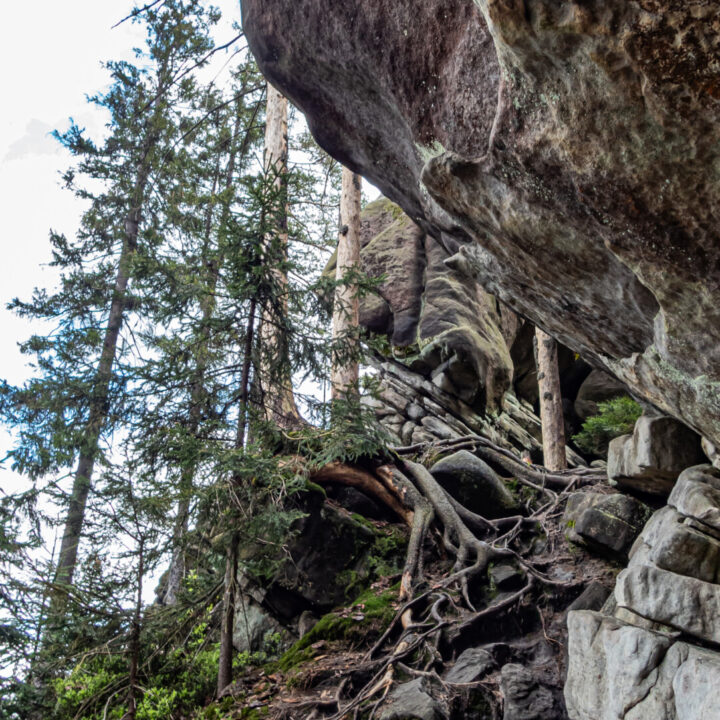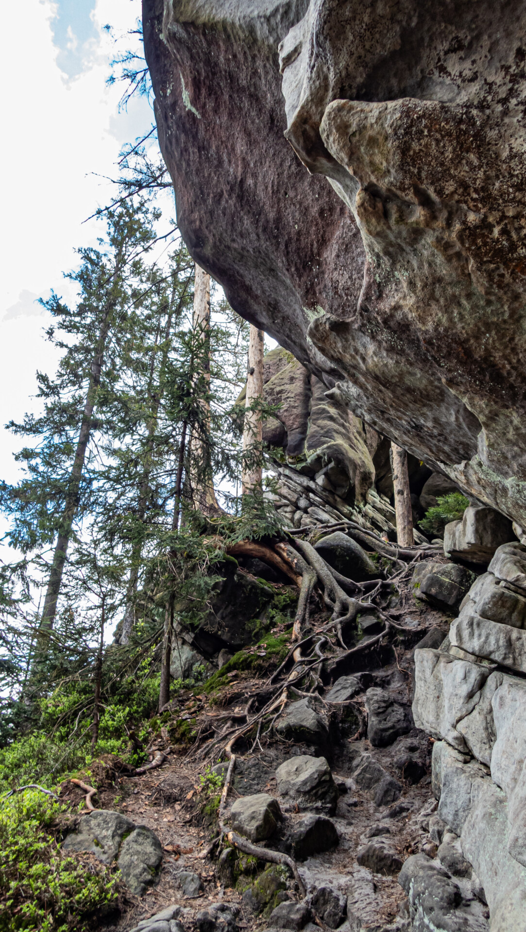 Rozpoczęliśmy wędrówkę od darmowego leśnego parkingu na Lisiej Przełęczy, tuż przy żółtym szlaku. Jakimś cudem były jeszcze wolne miejsca – choć parking jest niewielki, udało się zaparkować przed 13. Już po 200 metrach natknęliśmy się na pierwszy drogowskaz – na Wiszącą Skałę. Trzeba pokonać ok. 60 metrów stromych betonowych schodów, żeby tam dotrzeć. Skała może i specjalnie „nie wisi”, a miejsca nie ma tam zbyt wiele, ale sama świadomość, że stoimy w miejscu, gdzie miliony lat temu znajdowała się zatoka czeskiego morza kredowego, działa na wyobraźnię.