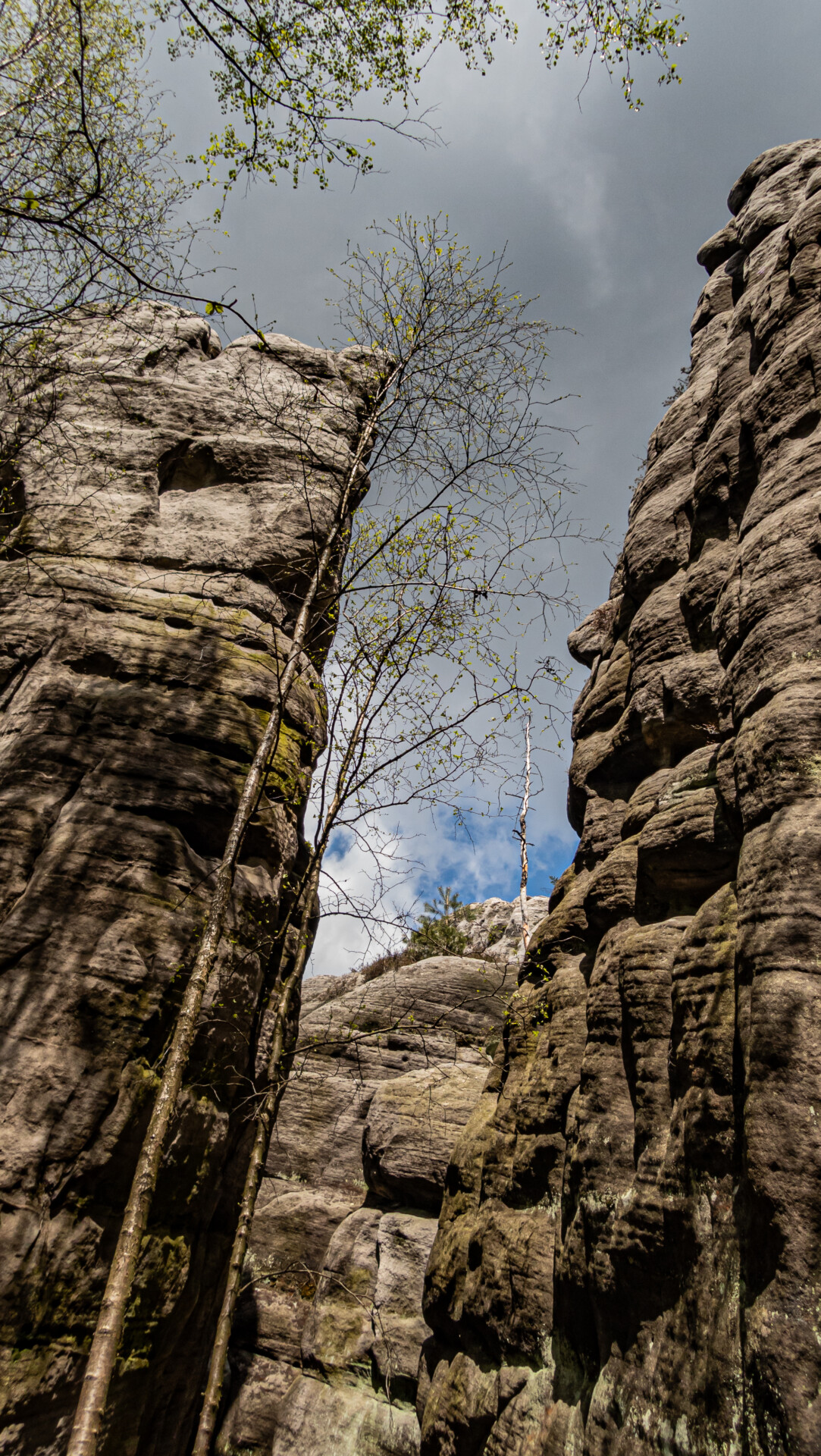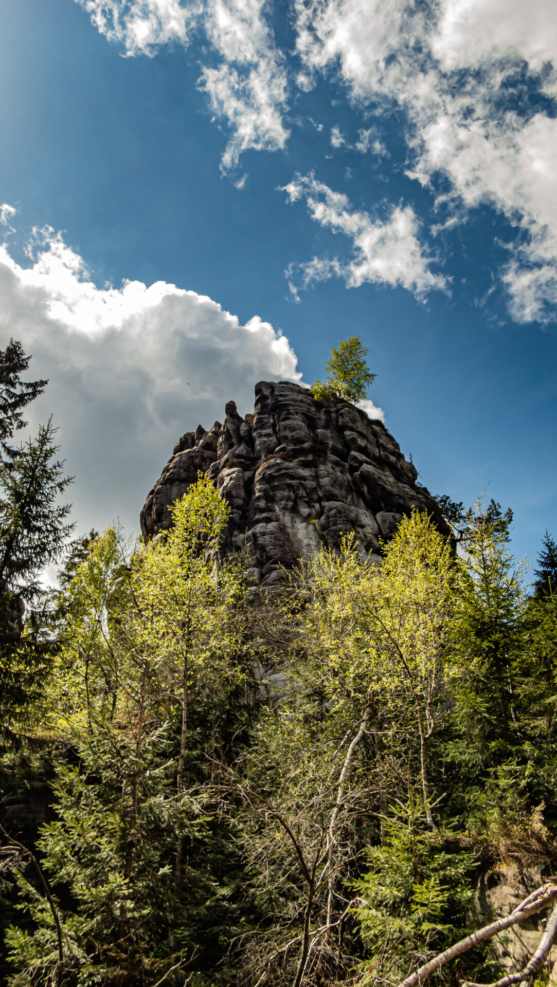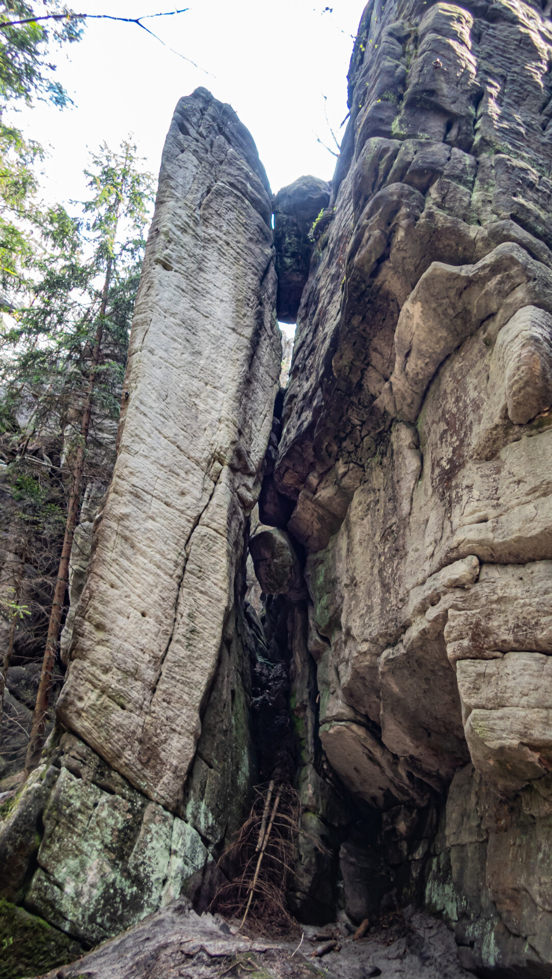Rozpoczęliśmy wędrówkę od darmowego leśnego parkingu na Lisiej Przełęczy, tuż przy żółtym szlaku. Jakimś cudem były jeszcze wolne miejsca – choć parking jest niewielki, udało się zaparkować przed 13. Już po 200 metrach natknęliśmy się na pierwszy drogowskaz – na Wiszącą Skałę. Trzeba pokonać ok. 60 metrów stromych betonowych schodów, żeby tam dotrzeć. Skała może i specjalnie „nie wisi”, a miejsca nie ma tam zbyt wiele, ale sama świadomość, że stoimy w miejscu, gdzie miliony lat temu znajdowała się zatoka czeskiego morza kredowego, działa na wyobraźnię.