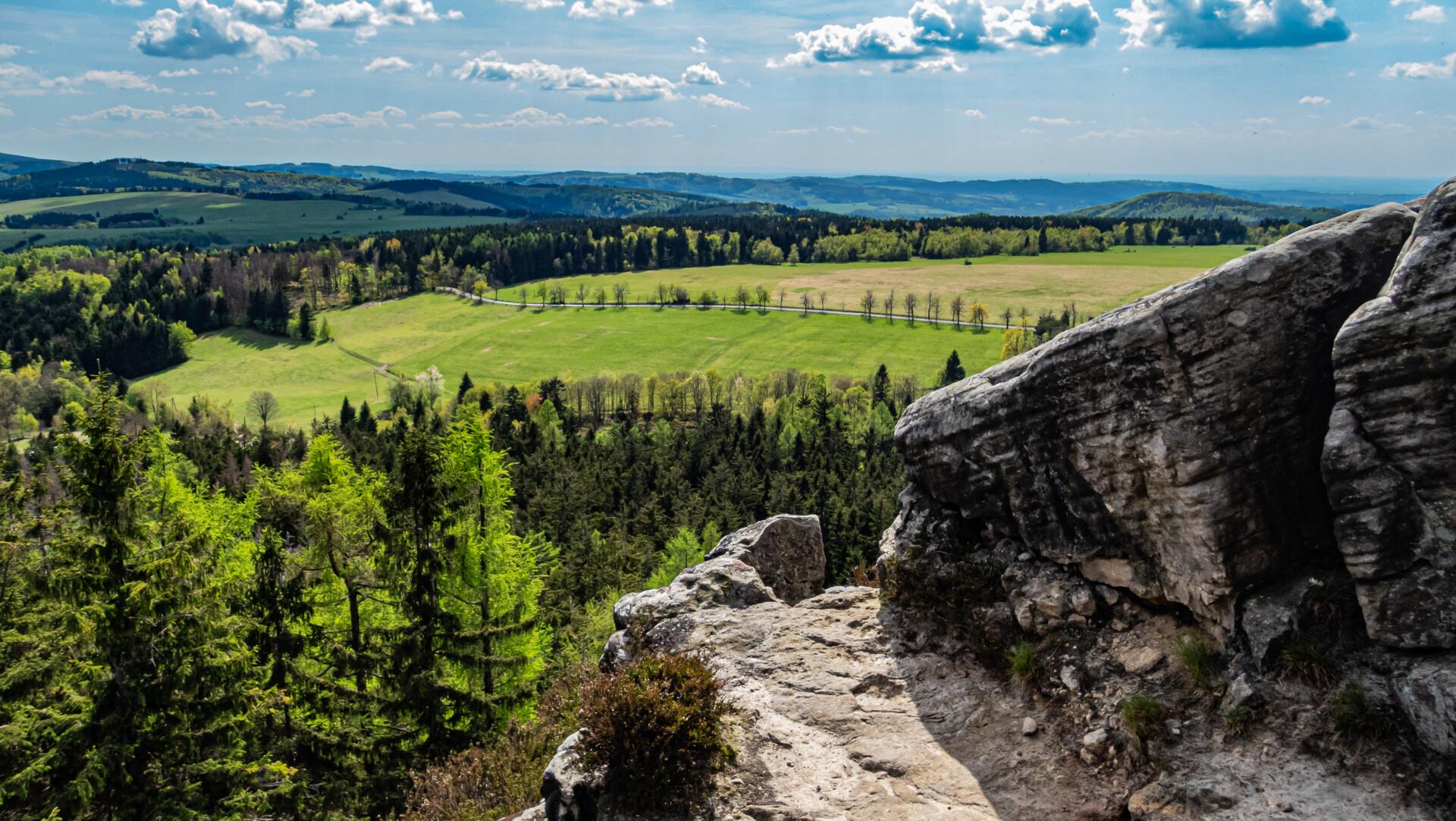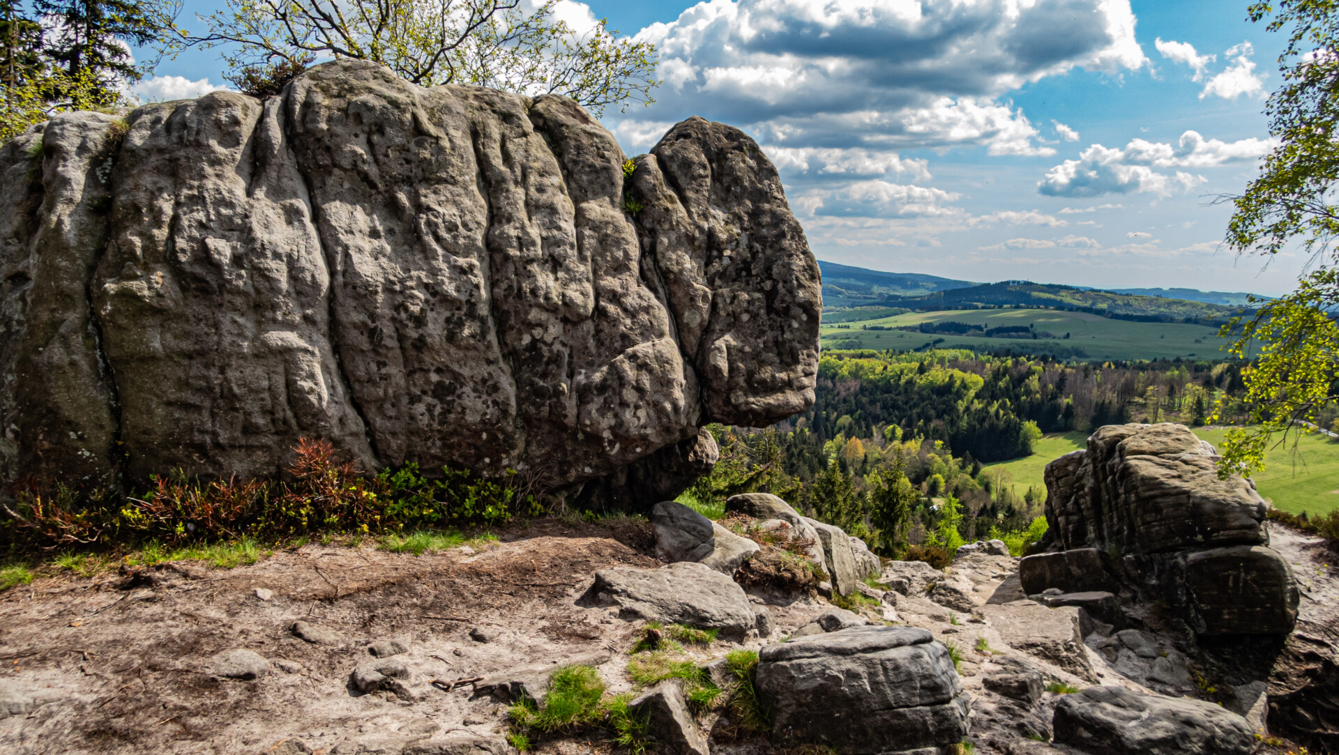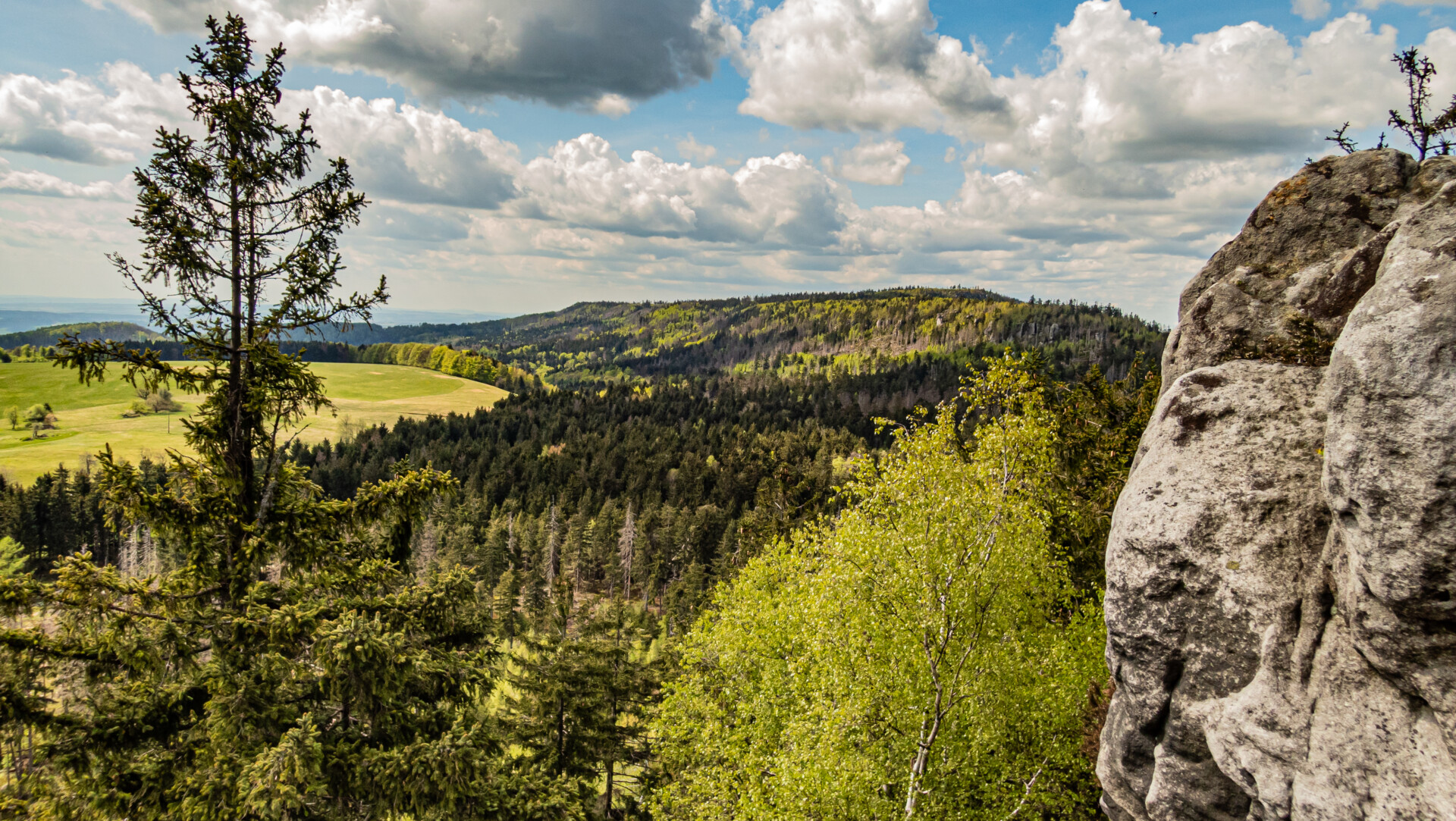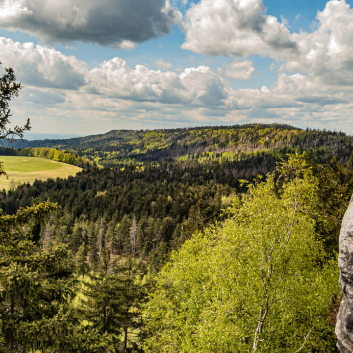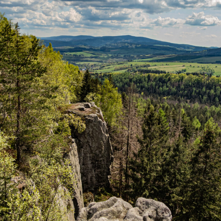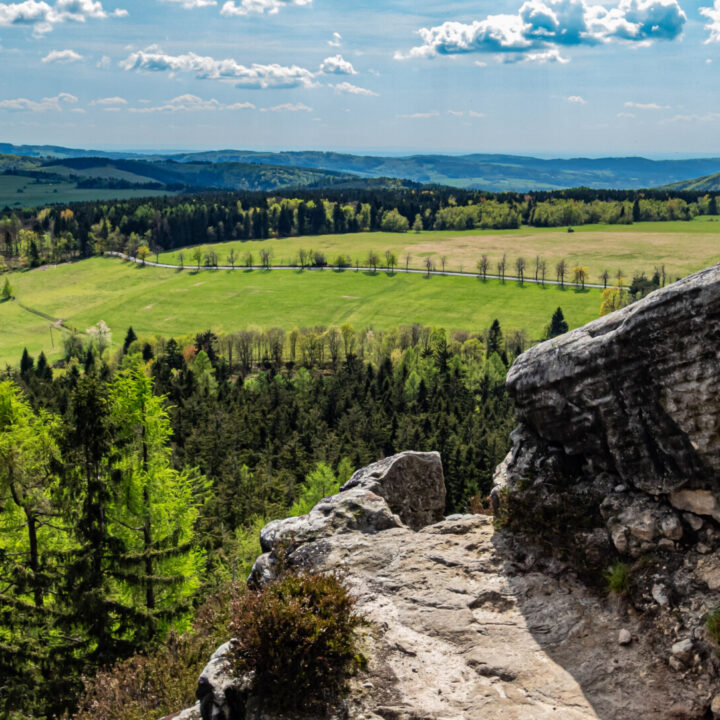 Kilka kroków dalej zmieniamy szlak zielony na niebieski i docieramy do Skał Puchacza. To urwisko powstało w wyniku eksploatacji piaskowca – kamieniołom działał od XIX wieku aż po czasy powojenne. Rozpościera się stąd piękny widok na Góry Bystrzyckie, Orlickie, a także na pobliskie łąki, pastwiska i lesiste wzniesienia. Choć urwisko ma kilkadziesiąt metrów wysokości i nie jest niczym osłonięte, nie odczuwałem typowego dla siebie lęku wysokości. Może to kwestia braku ludzi, może świetnej pogody – w każdym razie mogłem podejść do krawędzi i zrobić kilka zdjęć bez stresu.