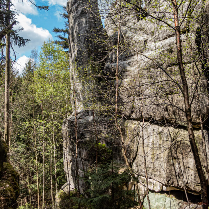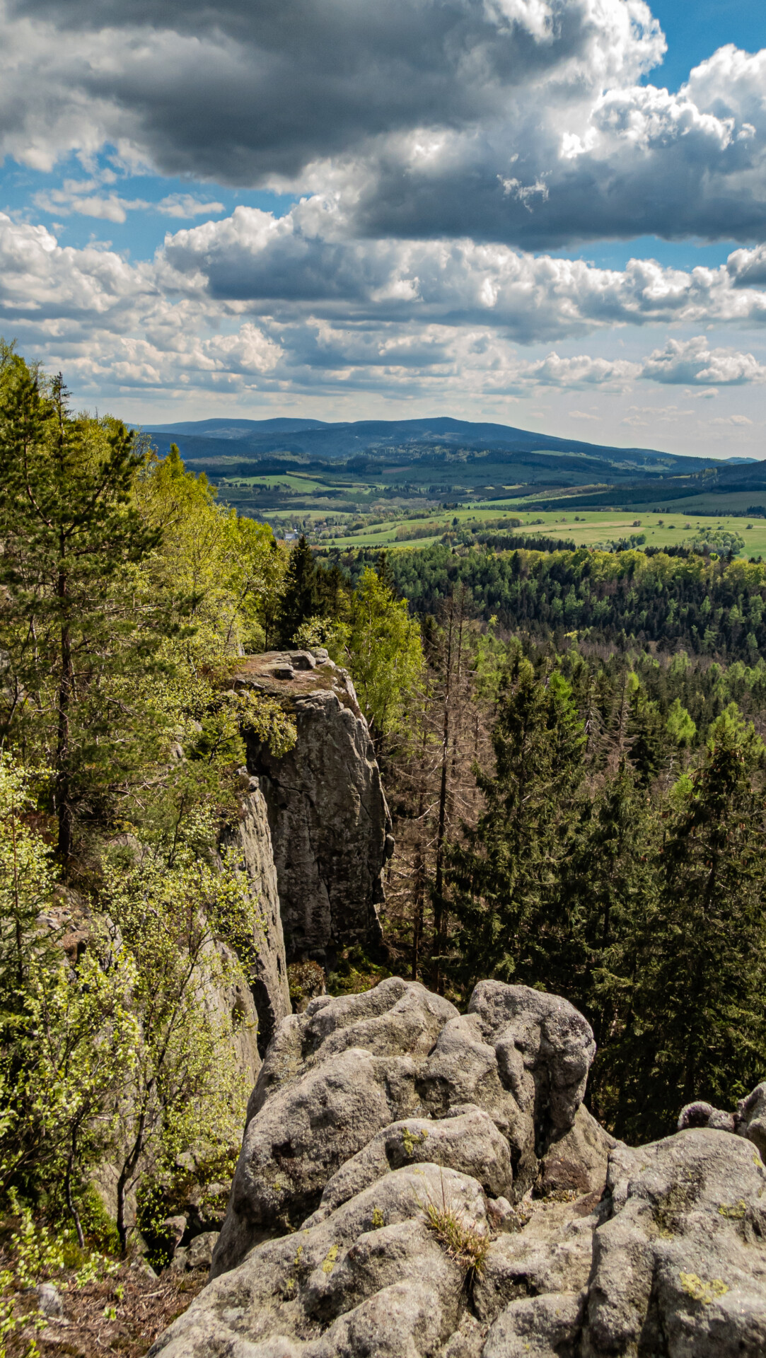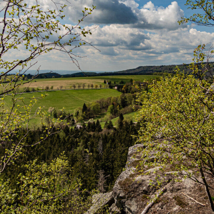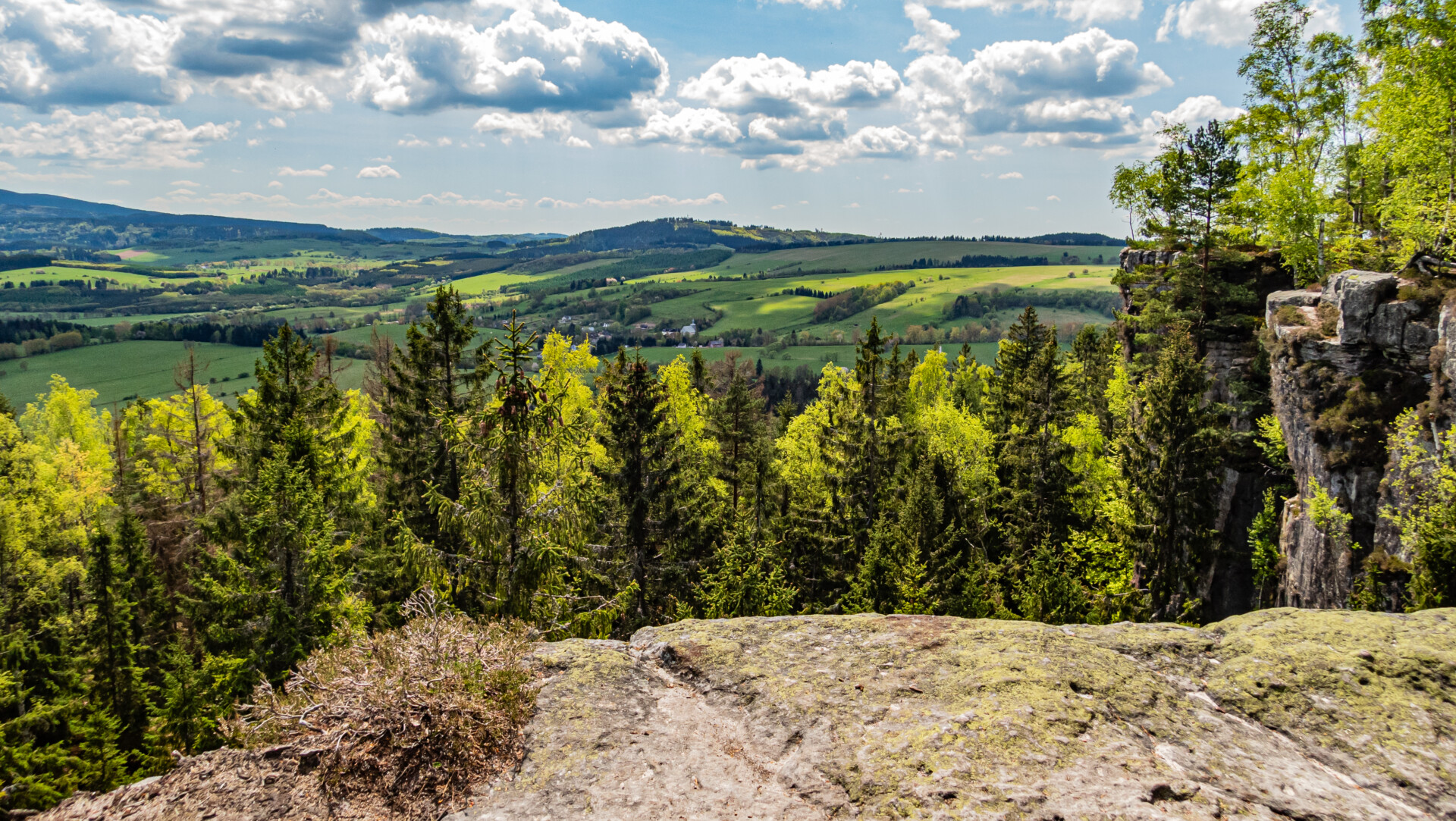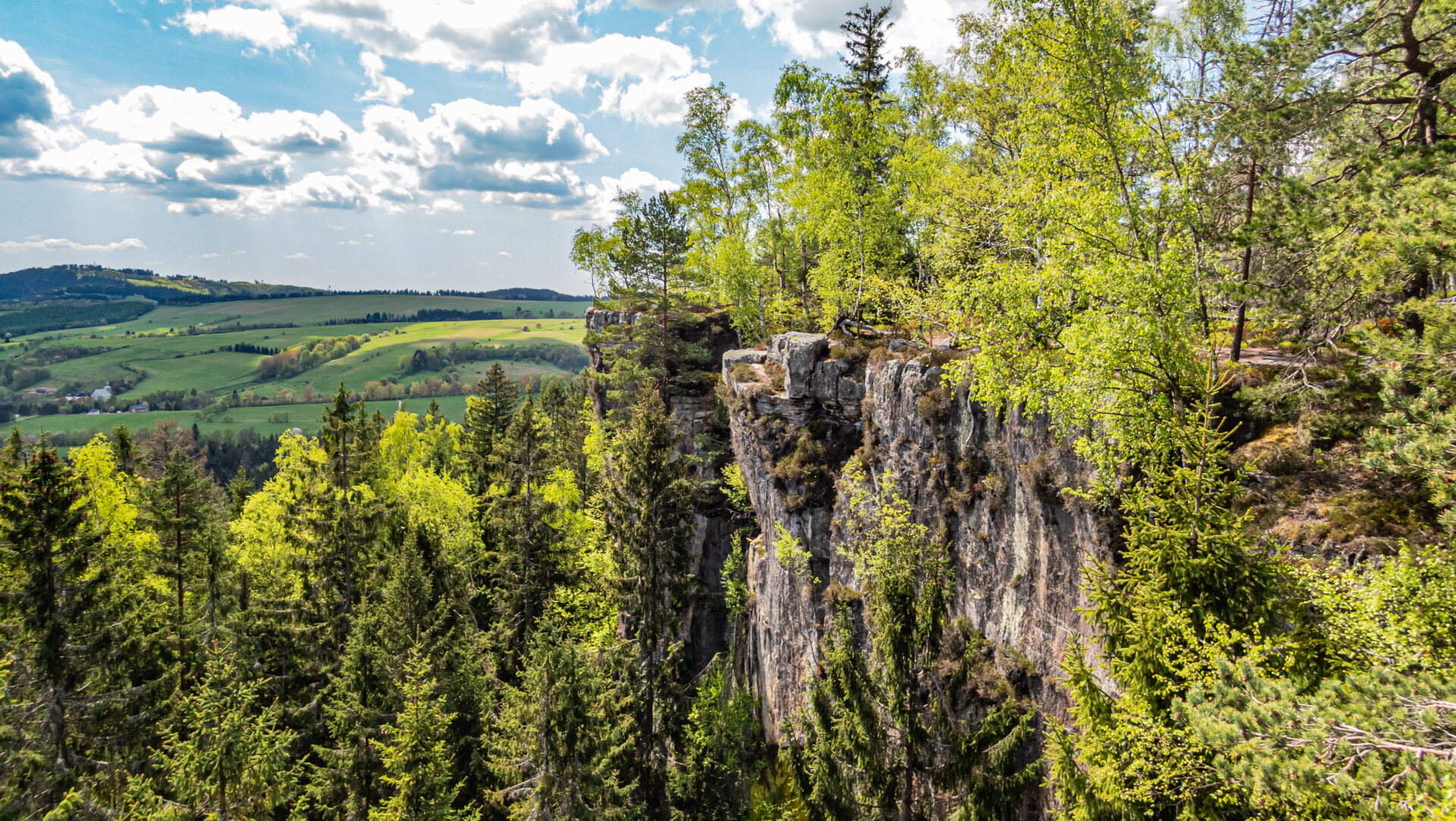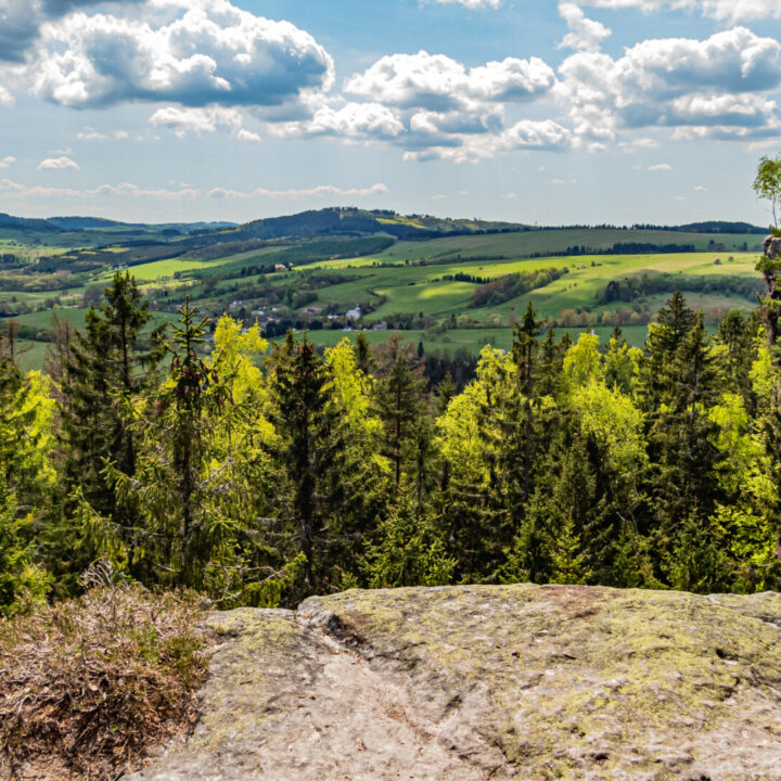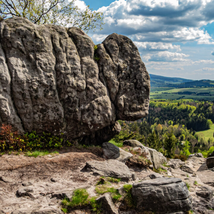 Kilka kroków dalej zmieniamy szlak zielony na niebieski i docieramy do Skał Puchacza. To urwisko powstało w wyniku eksploatacji piaskowca – kamieniołom działał od XIX wieku aż po czasy powojenne. Rozpościera się stąd piękny widok na Góry Bystrzyckie, Orlickie, a także na pobliskie łąki, pastwiska i lesiste wzniesienia. Choć urwisko ma kilkadziesiąt metrów wysokości i nie jest niczym osłonięte, nie odczuwałem typowego dla siebie lęku wysokości. Może to kwestia braku ludzi, może świetnej pogody – w każdym razie mogłem podejść do krawędzi i zrobić kilka zdjęć bez stresu.