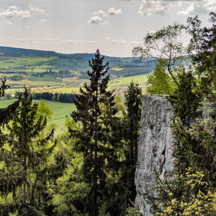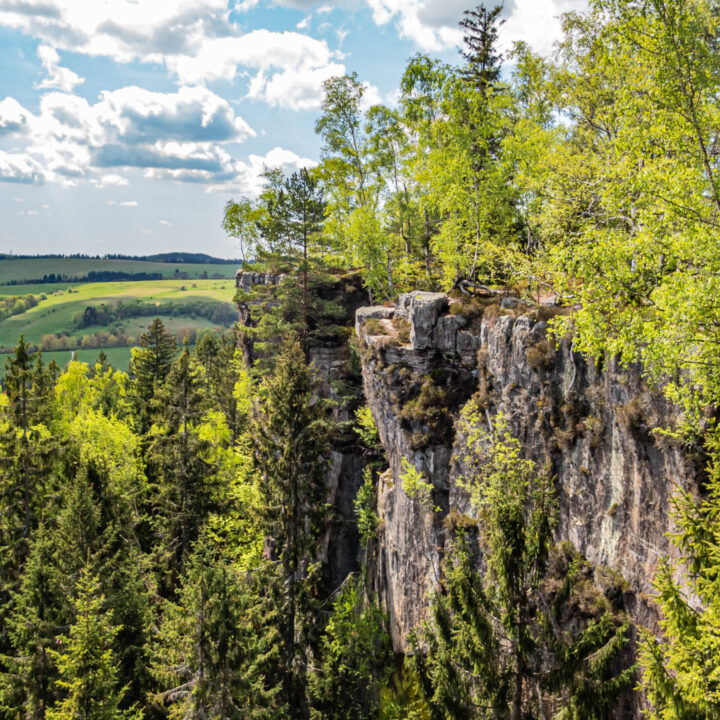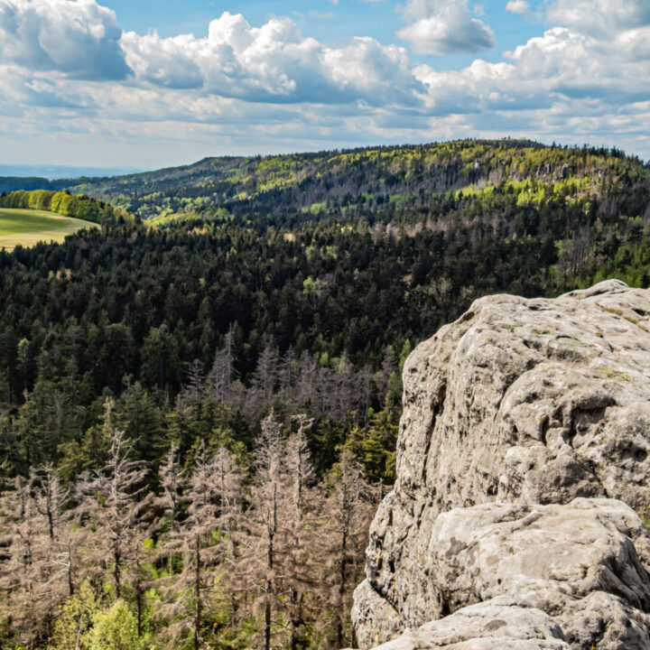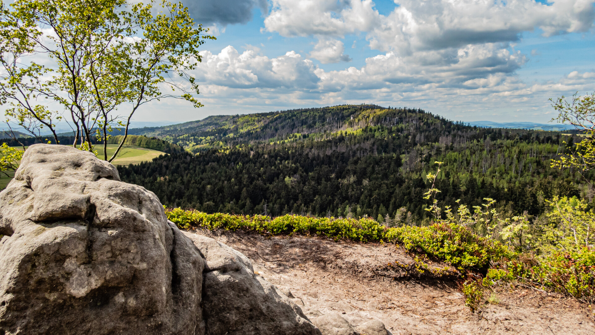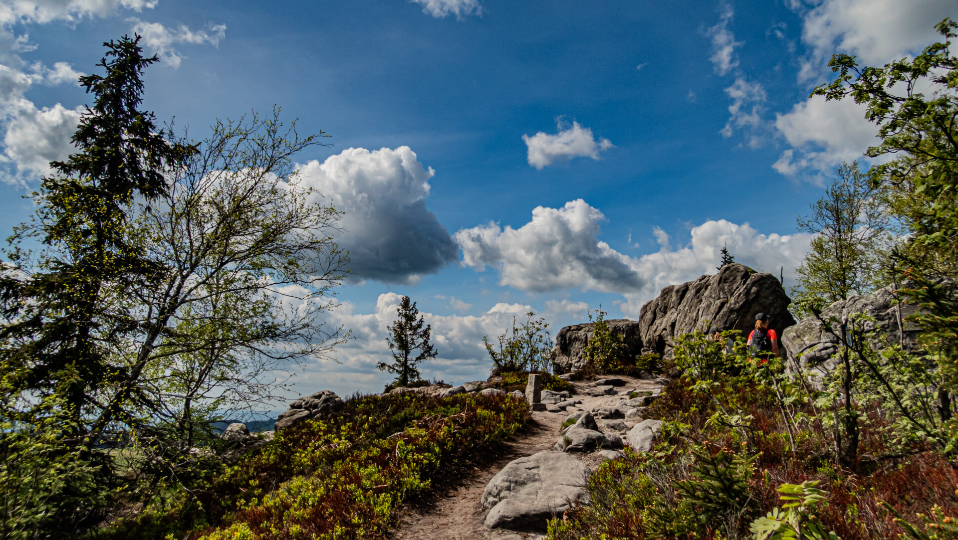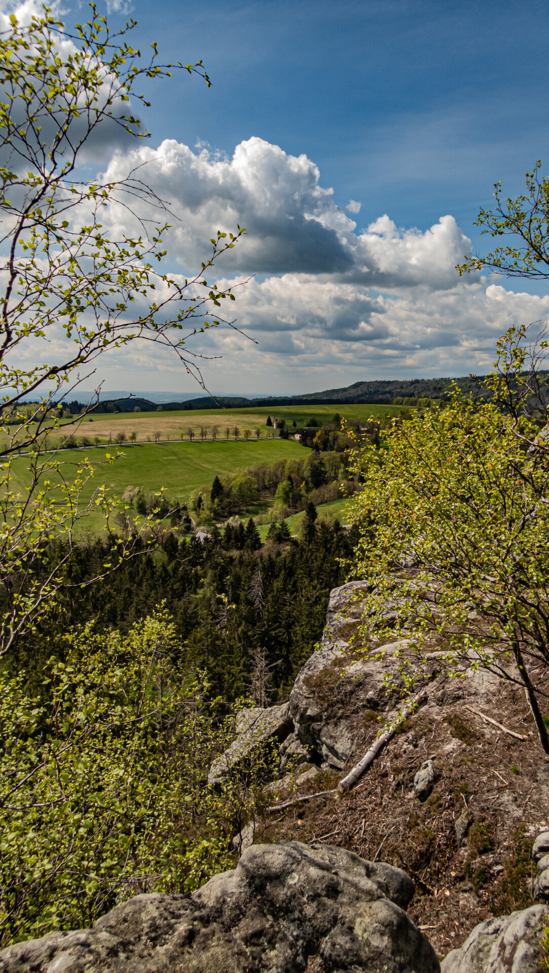 Kilka kroków dalej zmieniamy szlak zielony na niebieski i docieramy do Skał Puchacza. To urwisko powstało w wyniku eksploatacji piaskowca – kamieniołom działał od XIX wieku aż po czasy powojenne. Rozpościera się stąd piękny widok na Góry Bystrzyckie, Orlickie, a także na pobliskie łąki, pastwiska i lesiste wzniesienia. Choć urwisko ma kilkadziesiąt metrów wysokości i nie jest niczym osłonięte, nie odczuwałem typowego dla siebie lęku wysokości. Może to kwestia braku ludzi, może świetnej pogody – w każdym razie mogłem podejść do krawędzi i zrobić kilka zdjęć bez stresu.
