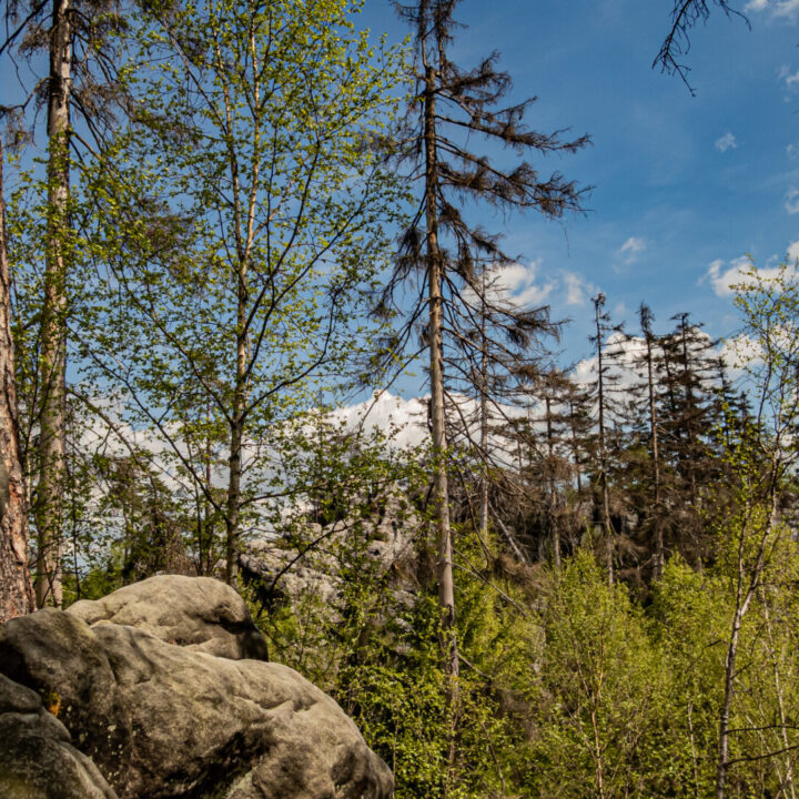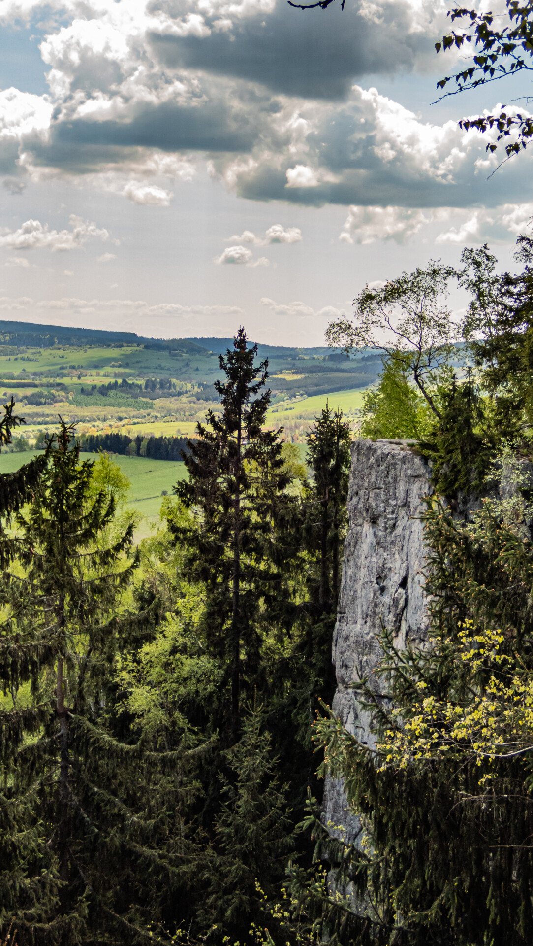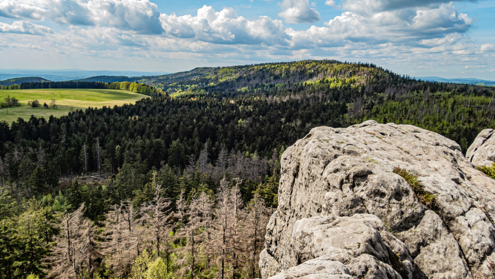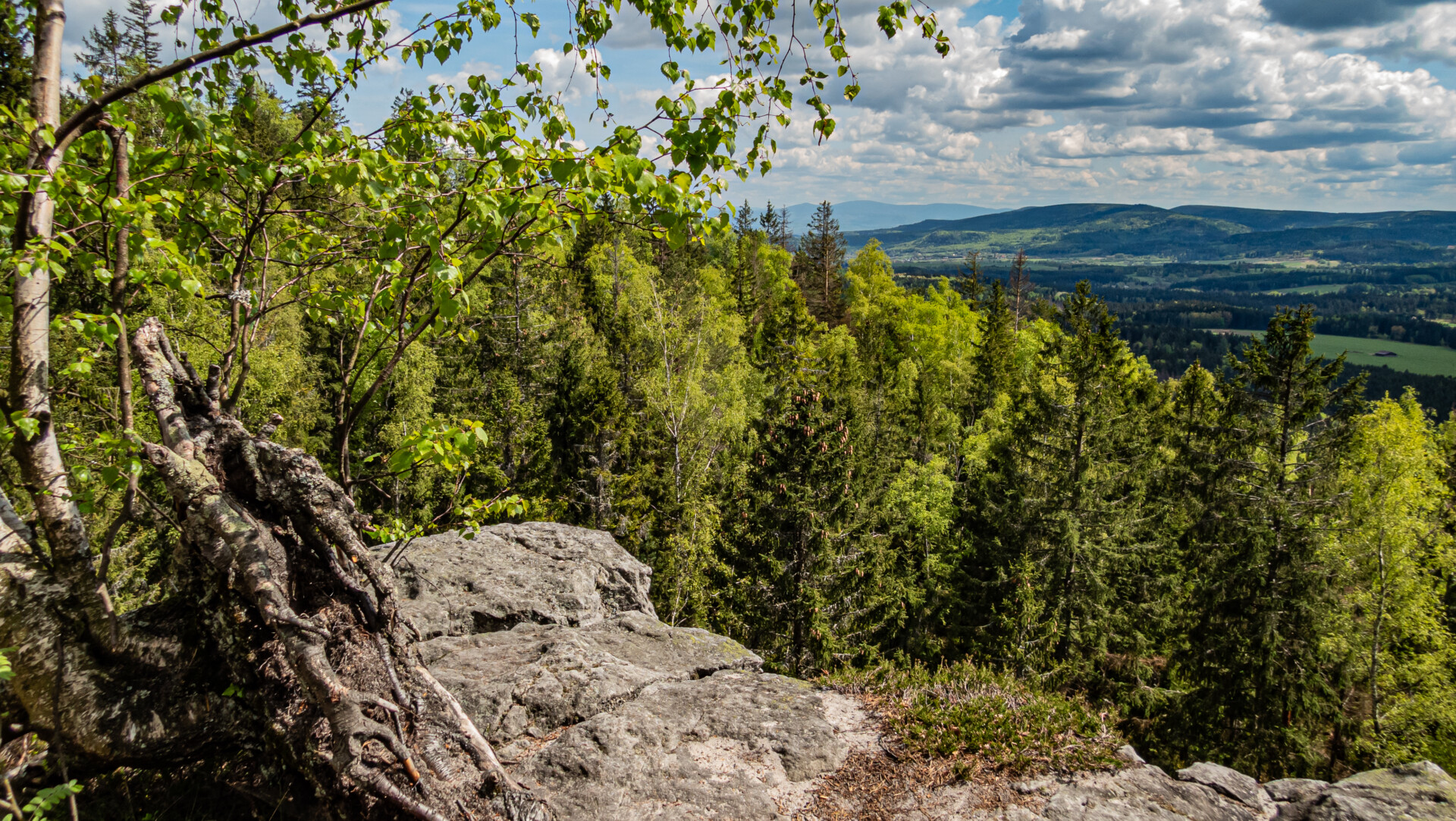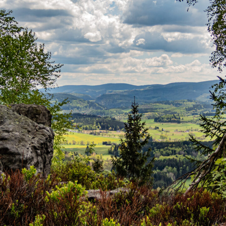 Kilka kroków dalej zmieniamy szlak zielony na niebieski i docieramy do Skał Puchacza. To urwisko powstało w wyniku eksploatacji piaskowca – kamieniołom działał od XIX wieku aż po czasy powojenne. Rozpościera się stąd piękny widok na Góry Bystrzyckie, Orlickie, a także na pobliskie łąki, pastwiska i lesiste wzniesienia. Choć urwisko ma kilkadziesiąt metrów wysokości i nie jest niczym osłonięte, nie odczuwałem typowego dla siebie lęku wysokości. Może to kwestia braku ludzi, może świetnej pogody – w każdym razie mogłem podejść do krawędzi i zrobić kilka zdjęć bez stresu.