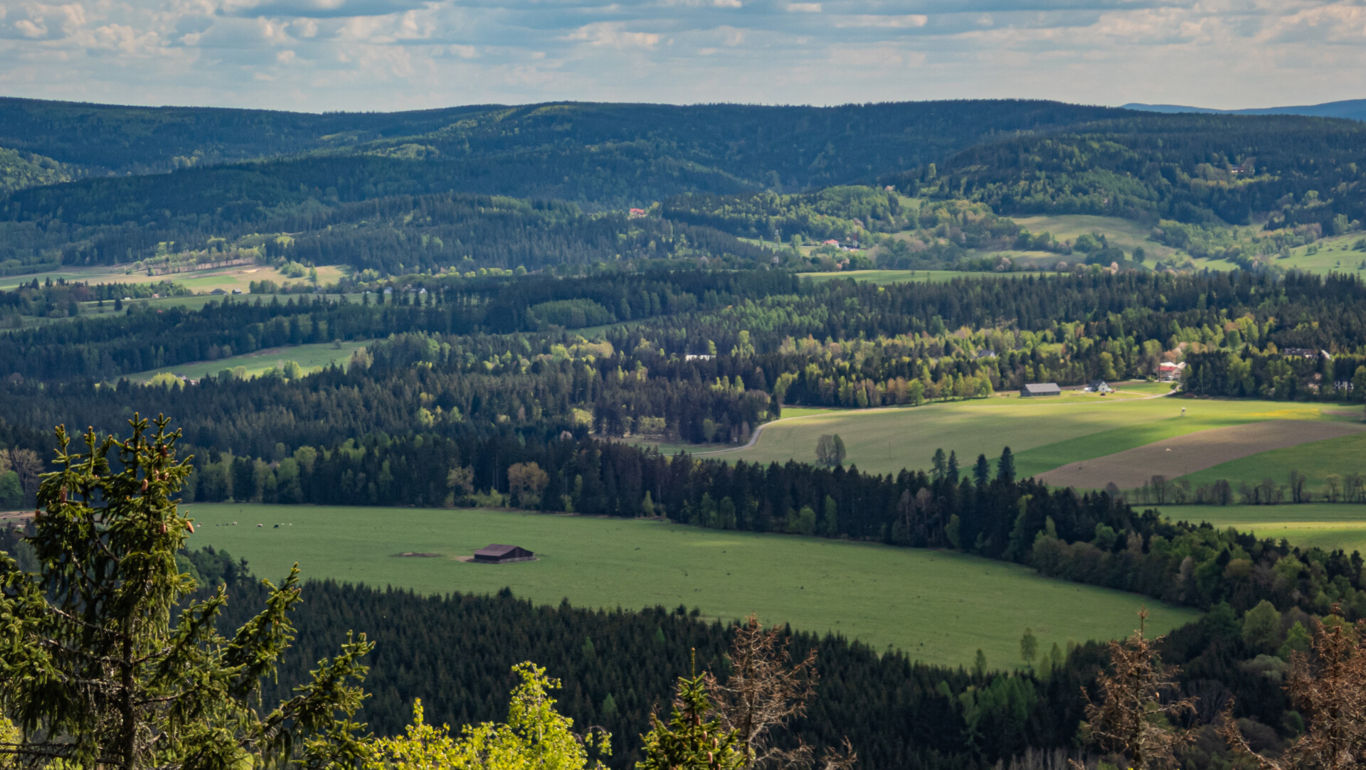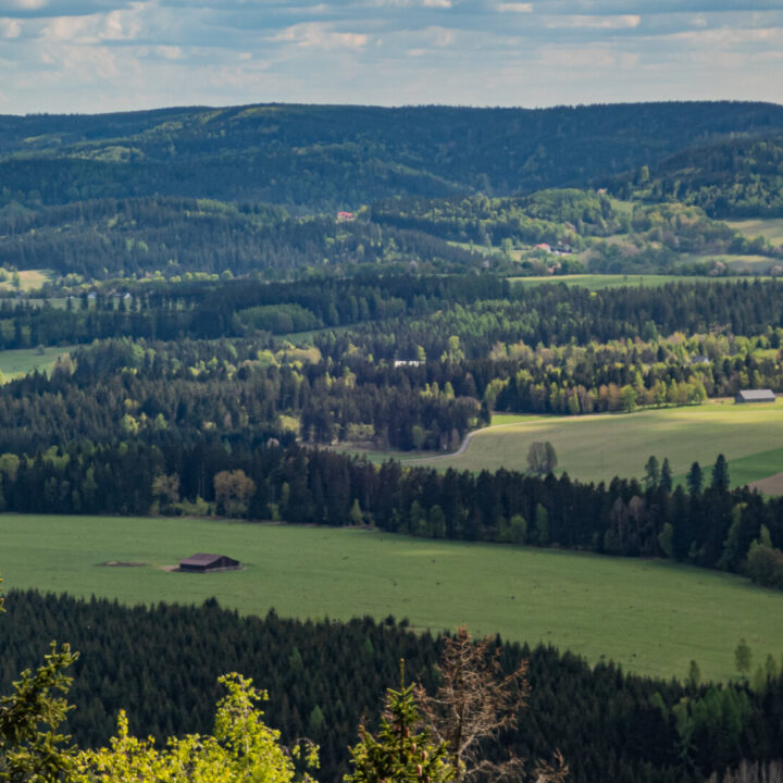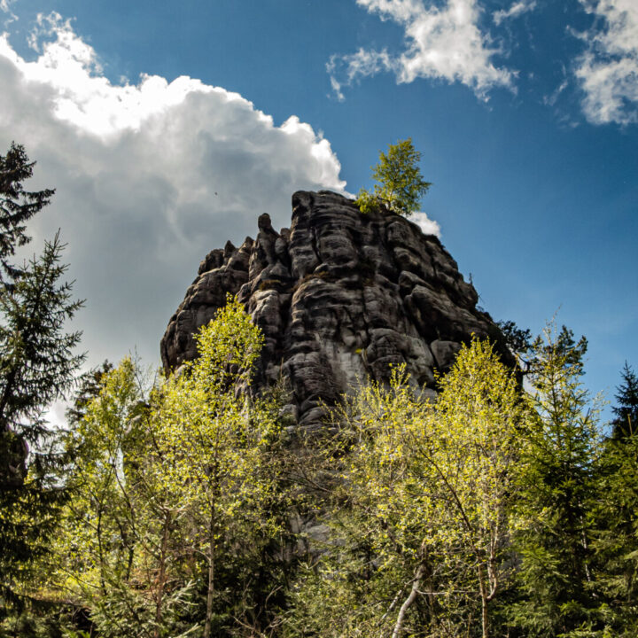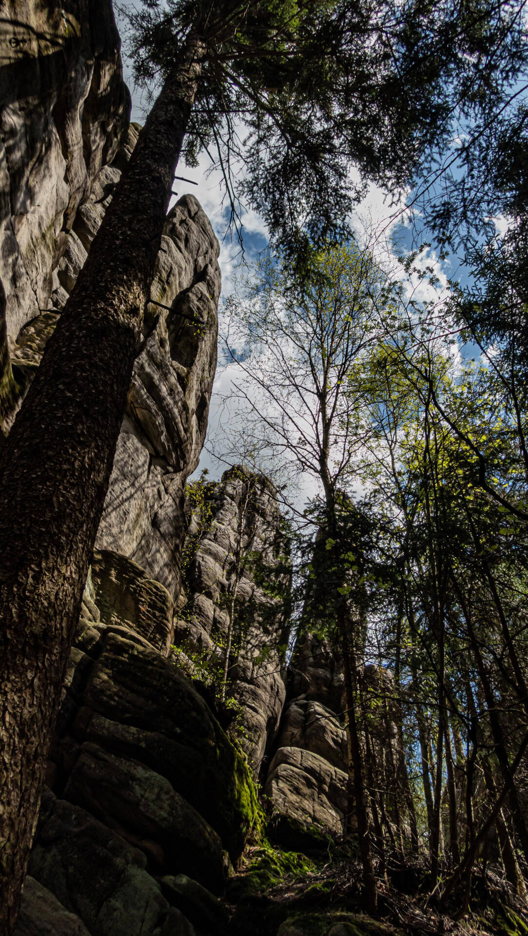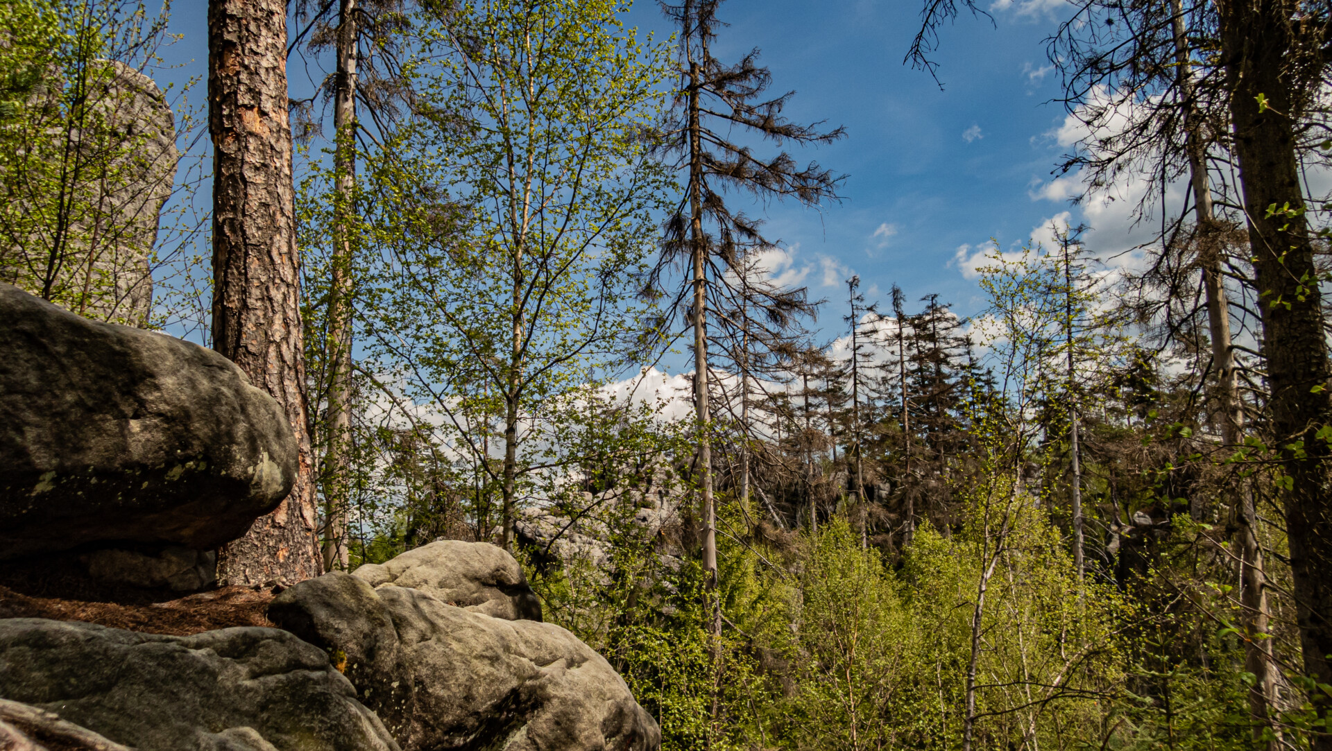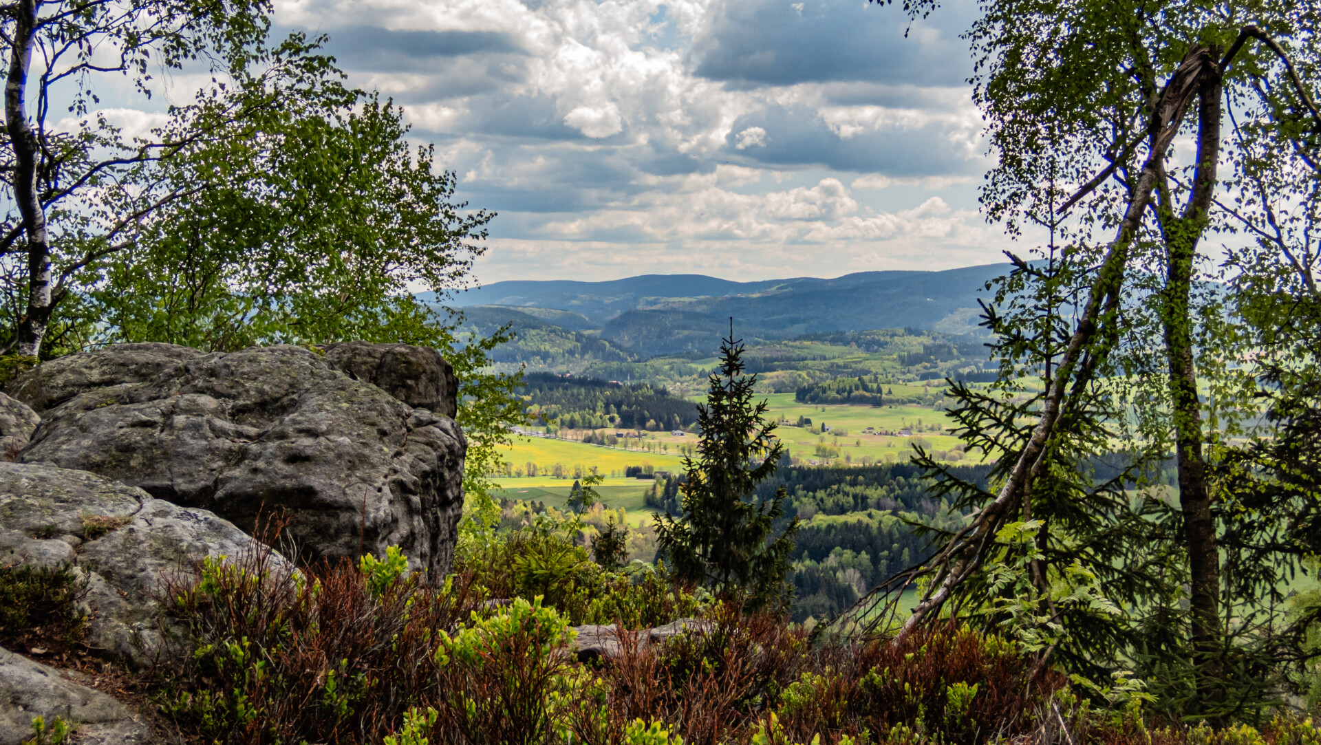Kilka kroków dalej zmieniamy szlak zielony na niebieski i docieramy do Skał Puchacza. To urwisko powstało w wyniku eksploatacji piaskowca – kamieniołom działał od XIX wieku aż po czasy powojenne. Rozpościera się stąd piękny widok na Góry Bystrzyckie, Orlickie, a także na pobliskie łąki, pastwiska i lesiste wzniesienia. Choć urwisko ma kilkadziesiąt metrów wysokości i nie jest niczym osłonięte, nie odczuwałem typowego dla siebie lęku wysokości. Może to kwestia braku ludzi, może świetnej pogody – w każdym razie mogłem podejść do krawędzi i zrobić kilka zdjęć bez stresu.