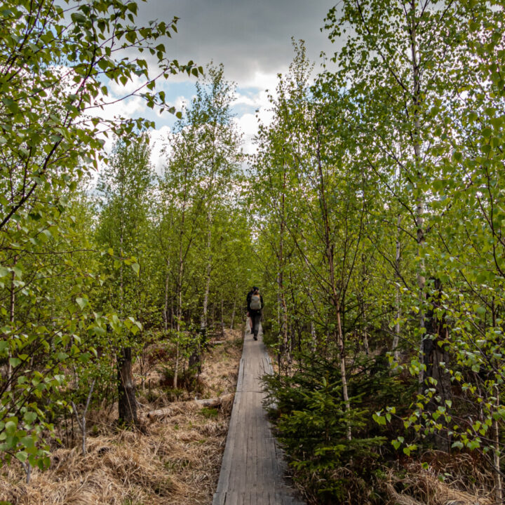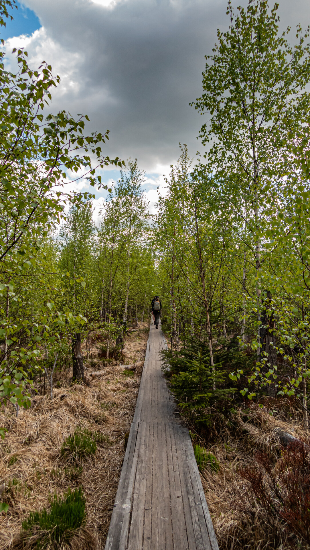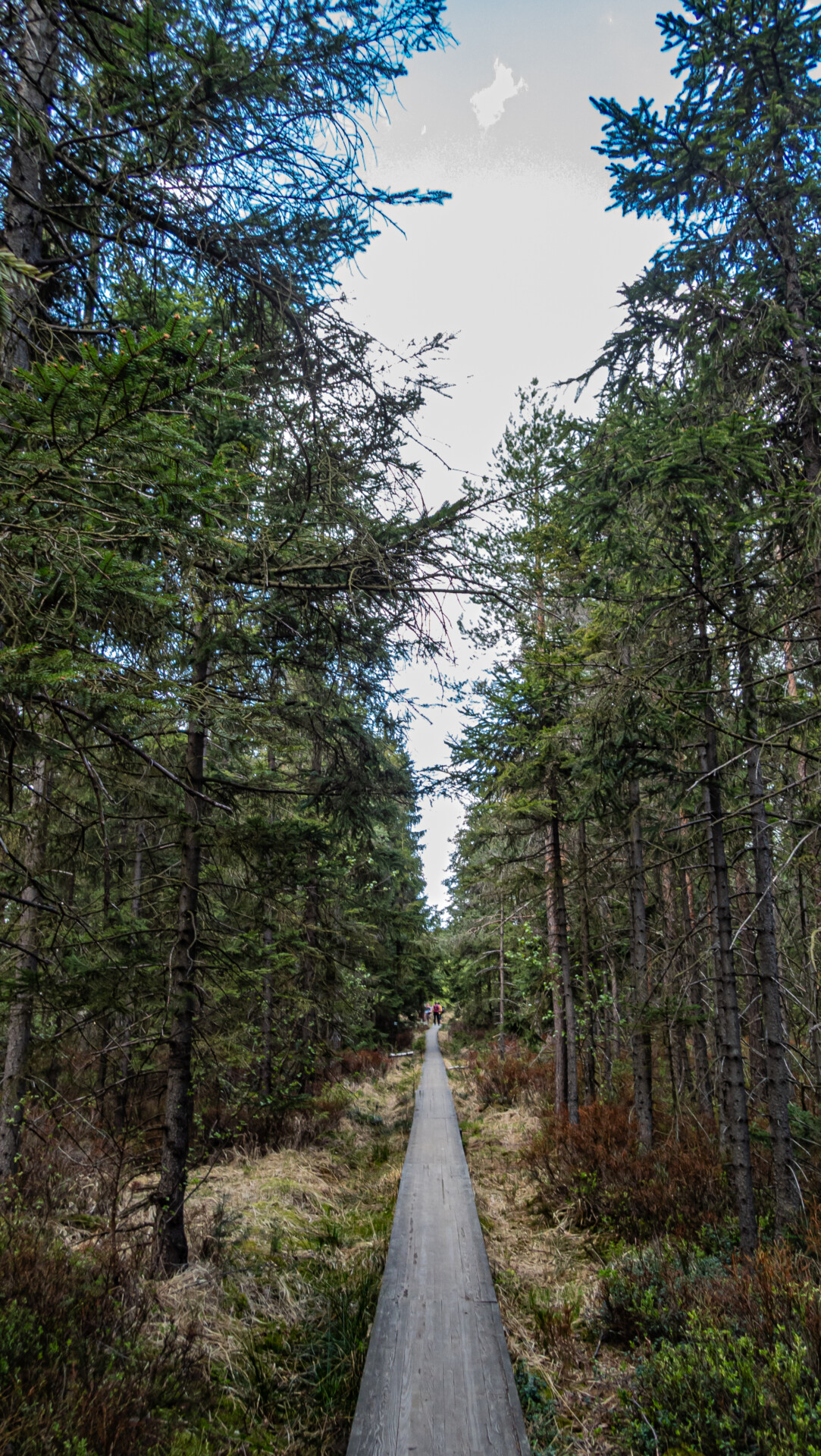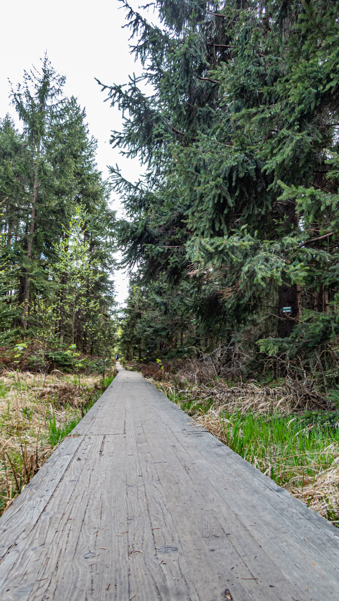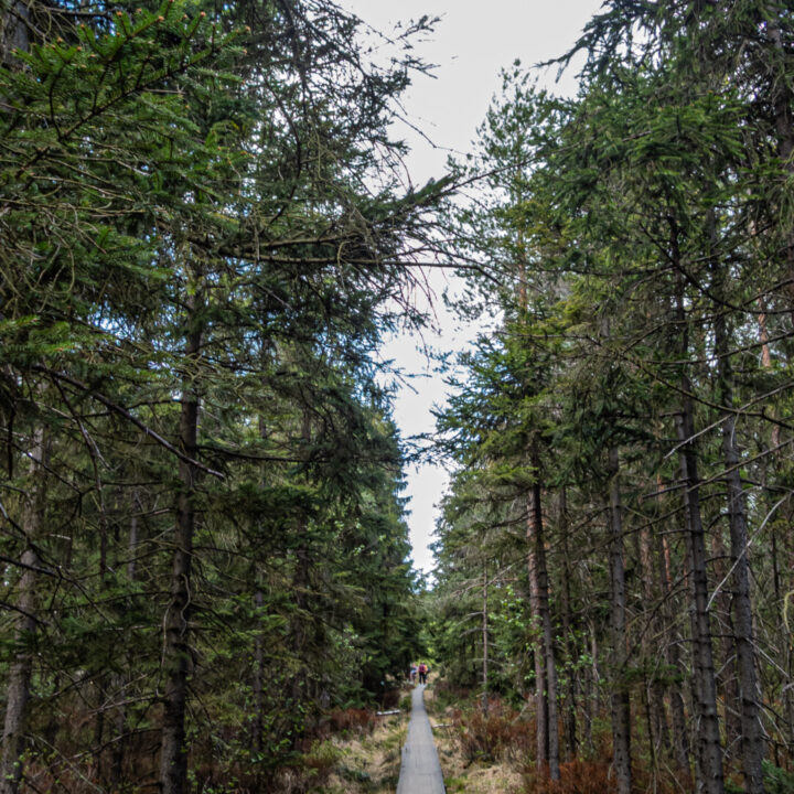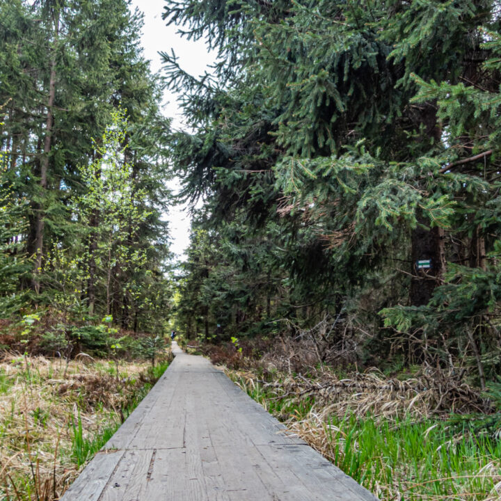 Kilkaset metrów dalej – niespodzianka. Na szlaku między Dylówką a Skałami Puchacza czeka długa, drewniana kładka o długości około 300 metrów. Wygląda niepozornie, ale została zbudowana z konkretnego powodu. Przebiega przez teren źródliskowy i pozostałość torfowiska wysokiego – miejsce stale wilgotne i nasiąknięte wodą. Kładka chroni ten wrażliwy ekosystem przed zadeptaniem i pozwala przejść suchą stopą przez to… sudeckie mini-mokradło.
