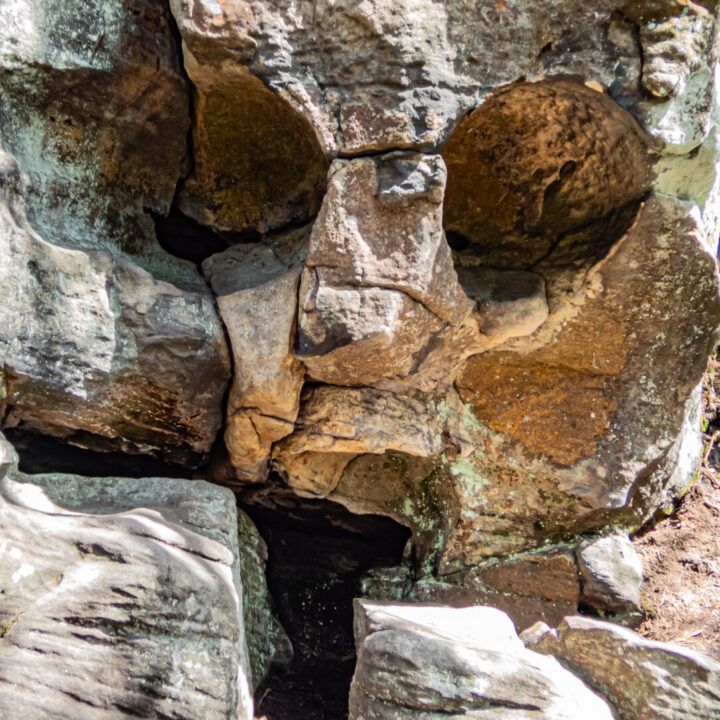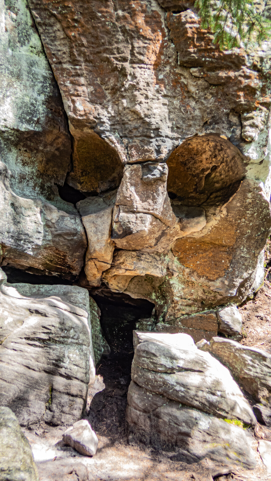 Spacerując niebieskim szlakiem wzdłuż urwiska, po niecałych dwóch kilometrach spokojnego marszu dotarliśmy do odejścia na Skalną Czaszkę, która… jest w 100% Skalną Czaszką! Prawdę mówiąc, trudno uwierzyć, że to dzieło natury. Niezwykły efekt erozji oraz procesów wietrzenia – przez wiatr, wodę i zmiany temperatury – sprawił, że skała wygląda tak, jakby ktoś wyrzeźbił ją celowo.
