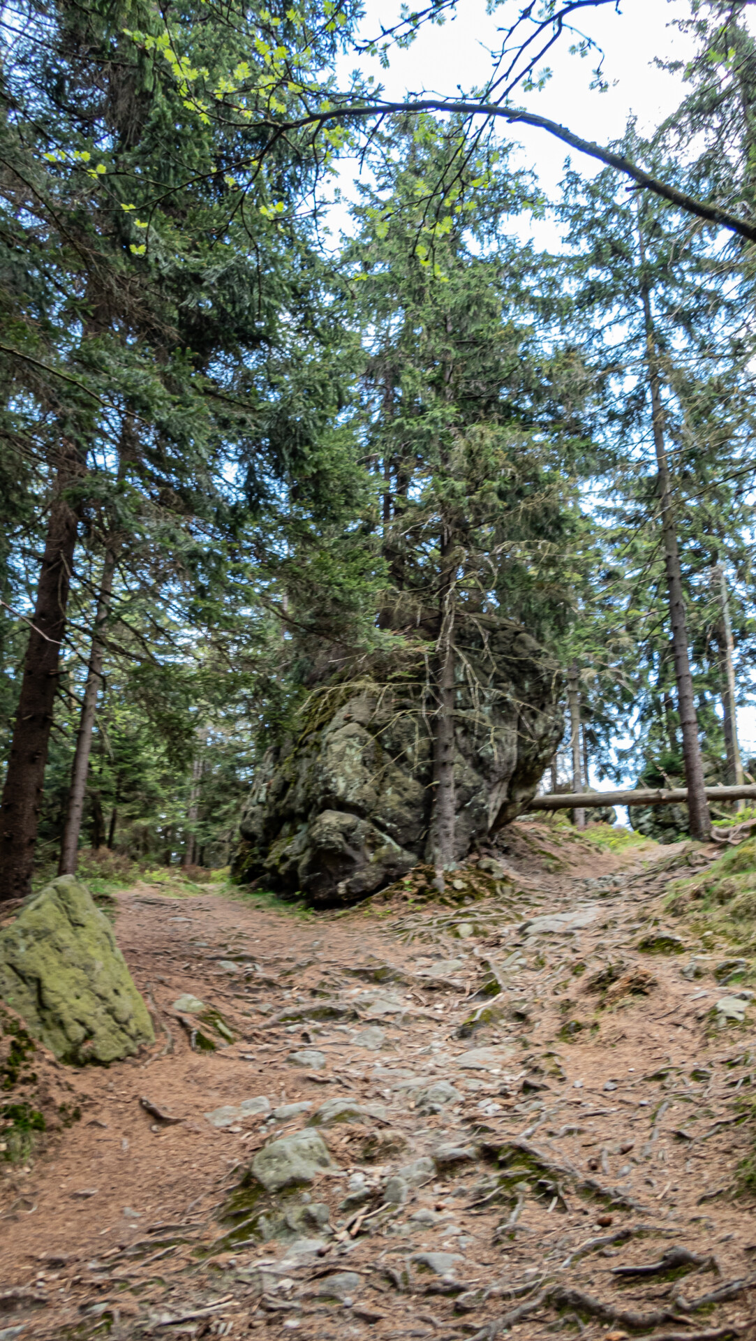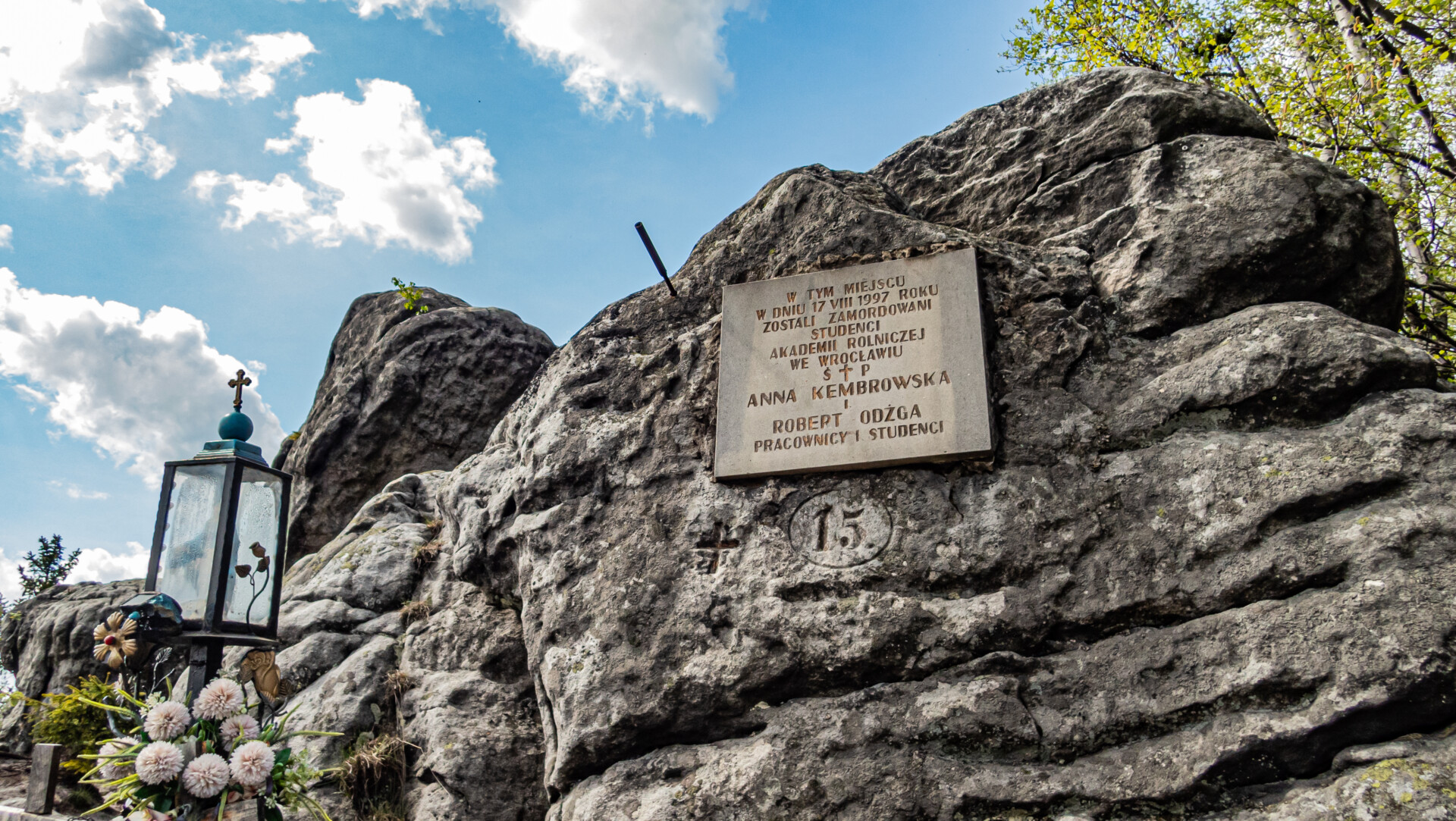 Od Skalnej Czaszki szlak wreszcie zaczął delikatnie piąć się w górę, co oznaczało, że zbliżaliśmy się do ostatniego punktu naszej trasy. Niemniej jednak kolejna na trasie to Kopa Śmierci – 825 m n.p.m. – osobny punkt topograficzny (choć większość turystów skupia się raczej na Narożniku i Skałach Puchacza). Sama Kopa to niepozorne, zalesione wzniesienie, a otaczające je skały tworzą coś w rodzaju naturalnego dziedzińca.