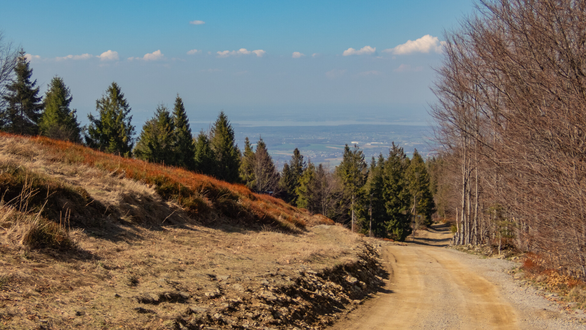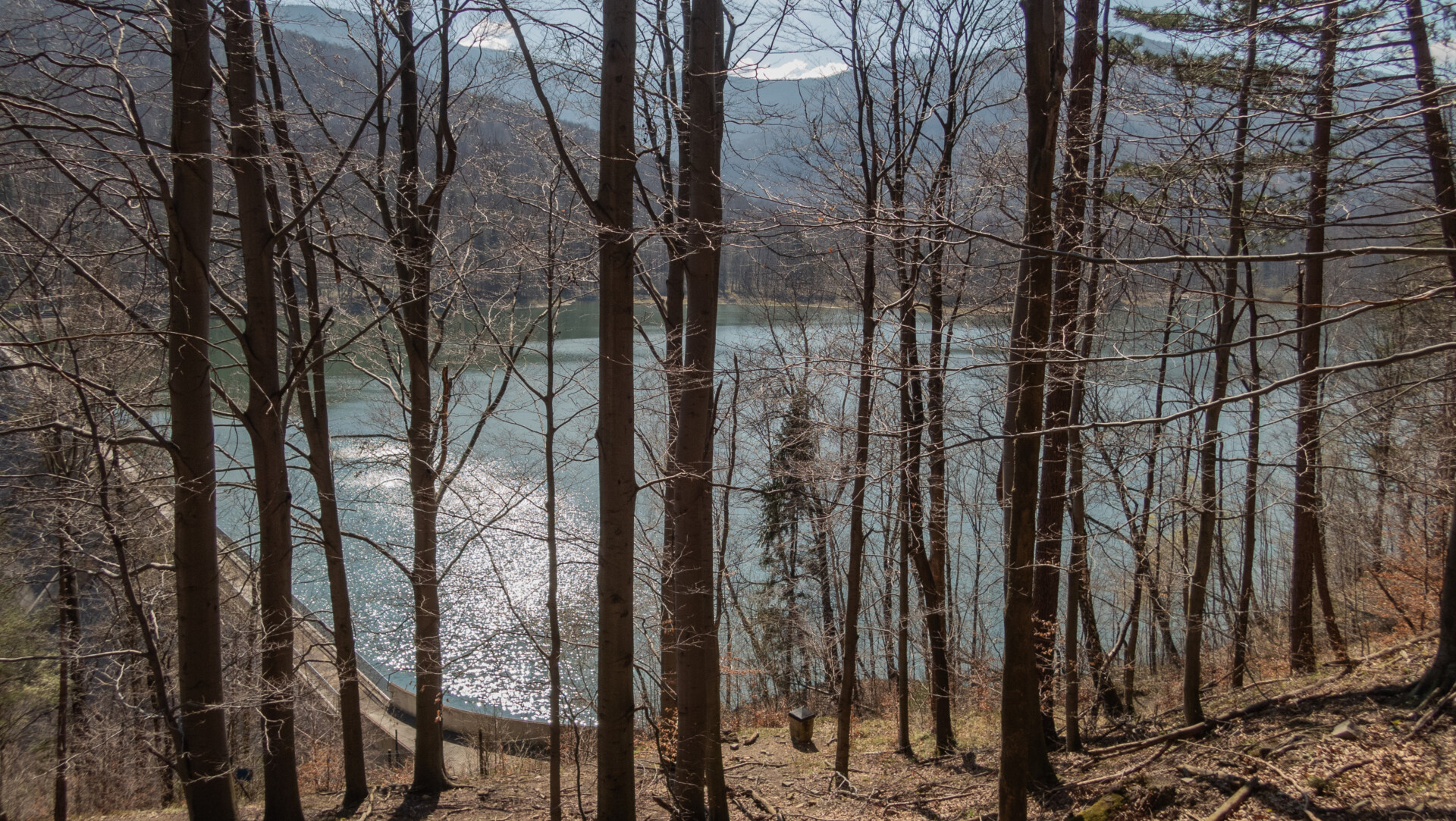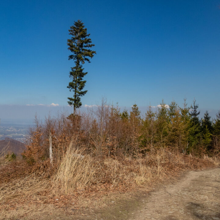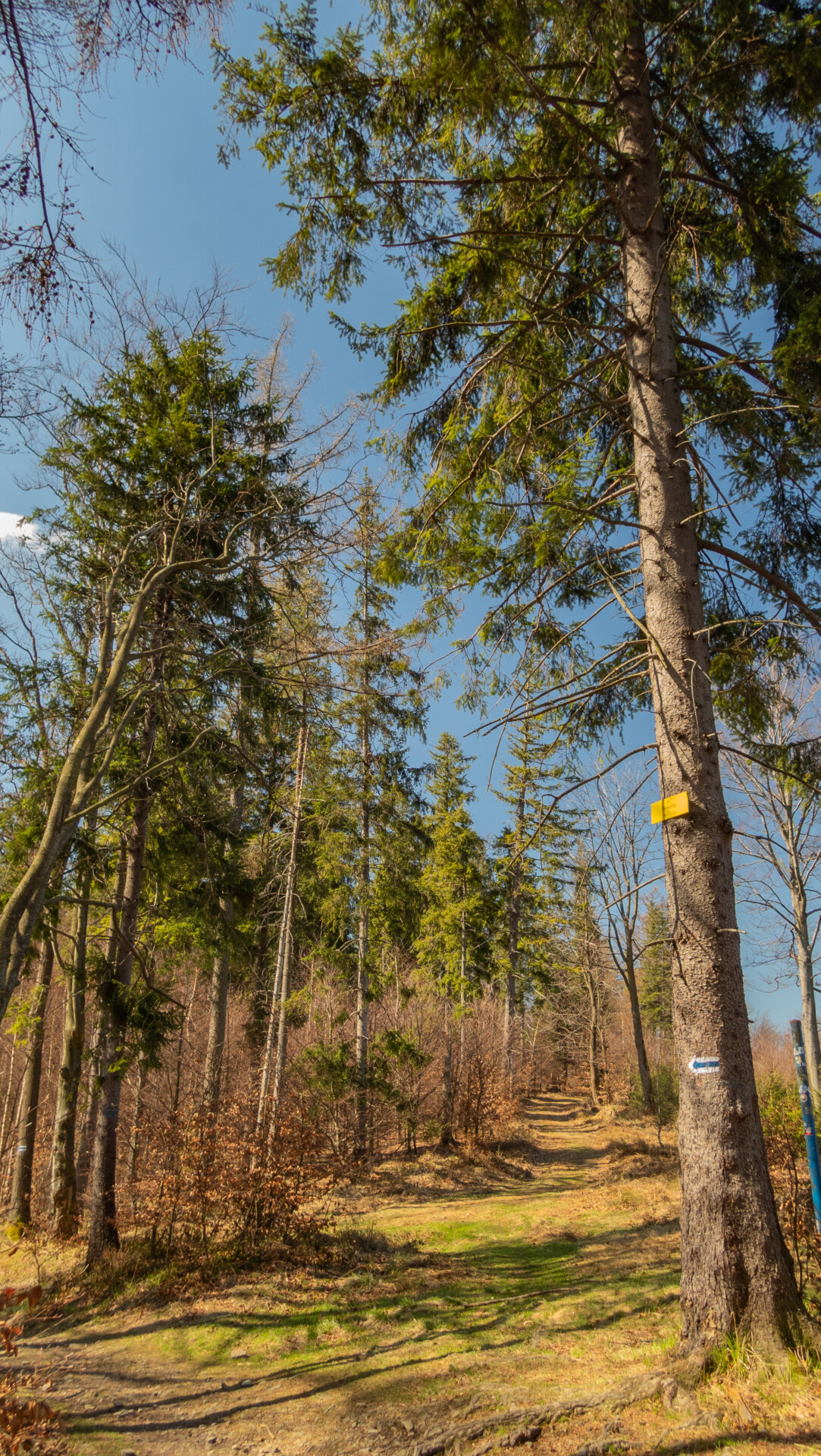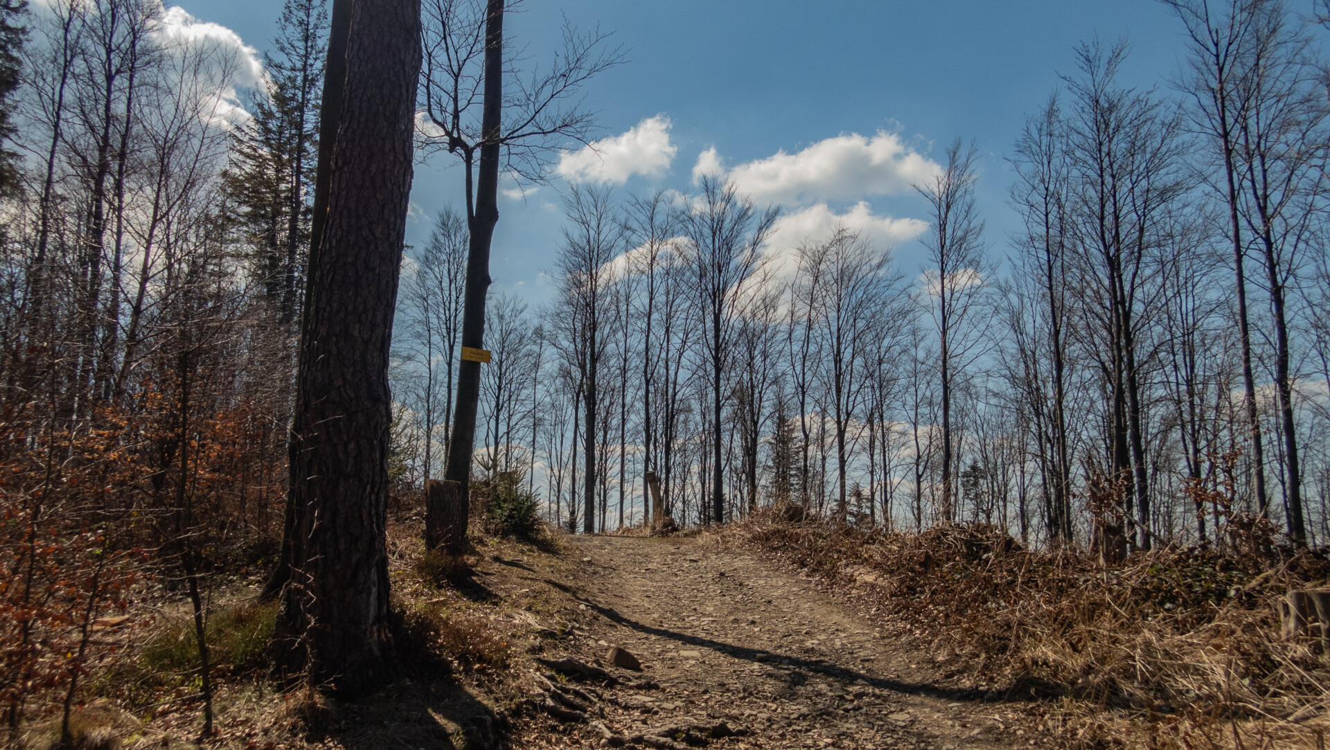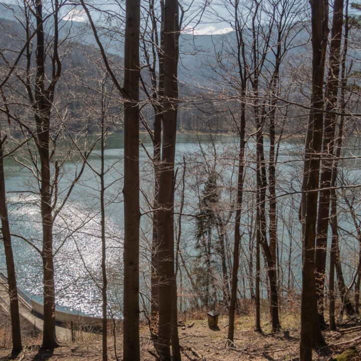 Tym razem widok z Klimczoka nie był aż tak spektakularny jak podczas mojej zimowej wyprawy w styczniu – chmury skutecznie zasłaniały Tatry – ale miło było zobaczyć tę panoramę w odsłonie budzącej się wiosny. Od tego momentu szlak prowadził już tylko w dół – idealnie dla maruderów. Nie zatrzymywałem się przy Schronisku PTTK Szyndzielnia (wówczas w remoncie), więc czerwono-żółty odcinek z Klimczoka przez Szyndzielnię i dalej fragmentem zielonego szlaku do górnej stacji kolejki pokonałem szybko – szeroką, spacerową trasą. Za stacją odbiłem na żółty szlak, który prowadził bardziej stromo w dół (średnie nachylenie ok. 16%), aż nad zaporę na Jeziorze Wapienickim. Zagapiłem się jednak i przy samym końcu zamiast skręcić w stronę zapory, poszedłem prosto „na skróty”, by powrócić na żółty szlak w rejonie Żydowskiego Potoku.