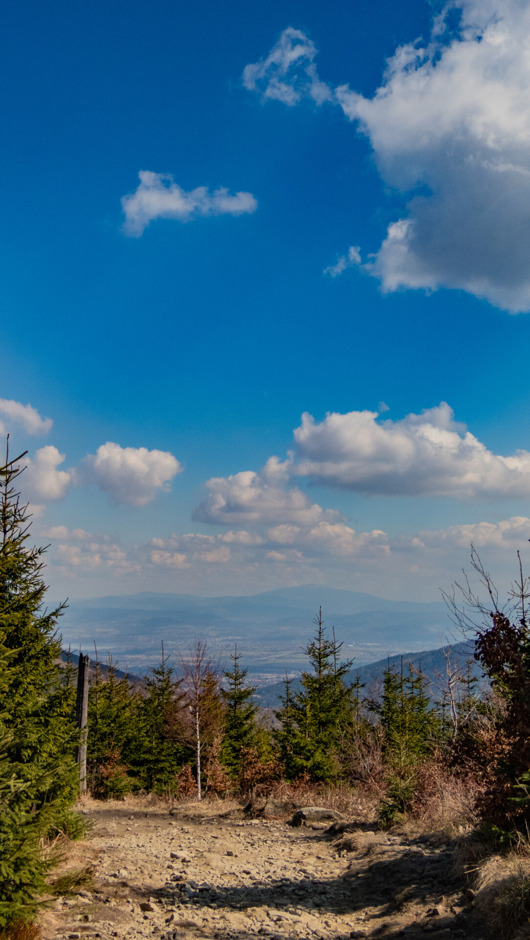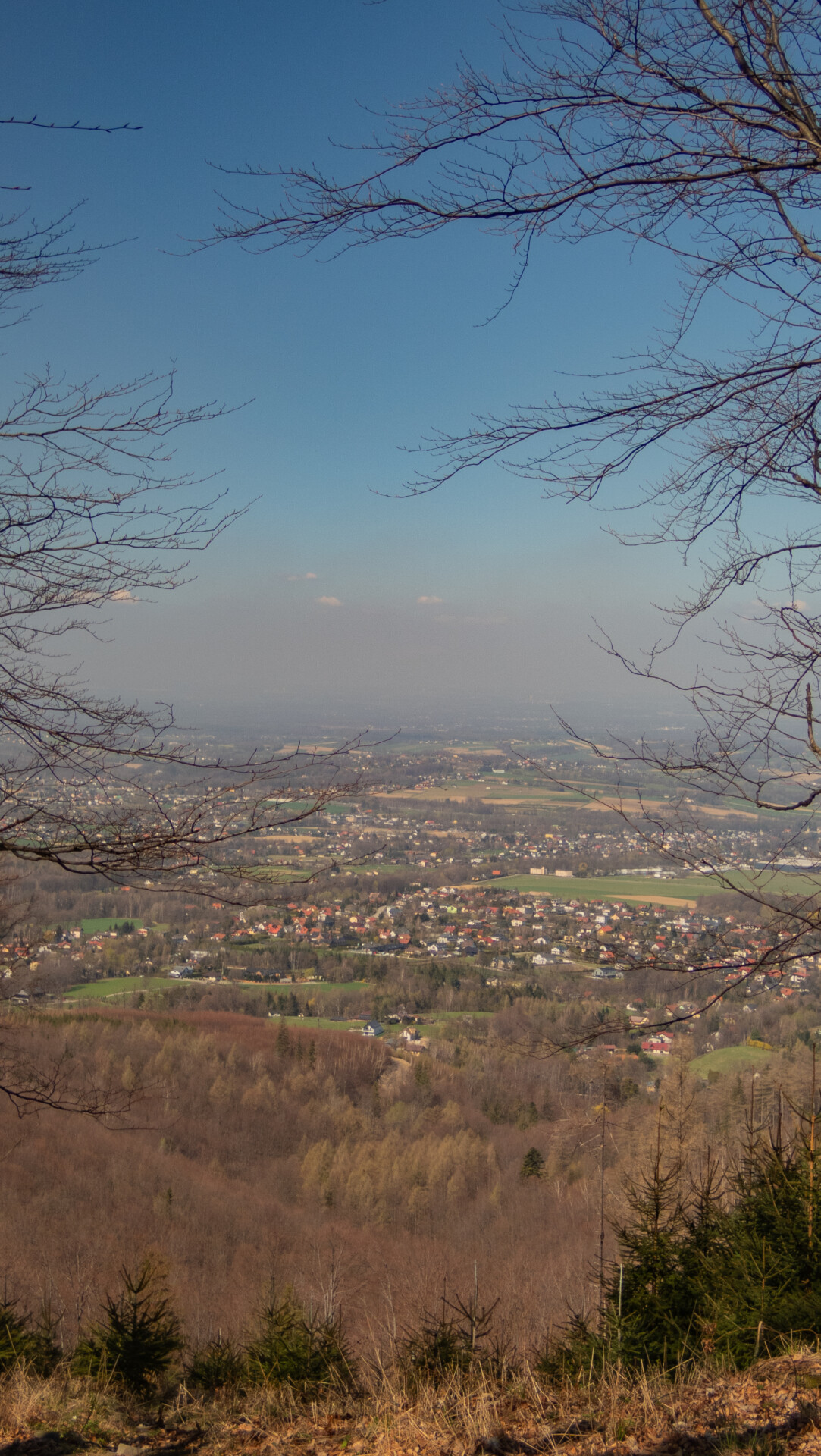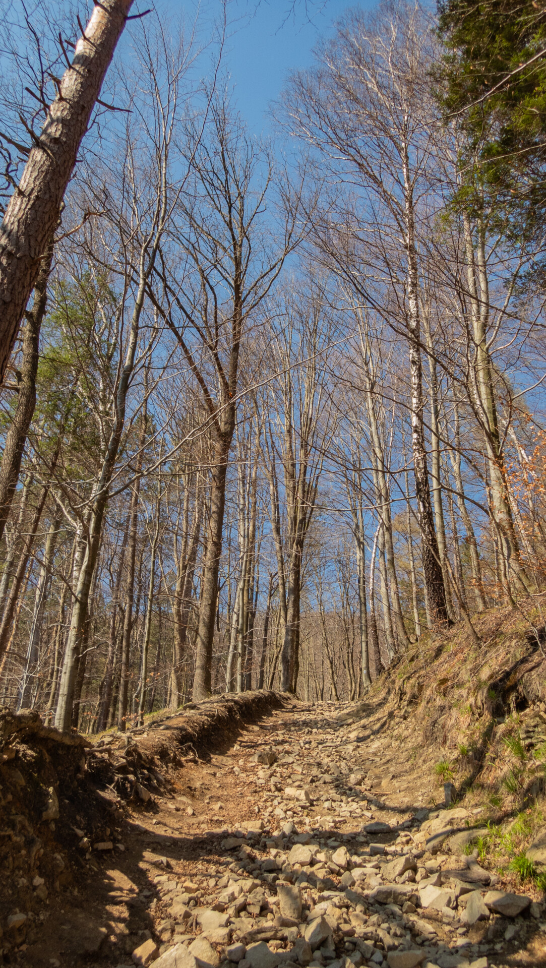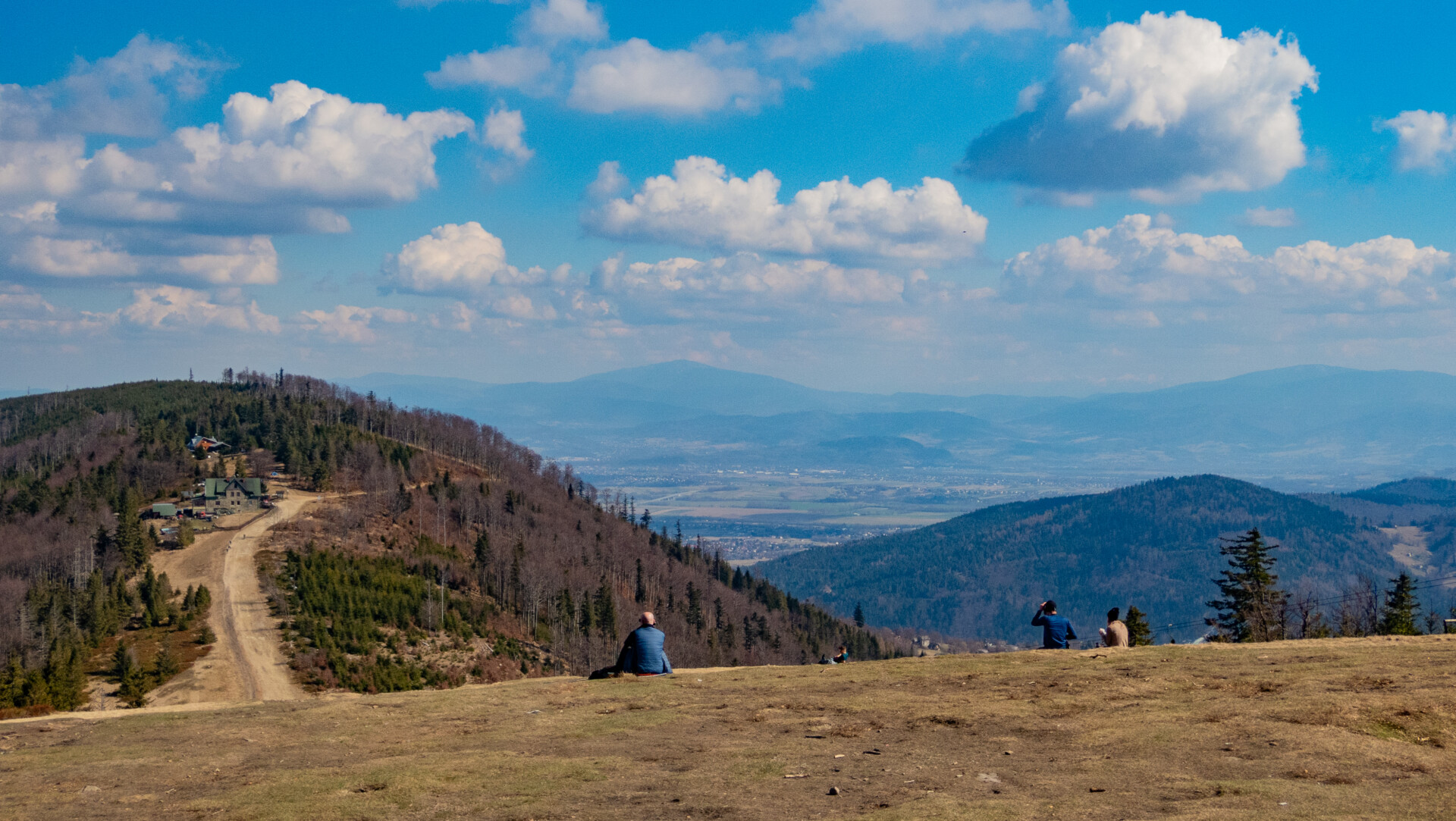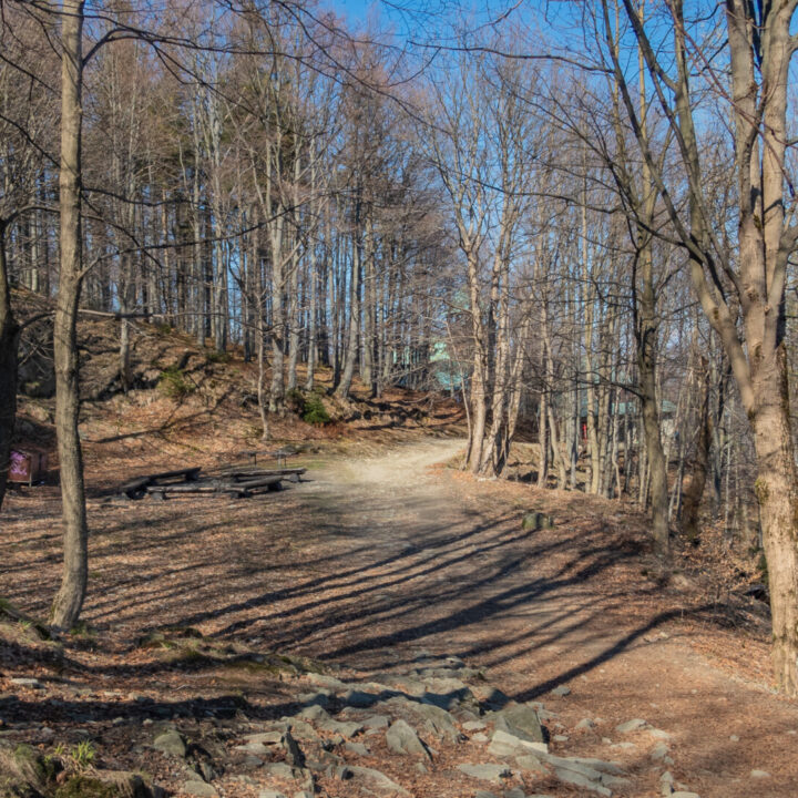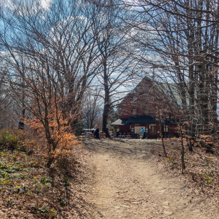 Tym razem widok z Klimczoka nie był aż tak spektakularny jak podczas mojej zimowej wyprawy w styczniu – chmury skutecznie zasłaniały Tatry – ale miło było zobaczyć tę panoramę w odsłonie budzącej się wiosny. Od tego momentu szlak prowadził już tylko w dół – idealnie dla maruderów. Nie zatrzymywałem się przy Schronisku PTTK Szyndzielnia (wówczas w remoncie), więc czerwono-żółty odcinek z Klimczoka przez Szyndzielnię i dalej fragmentem zielonego szlaku do górnej stacji kolejki pokonałem szybko – szeroką, spacerową trasą. Za stacją odbiłem na żółty szlak, który prowadził bardziej stromo w dół (średnie nachylenie ok. 16%), aż nad zaporę na Jeziorze Wapienickim. Zagapiłem się jednak i przy samym końcu zamiast skręcić w stronę zapory, poszedłem prosto „na skróty”, by powrócić na żółty szlak w rejonie Żydowskiego Potoku.