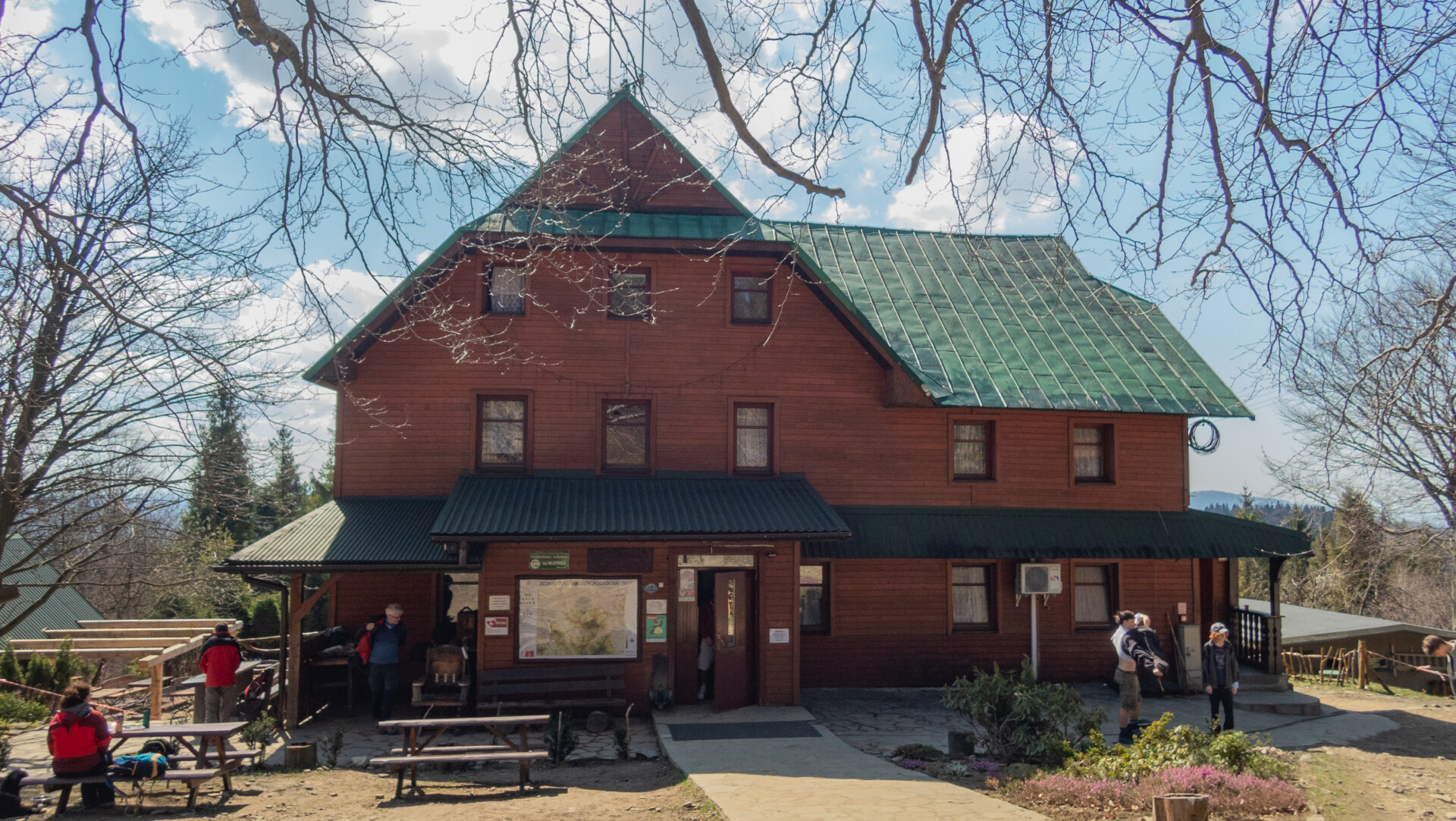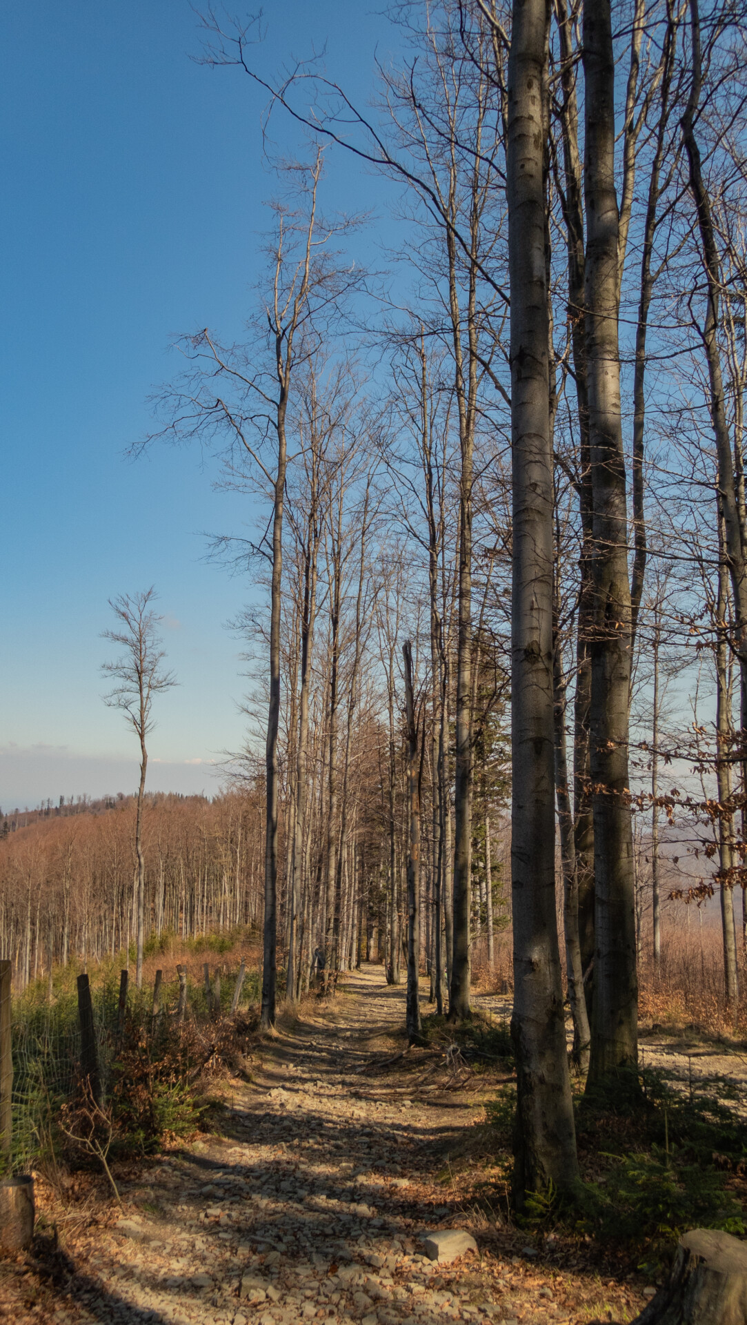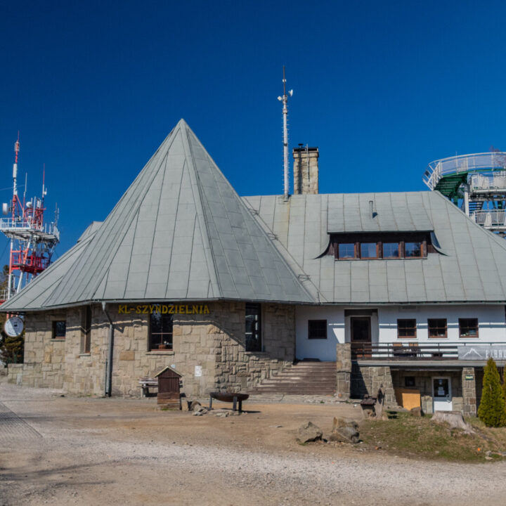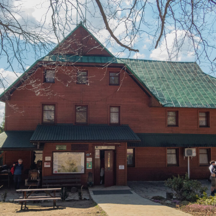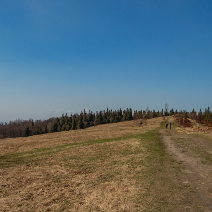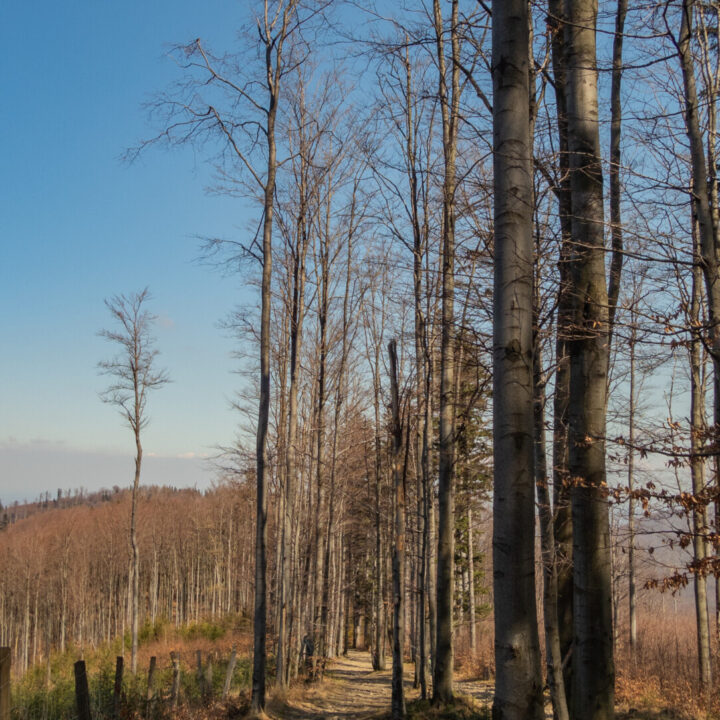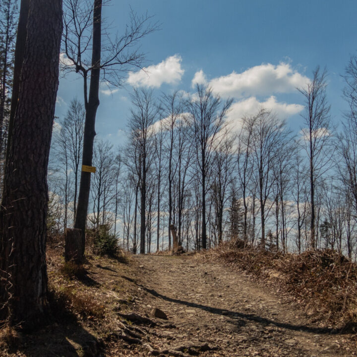 Po dotarciu pod Palenicę (sam wierzchołek leży lekko na lewo od szlaku), szlak zmienił charakter: szeroki dukt, lekko opadający i wznoszący się, bardzo wygodny do marszu. Po drodze minąłem Kopany (690 m n.p.m.), Wysokie (756 m) – obok którego znajduje się Leśny Kościół w Jaworzu, ale zapomniałem o nim i tam nie dotarłem – dalej Przykra (824 m), Dom Drwali i… już. Po niespełna siedmiu kilometrach marszu dotarłem do Schroniska PTTK na Błatniej. Przyjemne miejsce – o dziwo, nie było tu tłumów, a z głośników zwiewnie sączył się… jazz! Po 45-minutowej przerwie z ciepłym posiłkiem ruszyłem dalej.