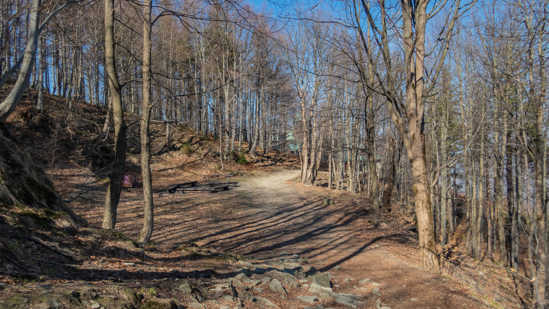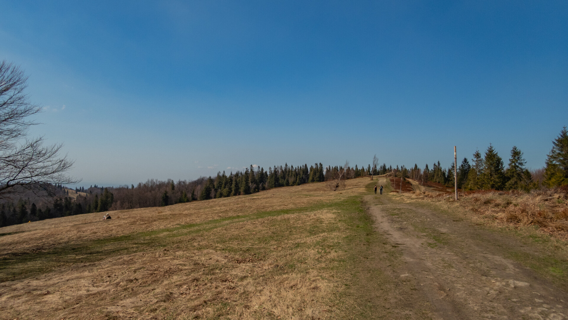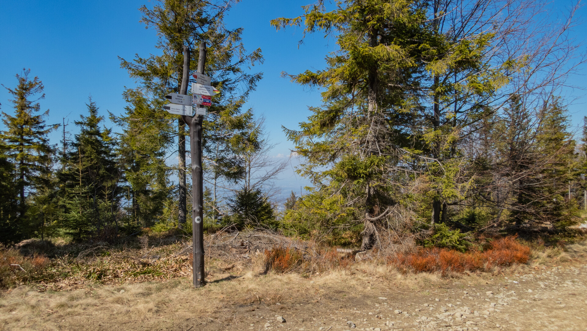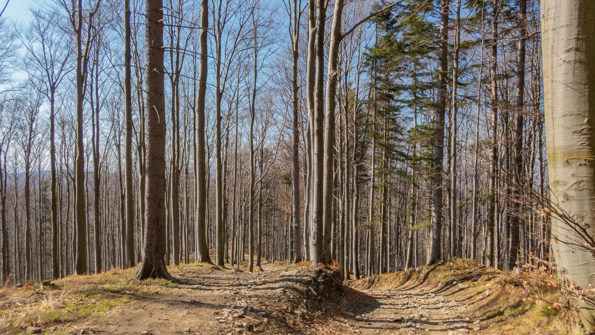 Po dotarciu pod Palenicę (sam wierzchołek leży lekko na lewo od szlaku), szlak zmienił charakter: szeroki dukt, lekko opadający i wznoszący się, bardzo wygodny do marszu. Po drodze minąłem Kopany (690 m n.p.m.), Wysokie (756 m) – obok którego znajduje się Leśny Kościół w Jaworzu, ale zapomniałem o nim i tam nie dotarłem – dalej Przykra (824 m), Dom Drwali i… już. Po niespełna siedmiu kilometrach marszu dotarłem do Schroniska PTTK na Błatniej. Przyjemne miejsce – o dziwo, nie było tu tłumów, a z głośników zwiewnie sączył się… jazz! Po 45-minutowej przerwie z ciepłym posiłkiem ruszyłem dalej.