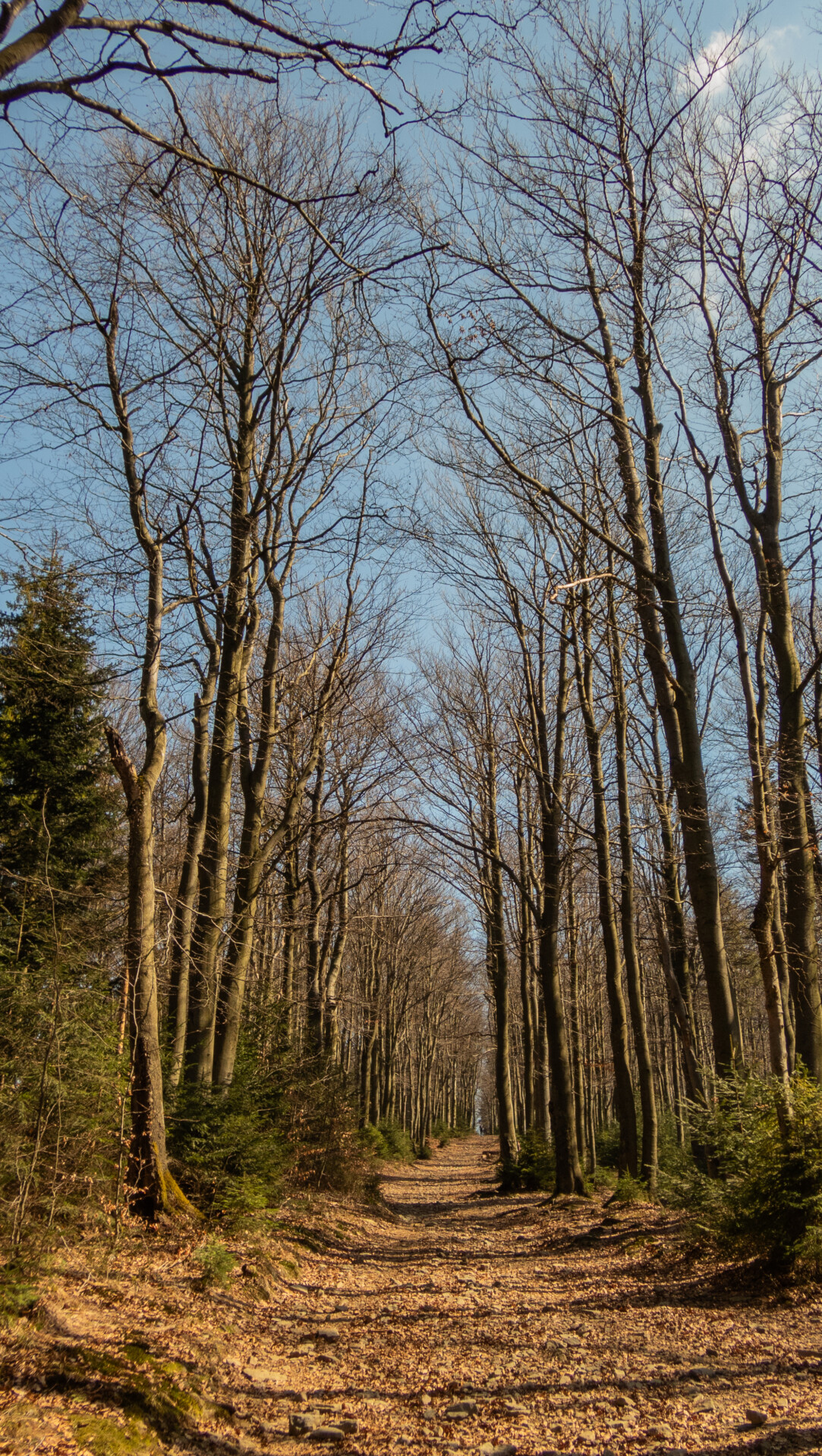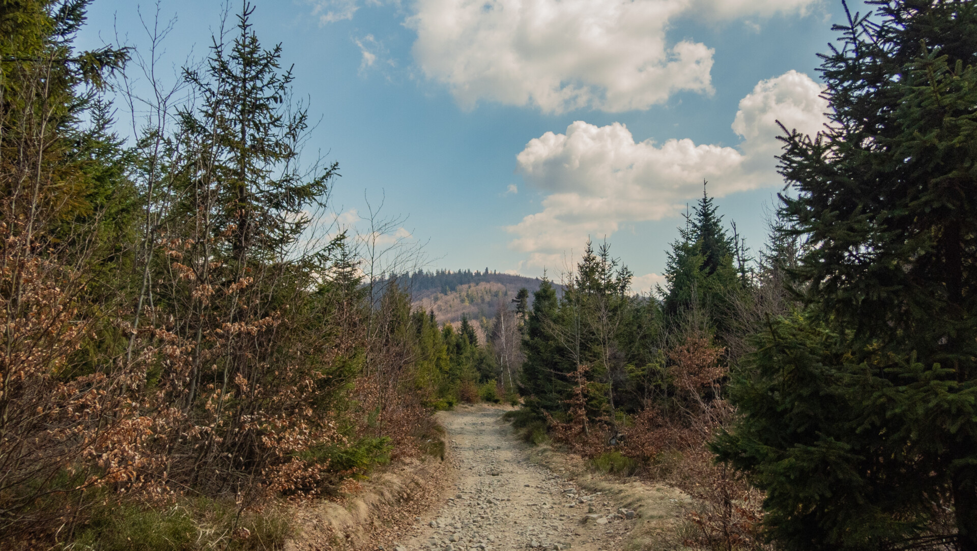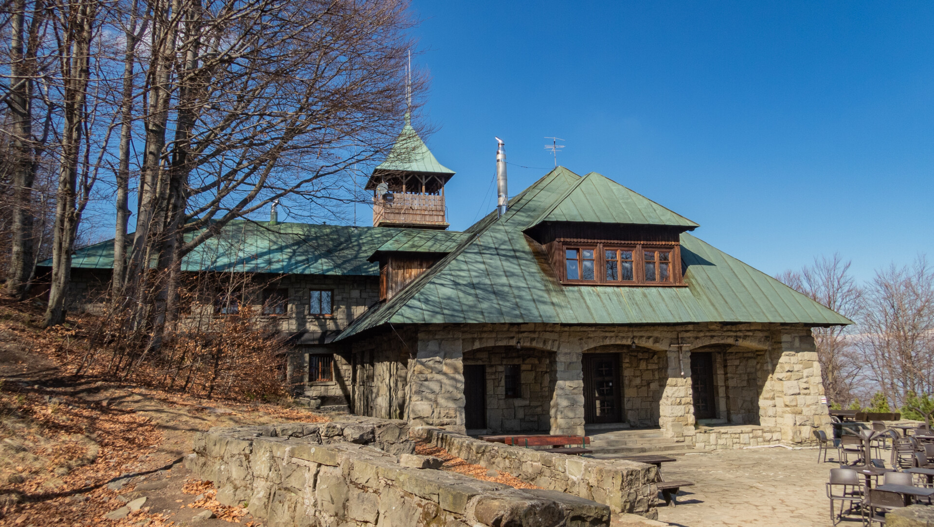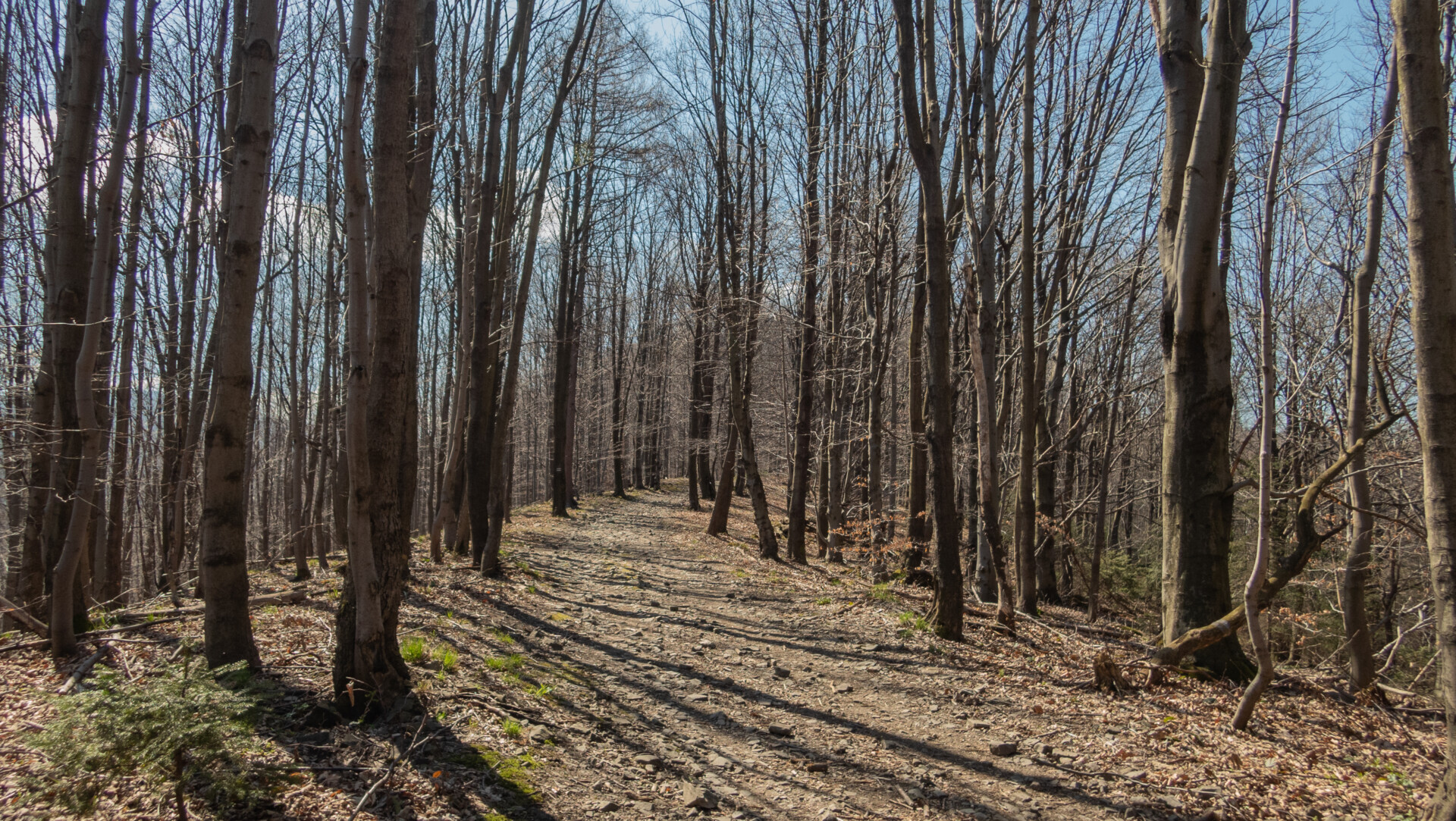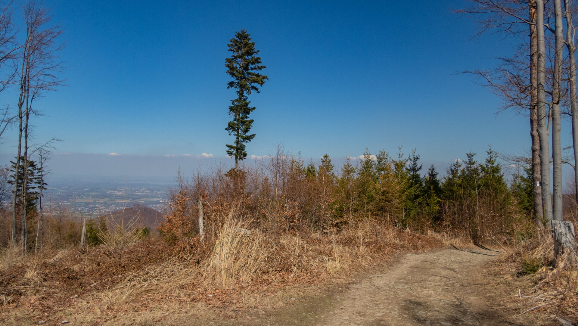 Po dotarciu pod Palenicę (sam wierzchołek leży lekko na lewo od szlaku), szlak zmienił charakter: szeroki dukt, lekko opadający i wznoszący się, bardzo wygodny do marszu. Po drodze minąłem Kopany (690 m n.p.m.), Wysokie (756 m) – obok którego znajduje się Leśny Kościół w Jaworzu, ale zapomniałem o nim i tam nie dotarłem – dalej Przykra (824 m), Dom Drwali i… już. Po niespełna siedmiu kilometrach marszu dotarłem do Schroniska PTTK na Błatniej. Przyjemne miejsce – o dziwo, nie było tu tłumów, a z głośników zwiewnie sączył się… jazz! Po 45-minutowej przerwie z ciepłym posiłkiem ruszyłem dalej.