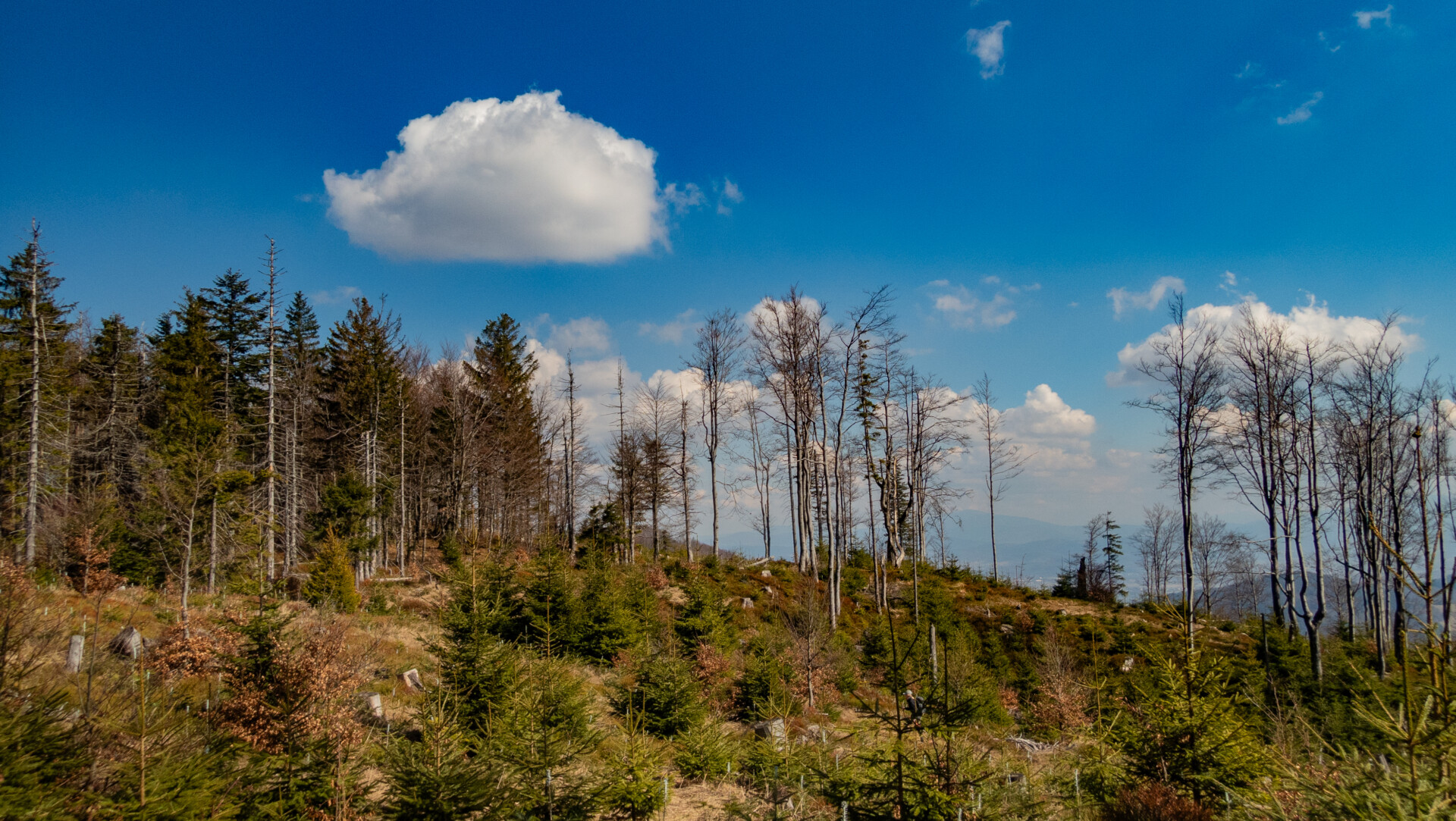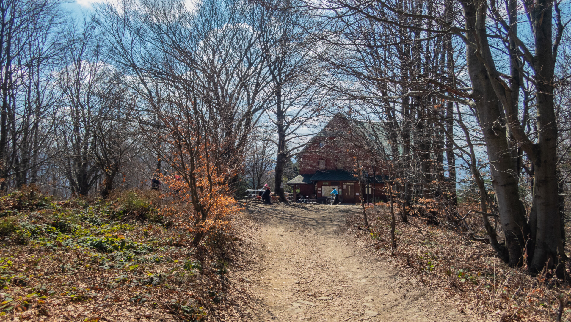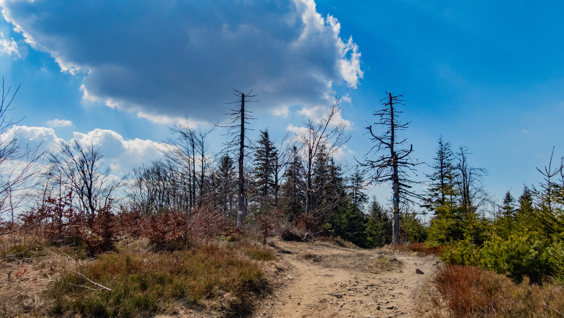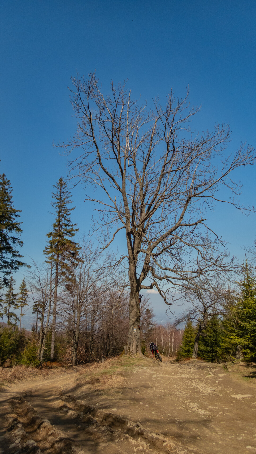 Po dotarciu pod Palenicę (sam wierzchołek leży lekko na lewo od szlaku), szlak zmienił charakter: szeroki dukt, lekko opadający i wznoszący się, bardzo wygodny do marszu. Po drodze minąłem Kopany (690 m n.p.m.), Wysokie (756 m) – obok którego znajduje się Leśny Kościół w Jaworzu, ale zapomniałem o nim i tam nie dotarłem – dalej Przykra (824 m), Dom Drwali i… już. Po niespełna siedmiu kilometrach marszu dotarłem do Schroniska PTTK na Błatniej. Przyjemne miejsce – o dziwo, nie było tu tłumów, a z głośników zwiewnie sączył się… jazz! Po 45-minutowej przerwie z ciepłym posiłkiem ruszyłem dalej.