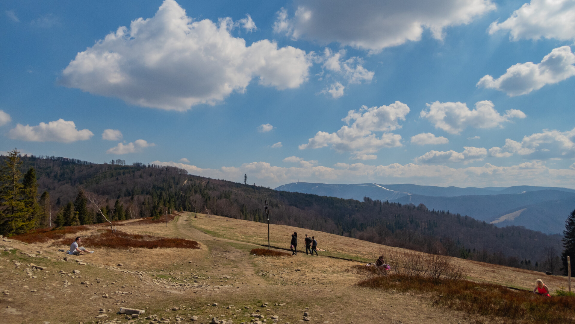 Kolejne 4,5 kilometra w stronę Klimczoka żółtym szlakiem okazało się klasyczną górską sinusoidą w łagodnym wydaniu. Po symbolicznym szczycie Błatniej (oznaczonym tronem) szlak opadał lekko na Polanę Stołówkę, którą Wikipedia opisuje jako jedną z najpiękniejszych panoram w Beskidzie Śląskim – coś w tym rzeczywiście było. Dalej czekało mnie spokojne podejście na Stołów (1035 m n.p.m.), potem krótki spadek w stronę rozdroża nad Jaskinią Dującą. Kolejny kilometr to znów lekka wspinaczka na Trzy Kopce (1082 m), po której znów schodziłem do skrzyżowania szlaków żółtego z czarnym. Ostatni fragment sinusoidy – podejście na Klimczok (1117 m n.p.m.). Pogoda dopisywała – krótkie spodenki i termoaktywny longsleeve w zupełności wystarczyły – więc dystans 4,3 km z Błatniej na Klimczok pokonałem w godzinę, z krótkimi postojami na zdjęcia. Przyjemny górski spacer.