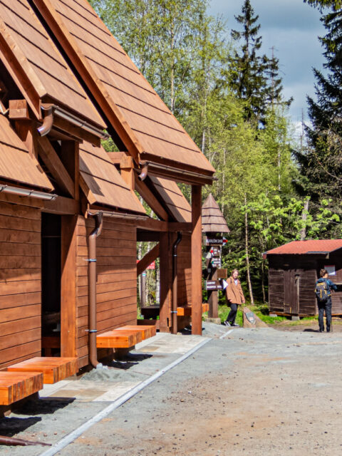 📍 Start i parking – Trasa rozpoczyna się na górnym parkingu tuż przy wejściu do Błędnych Skał (ok. 850 m n.p.m.). Wjazd odbywa się w systemie wahadłowym: wjazdy o pełnej godzinie, zjazdy o wpół do – każdorazowo przez 15 minut. Alternatywnie można zaparkować na dolnym parkingu przy Polanie Imka (YMCA) i podejść niebieskim szlakiem – ok. 3,5 km i 230 m przewyższenia (1–1,5 h marszu). Górny parking ma ograniczoną liczbę miejsc, ale dzięki stałej rotacji przy każdym cyklu zwykle zwalniają się wolne miejsca.