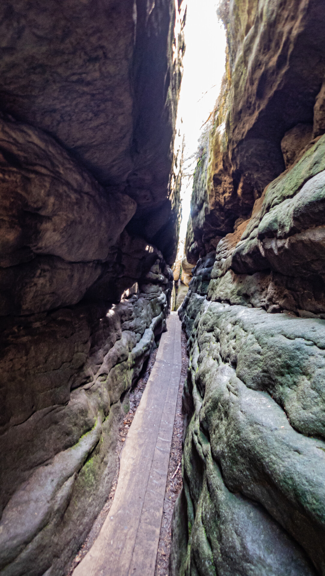 🔹 Ekspozycja: brak. Trasa prowadzi przez płaski, zamknięty labirynt skalny, bez otwartych przestrzeni ani przepaści. Nawet punkty widokowe znajdują się za barierkami lub w naturalnych wnękach skalnych. Nie występuje ryzyko upadku z wysokości ani wrażenie „przepaści pod nogami”.