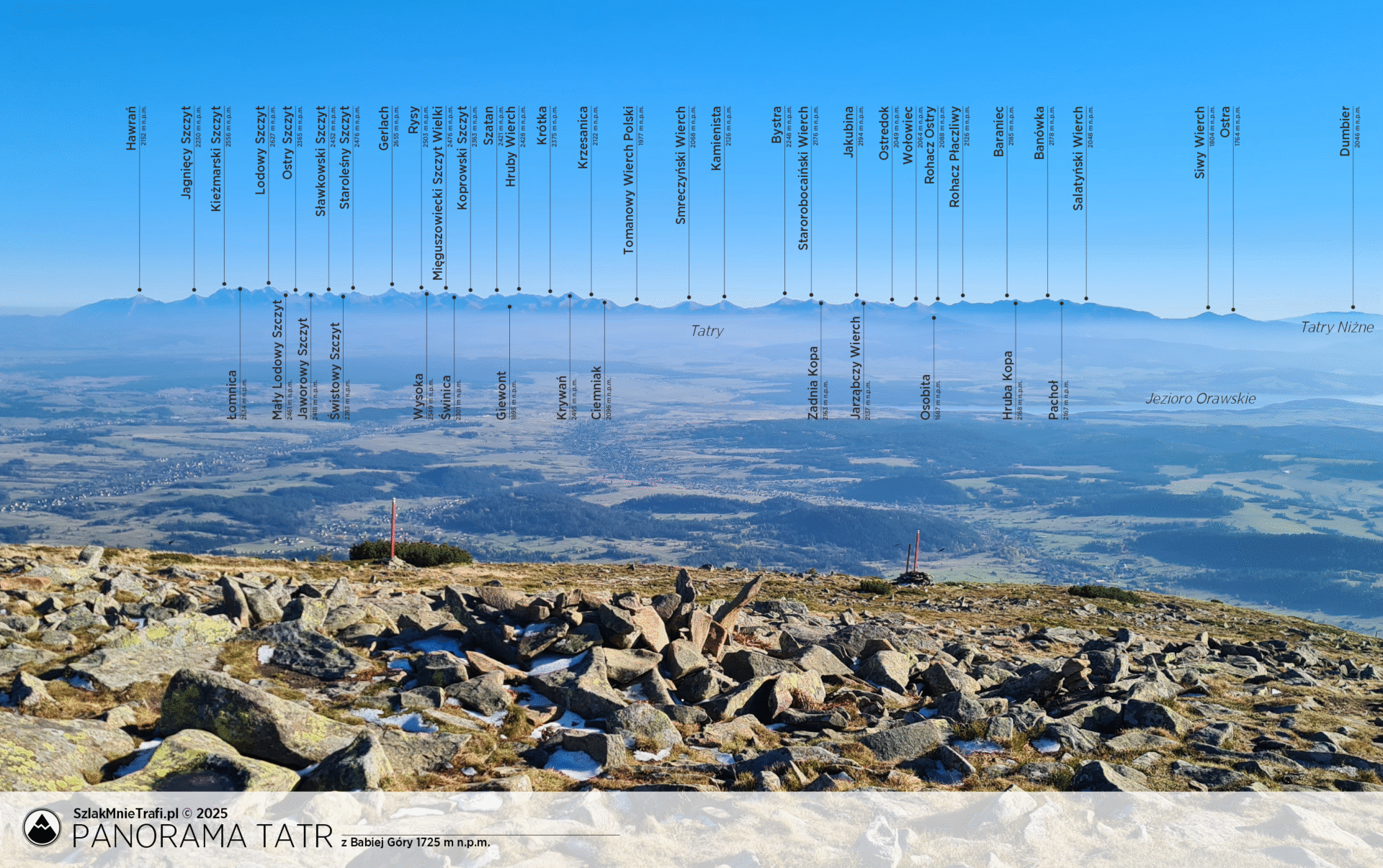 Kliknij na intersujący Cię punkt widokowy, aby zobaczyć panoramę z opisem szczytów. Klikając w miniaturę otworzy się zdjęcie w wysokiej rozdzielczości.