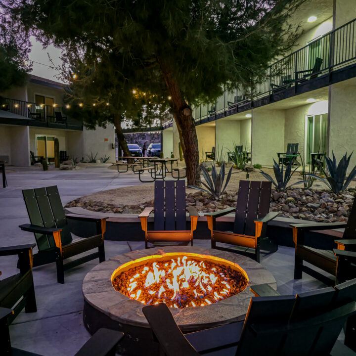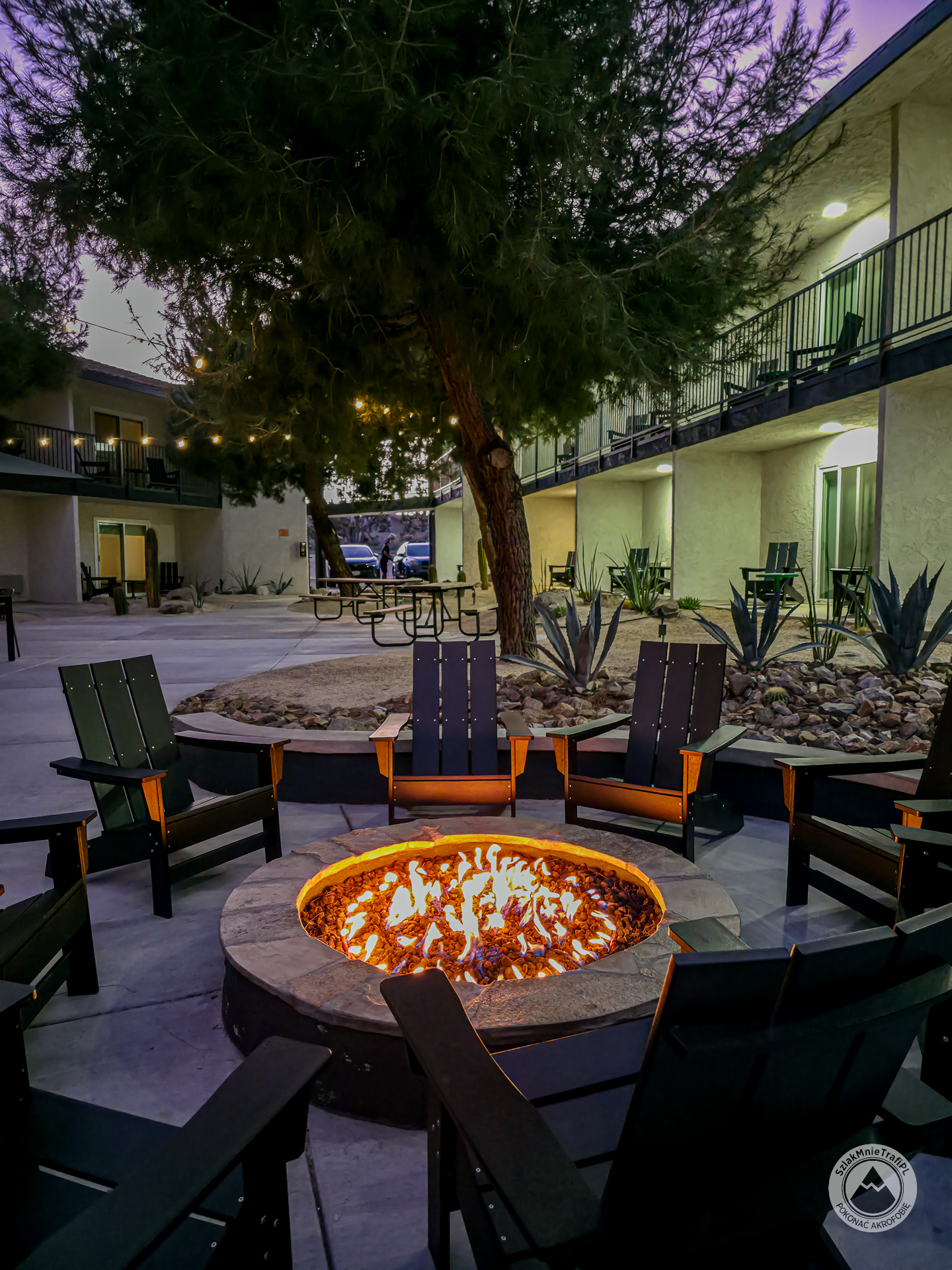 Ostatecznie wybrałem motel Field Station Joshua Tree w miejscowości Yucca Valley, oddalonej o około 20 kilometrów od zachodniego wjazdu do parku (West Entrance). To bardzo przyjemne, „mało-amerykańskie” miejsce, z patio i automatycznym ogniskiem – fajny vibe na chłodne styczniowe wieczory.