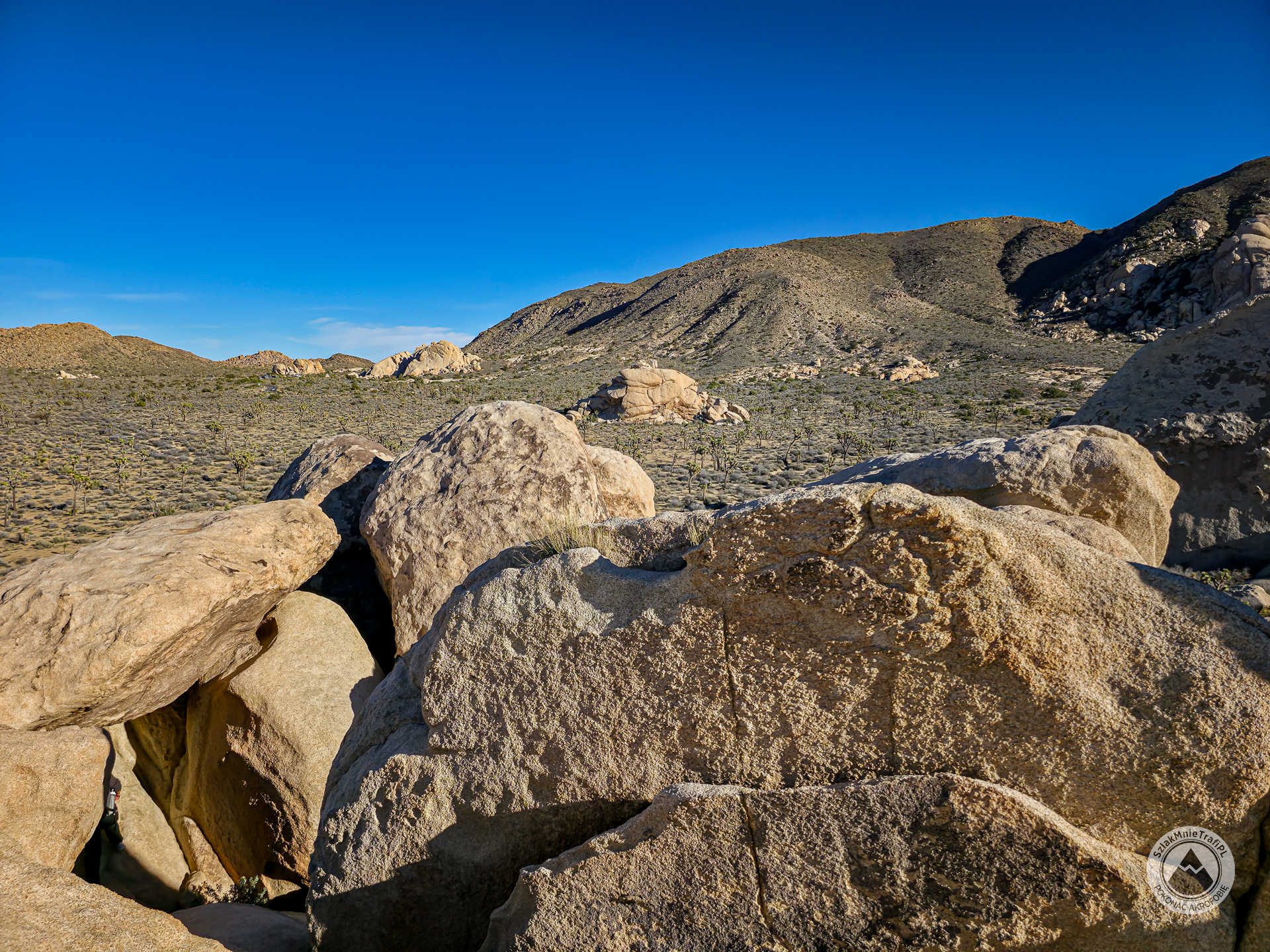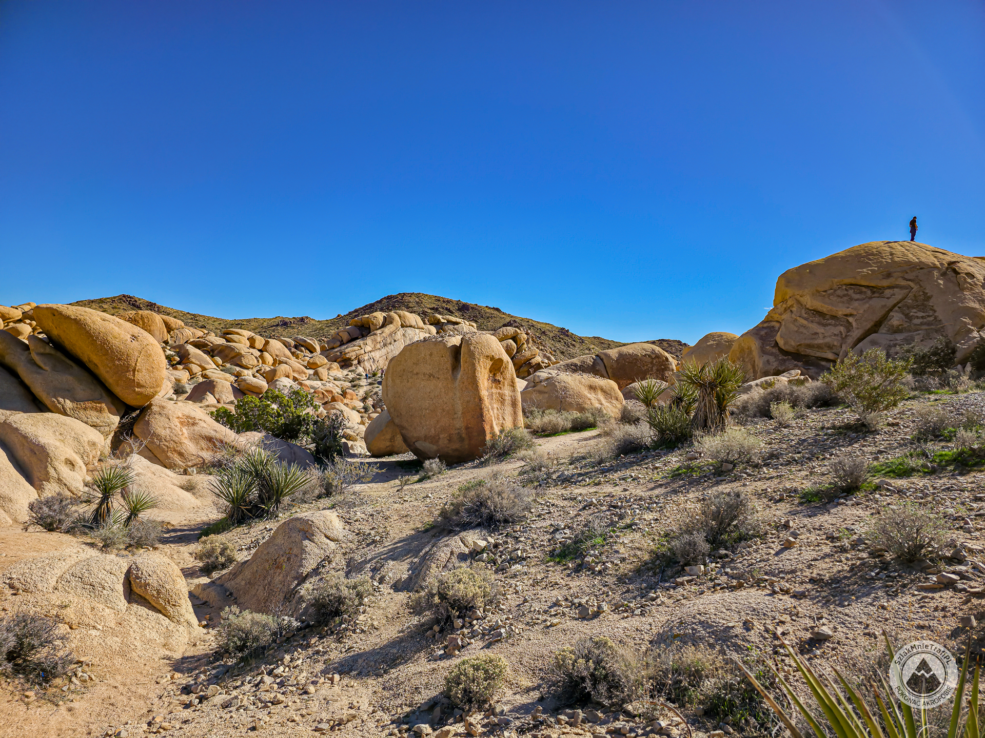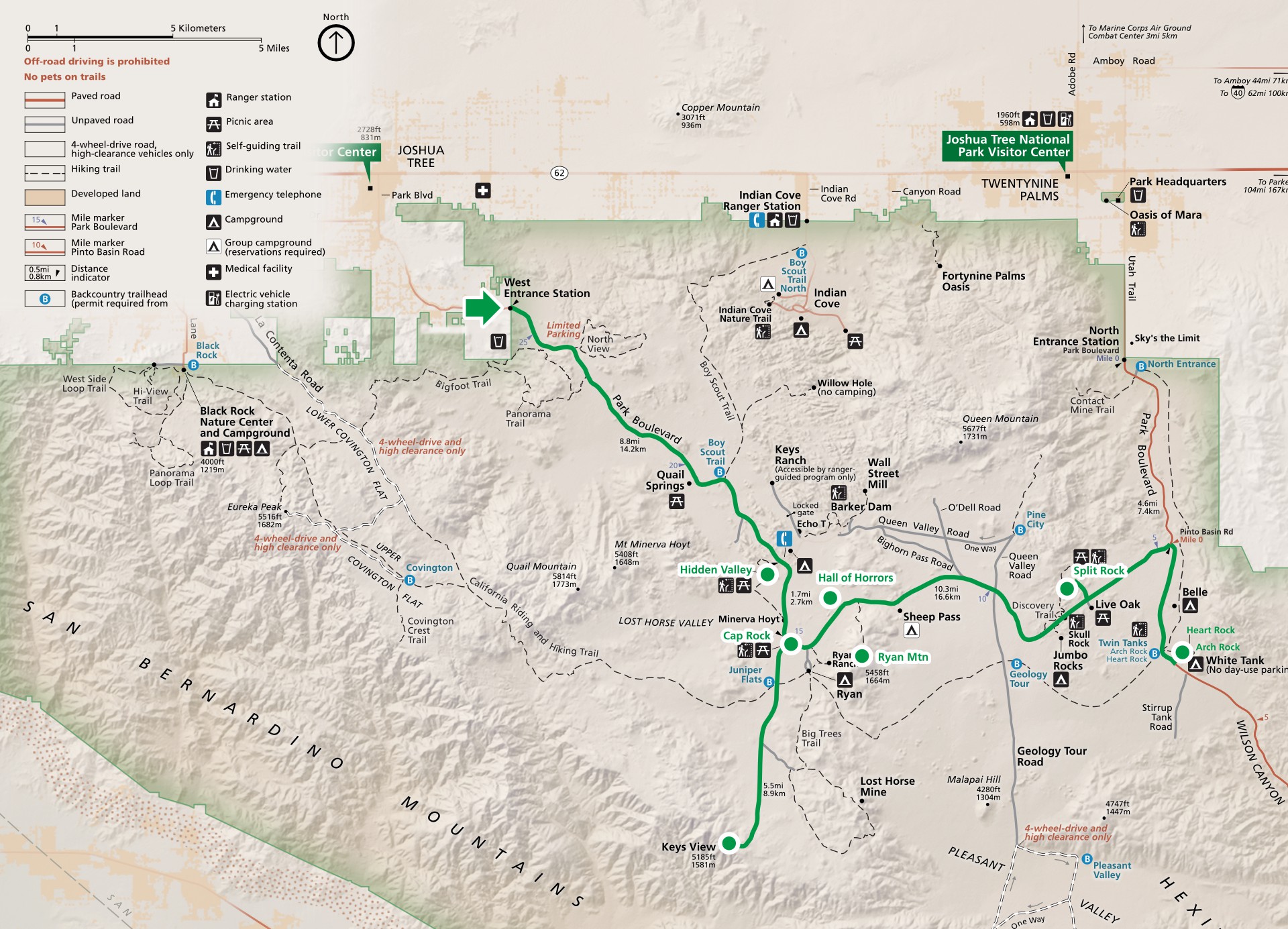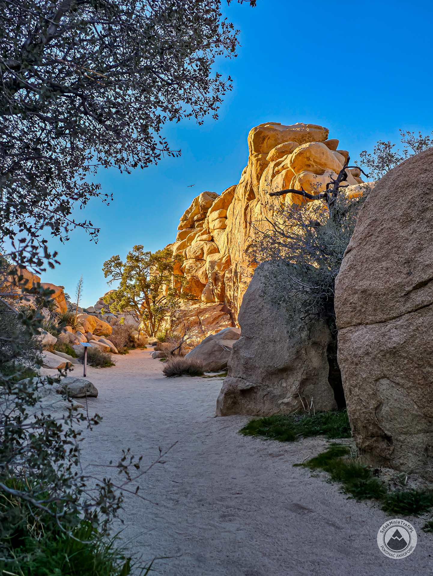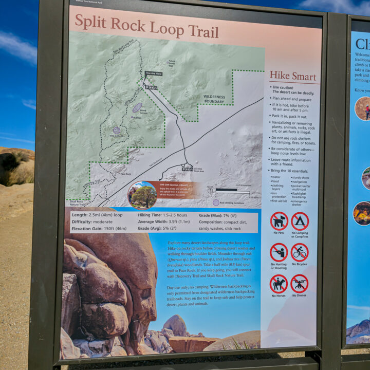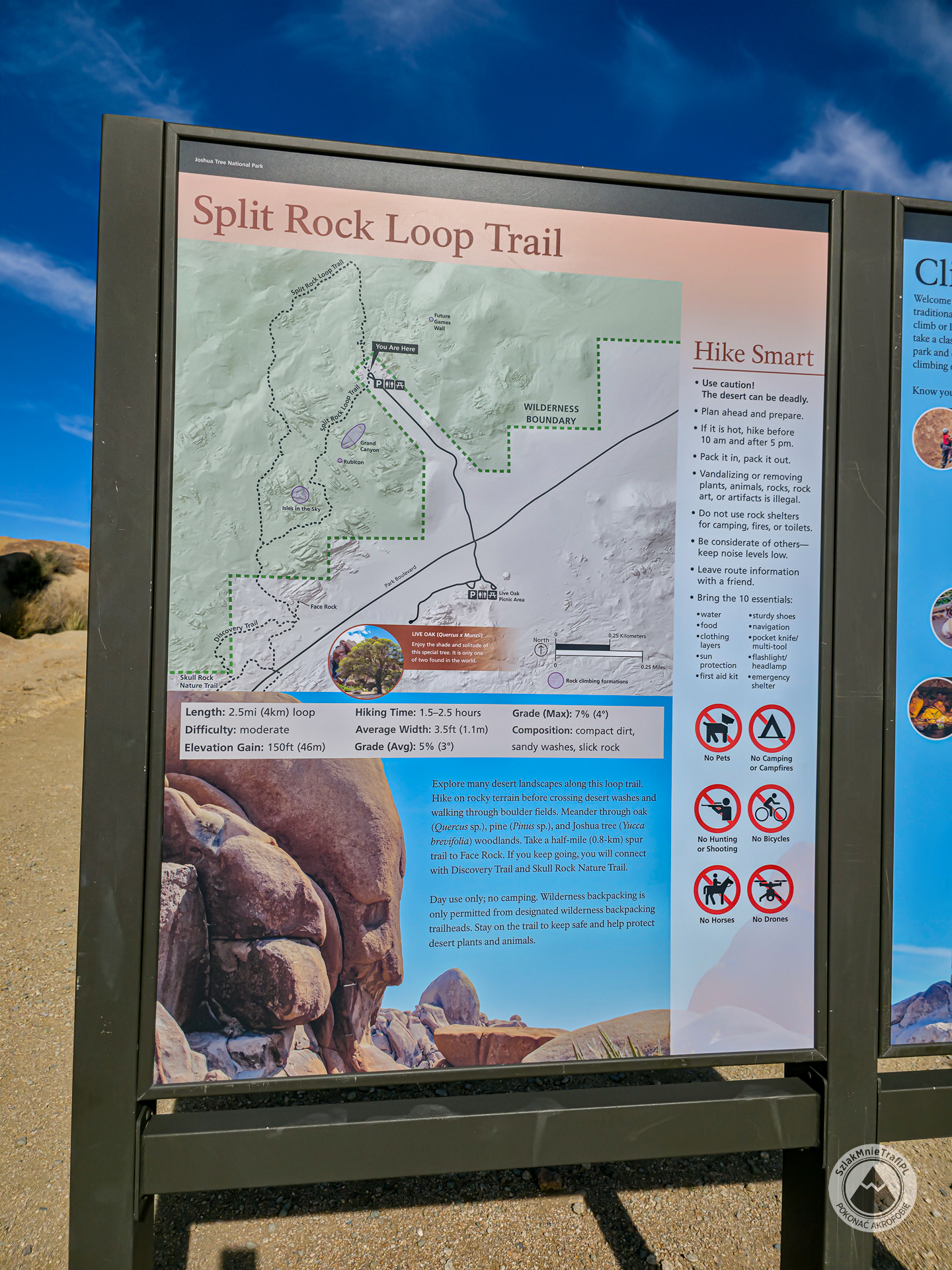 🚶♂️ Joshua Tree jest jednym z nielicznych parków narodowych w USA, które oficjalnie dopuszczają tzw. cross-country travel – można zejść ze szlaku, obejść formacje skalne, podejść pod nie, a nawet na nie wejść. Należy jednak przestrzegać lokalnych znaków i informacji na nich zawartych (np. na części szlaku Split Rock Loop obowiązywał zakaz schodzenia poza wyznaczoną ścieżkę). Kilka szlaków oznaczone na mapie literą B wymagają specjalnego zezwolenia, ale tylko dla osób poruszających się z po parku po zmroku z plecakiem z opcją obozowania w wyznaczonych miejscach. Dla tzw. dziennych turystów takie pozwolenia nie są potrzebne.