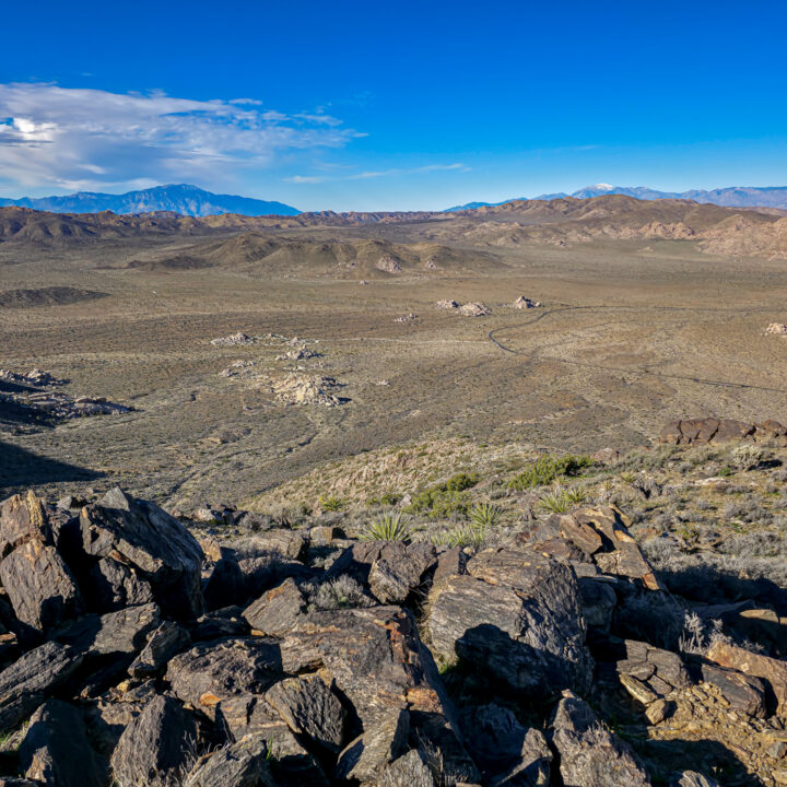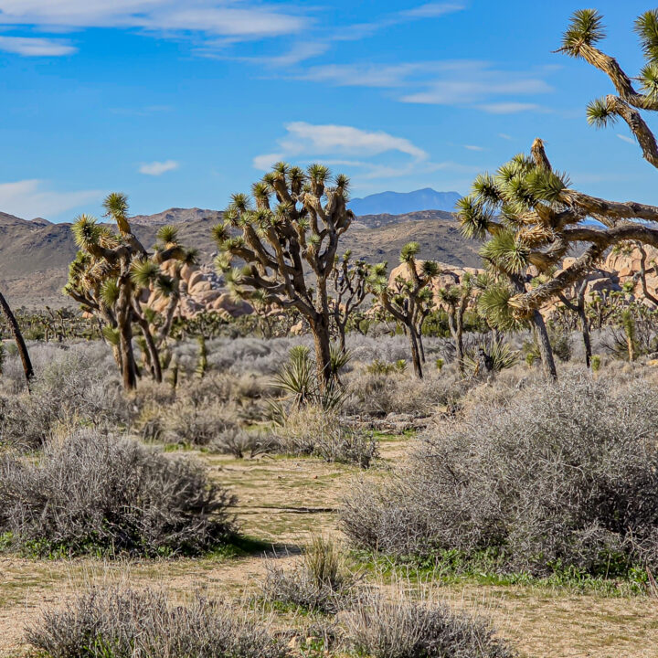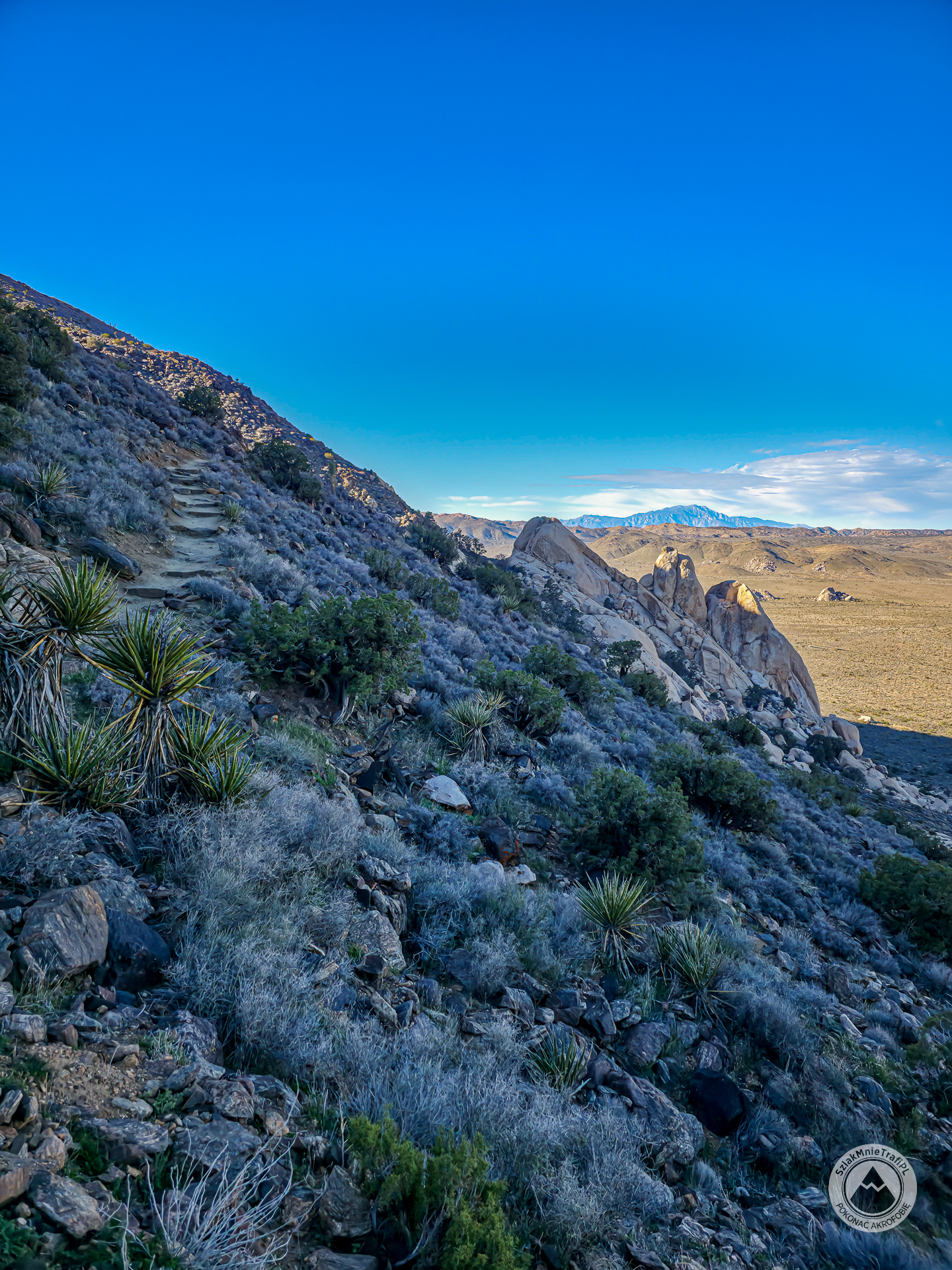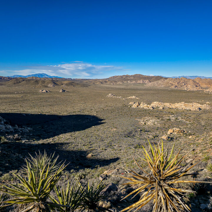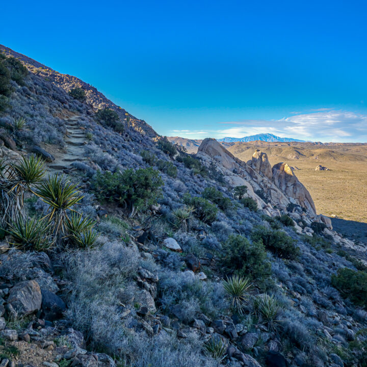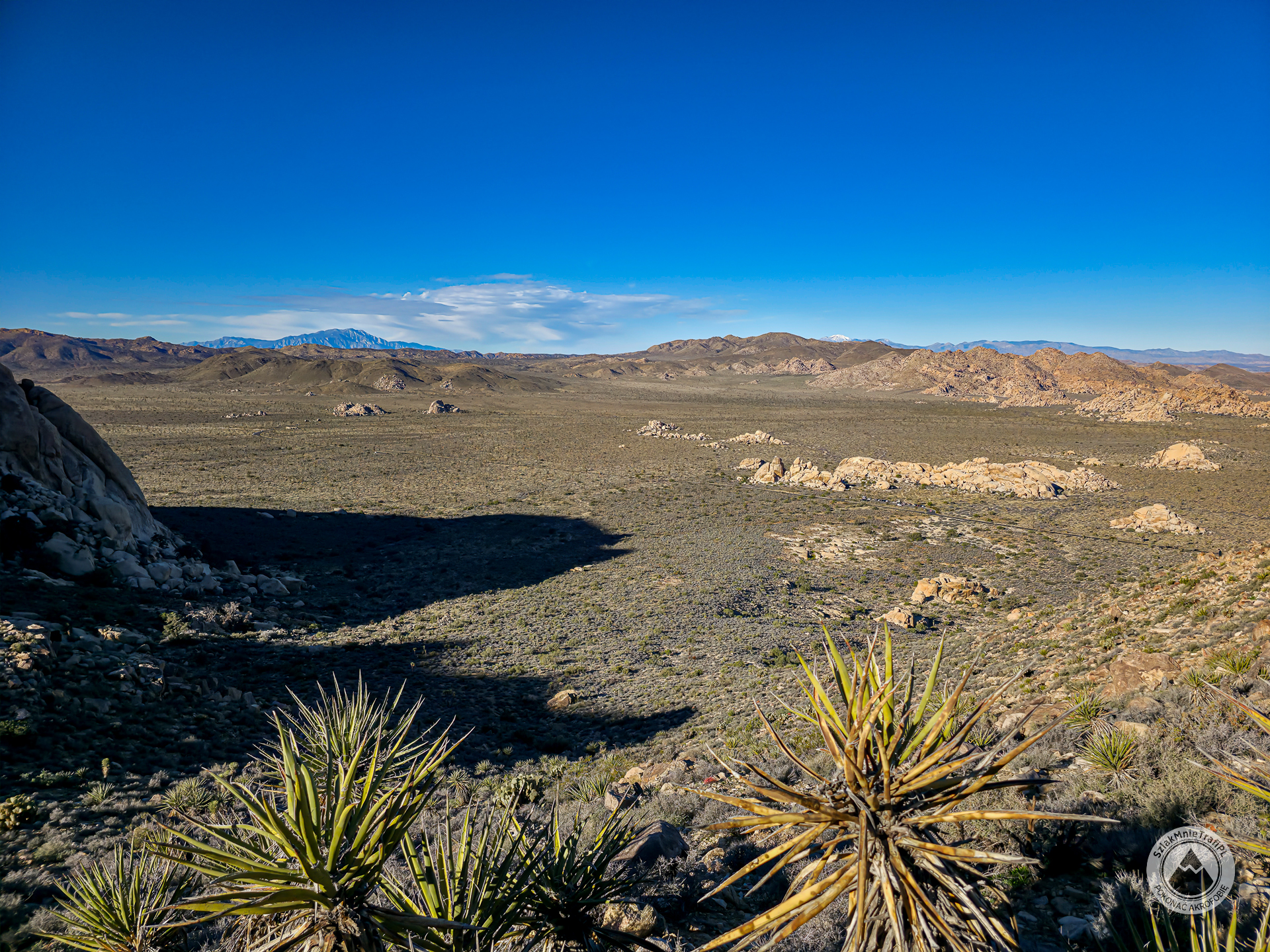 Styczniowym porankiem przez mniej więcej połowę trasy szliśmy w cieniu góry, ale mimo to szybko zrobiło się na tyle ciepło, że mój Wspólnik musiał zdjąć sweter. Z każdym kolejnym zakrętem krajobraz coraz bardziej oddalał się od wszystkiego, do czego przywykłem podczas górskich wycieczek w Europie. Zamiast dolin i lasów – płaska jak stół pustynia Mojave, porośnięta drzewami Jozuego, kaktusami cholla, opuncjami, jukami i larreą trójzębną. Z jasnego piasku co jakiś czas wyrastały jaśniejsze formacje monzogranitu, a na horyzoncie zamykały kadr pasma górskie z pojedynczymi, ośnieżonymi szczytami.
