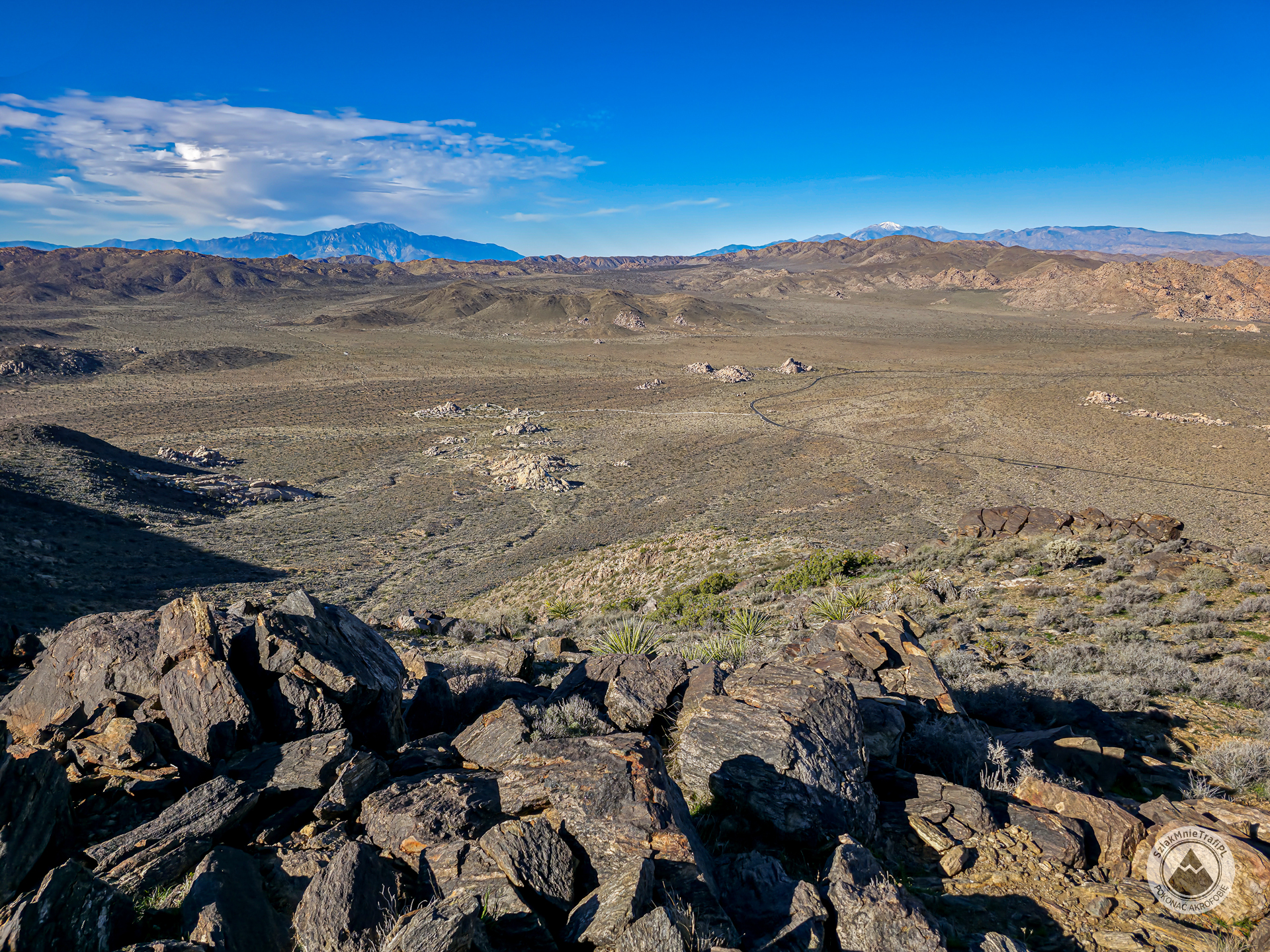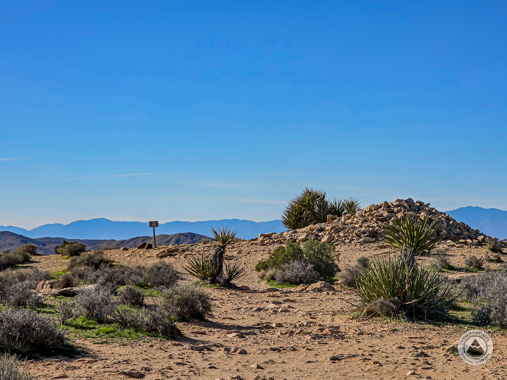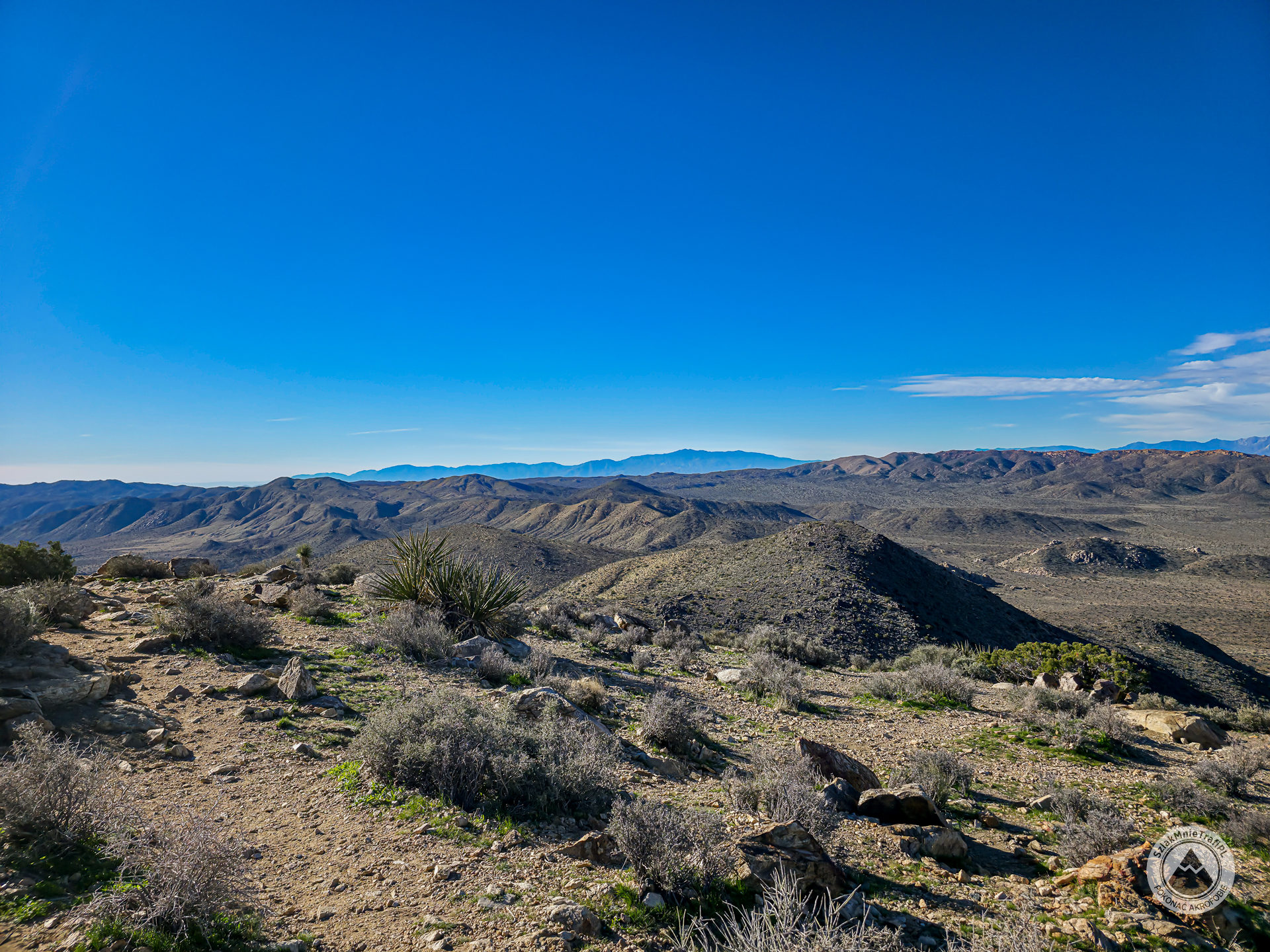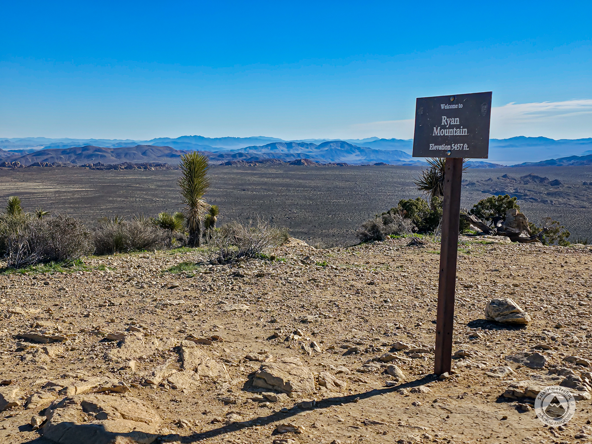 Na szczyt dotarliśmy zgodnie z przewidywaniami bez większych problemów. Tempo dostosowane do Wspólnika pozwoliło nam wejść na Ryan Mountain w 50 minut. Choć słońce przyjemnie grzało, na wierzchołku (*5458 ft) przywitał nas dość silny, wychładzający wiatr. Góra sprawia wrażenie samotnej wyspy pośrodku pustyni, otoczonej po horyzont pasmami górskimi.