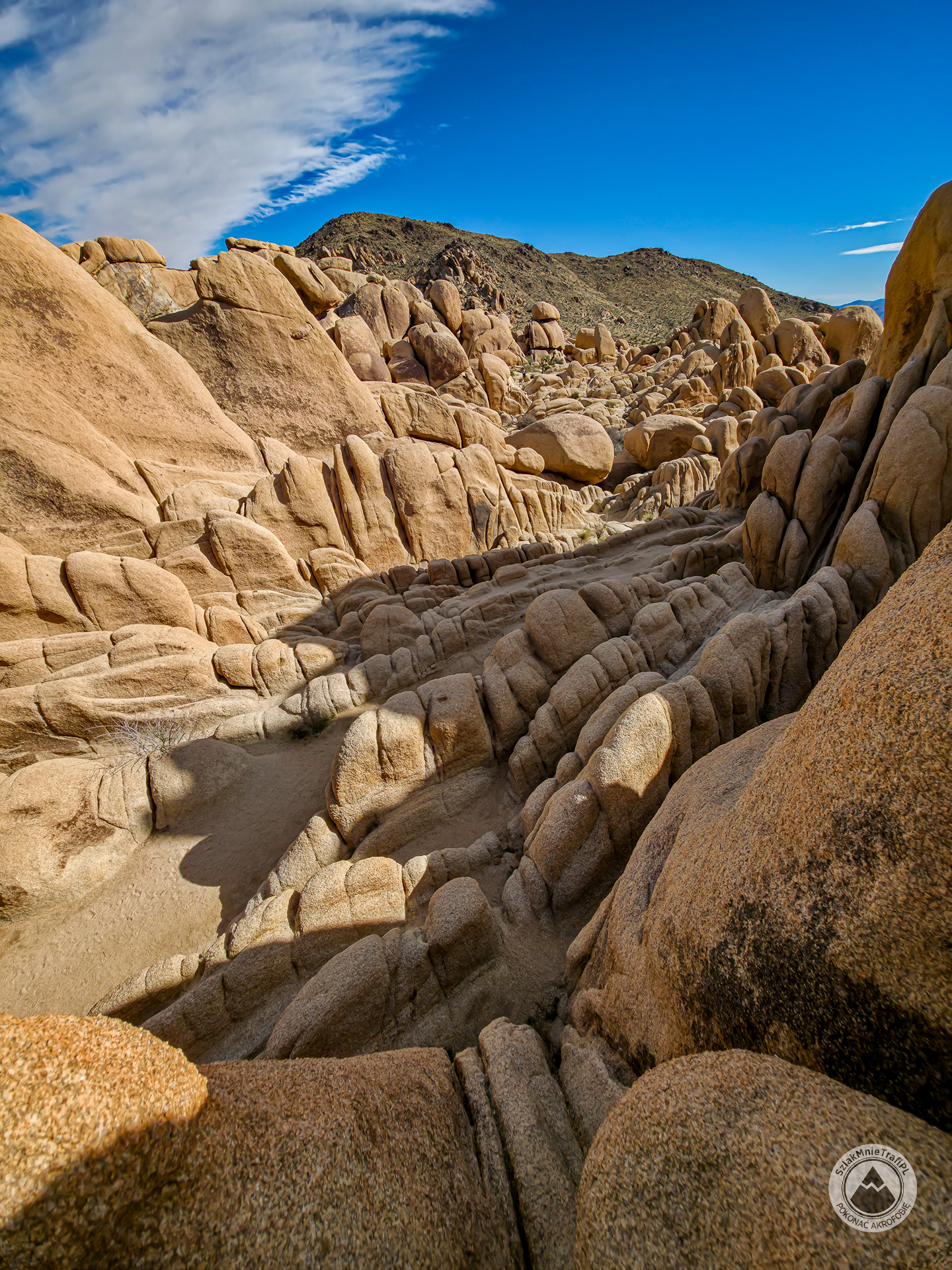 Czas do zachodu słońca nieubłaganie się kurczył i było jasne, że przed Keys View zdążymy już tylko w jedno miejsce. Wybór padł na Hidden Valley, oddaloną od Cap Rock o niecałe 10 minut jazdy samochodem. Przy jednokierunkowym parkingu, mimo że było już około 15:40, nadal panował spory ruch. Mój Wspólnik, dopadnięty jet lagiem, został w samochodzie na krótką drzemkę, a ja ruszyłem sam — z tą charakterystyczną ekscytacją, która pojawia się zawsze, gdy wiem, że trafiłem w dobre miejsce.