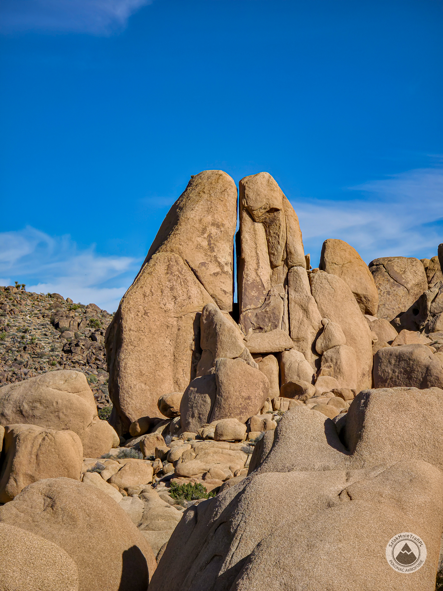 Split Rock Trail tworzy pętlę zaczynającą się tuż przy parkingu. Intuicyjnie wybrałem kierunek północny, co później okazało się bardzo dobrym wyborem. Do dziś nie wiem, jakim cudem na początku przeoczyłem samą Split Rock – potężny monzogranitowy głaz rozłupany idealnie pionową szczeliną na całej wysokości. Leży dosłownie przy wejściu na szlak. Chwilę później, widząc w oddali strzelistą Frigid Tower, byłem święcie przekonany, że to właśnie od niej pochodzi nazwa trasy. Pustynia skutecznie potrafi oszukać percepcję.
