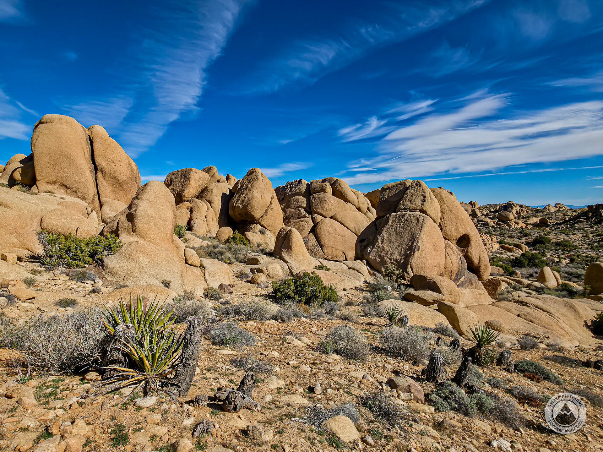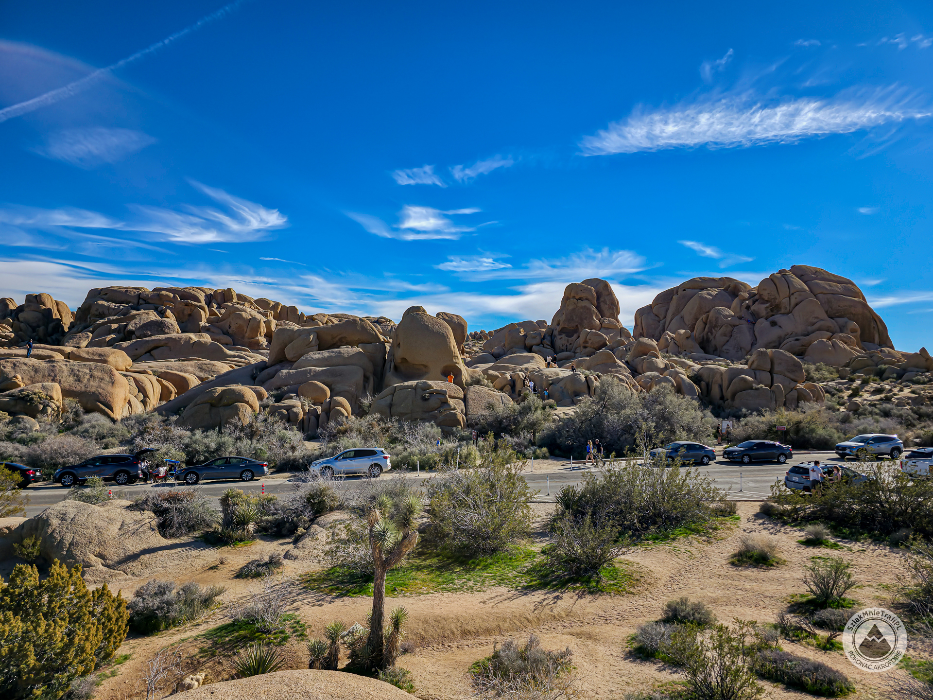 Cap Rock znajduje się tuż przy skrzyżowaniu Park Boulevard i Keys View Road. To niewielki kompleks czterech formacji skalnych: Cap Rock, Top Hat Rock, John Yablonski Rock oraz przylegających do nich mniejszych Eff Rocks. Parking jest stosunkowo duży jak na warunki Joshua Tree i około 15:20 bez problemu znaleźliśmy miejsce, choć ludzi kręciło się w okolicy całkiem sporo.
