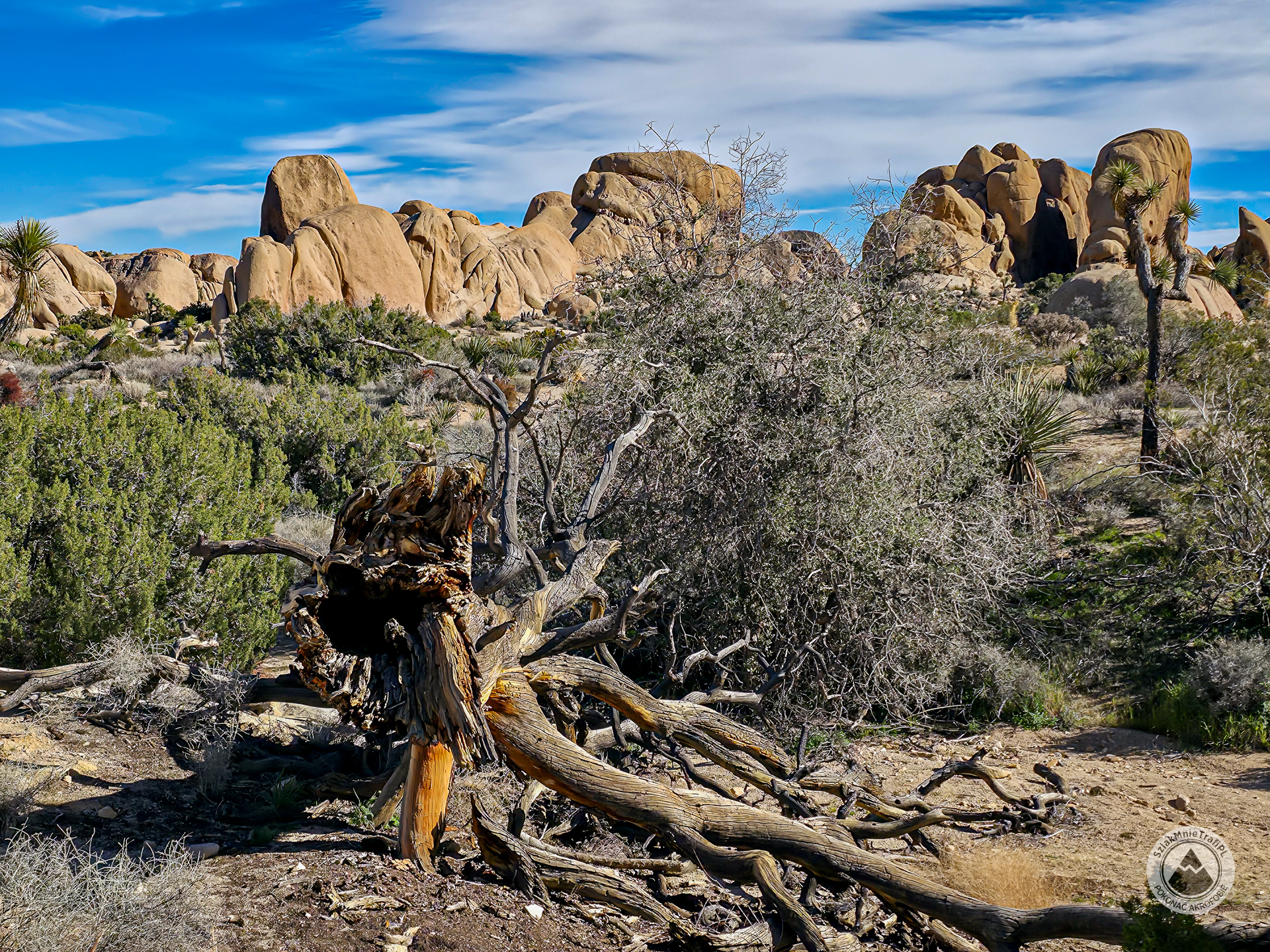Z czasem ścieżka zaczęła się wić, a skalne formacje znów wysunęły się na pierwszy plan. Krajobraz urozmaicały czarne, poskręcane pnie drzew – pozostałości po jałowcach kalifornijskich zniszczonych przez dawny pożar. W ekstremalnie suchym klimacie martwe drewno nie gnije, lecz ulega naturalnej mumifikacji. Zwęglone konary trwają tu przez dekady, tworząc filmowy kontrast z jasnym monzogranitem.