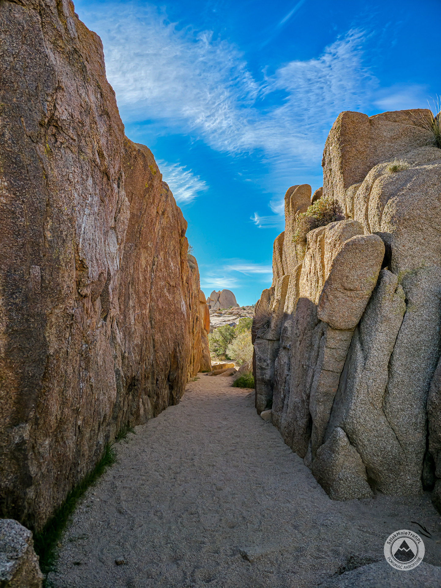 Do doliny prowadzi jedna ścieżka przechodząca przez szeroką skalną bramę. Po pokonaniu niewielkiego przewyższenia i około stu metrach marszu krajobraz nagle się otwiera. Ukazuje się owalna, pustynna kotlina, zamknięta ze wszystkich stron monzogranitowymi ścianami. W tym miejscu szlak tworzy pętlę — można ruszyć w dowolnym kierunku i po prostu dać się poprowadzić przestrzeni.