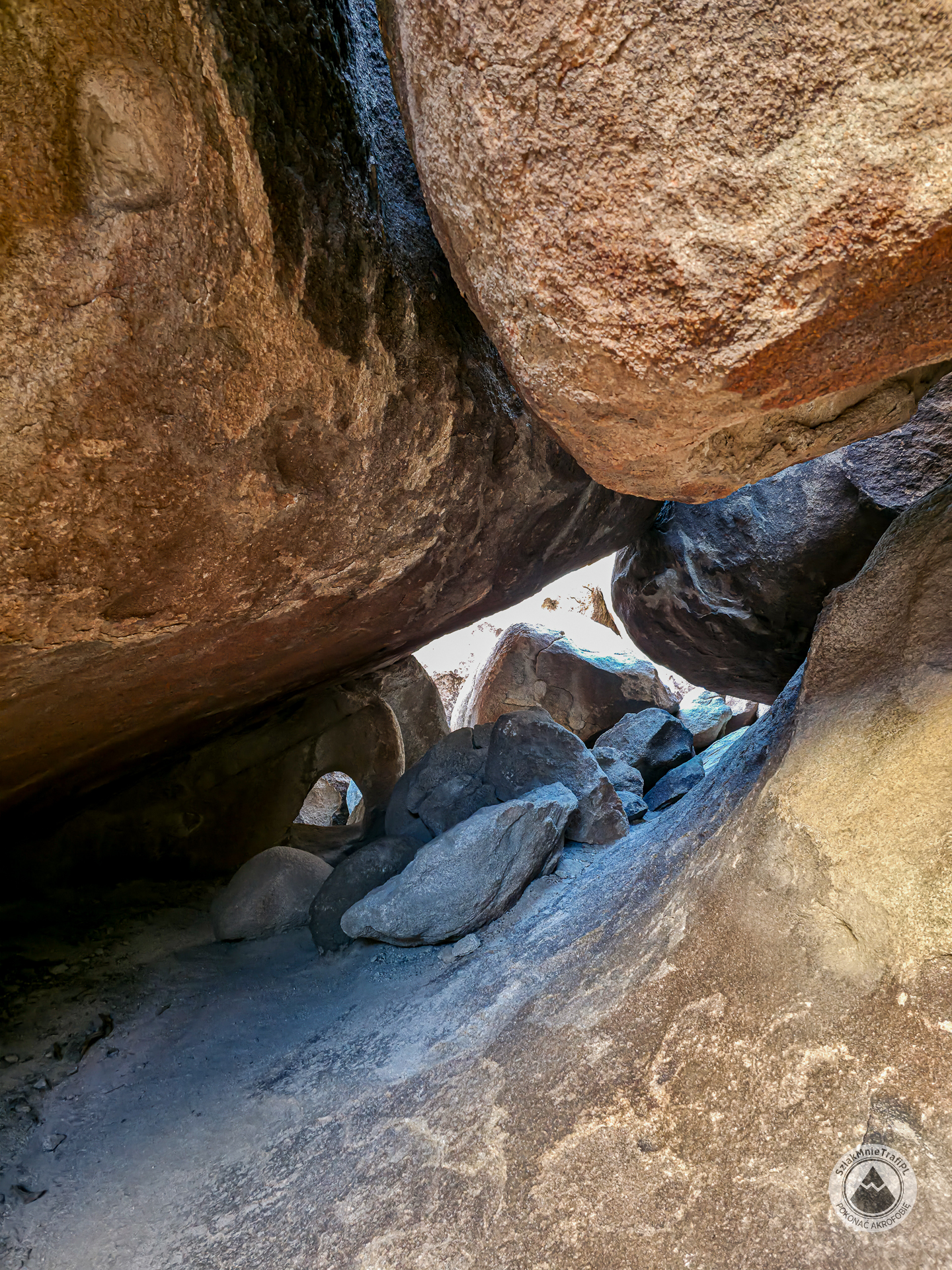 Zamiast wracać prosto do samochodu, skręciliśmy w stronę Indian Cave. Choć oficjalnie nie prowadzi tam wyznaczony szlak, wydeptana ścieżka jest wyraźna i zachęca do podejścia. Joshua Tree jest jednym z nielicznych parków narodowych w USA, które oficjalnie dopuszczają tzw. cross-country travel – można zejść ze szlaku, obejść formacje skalne, podejść pod nie, a nawet na nie wejść, o ile robi się to z głową i poszanowaniem terenu.