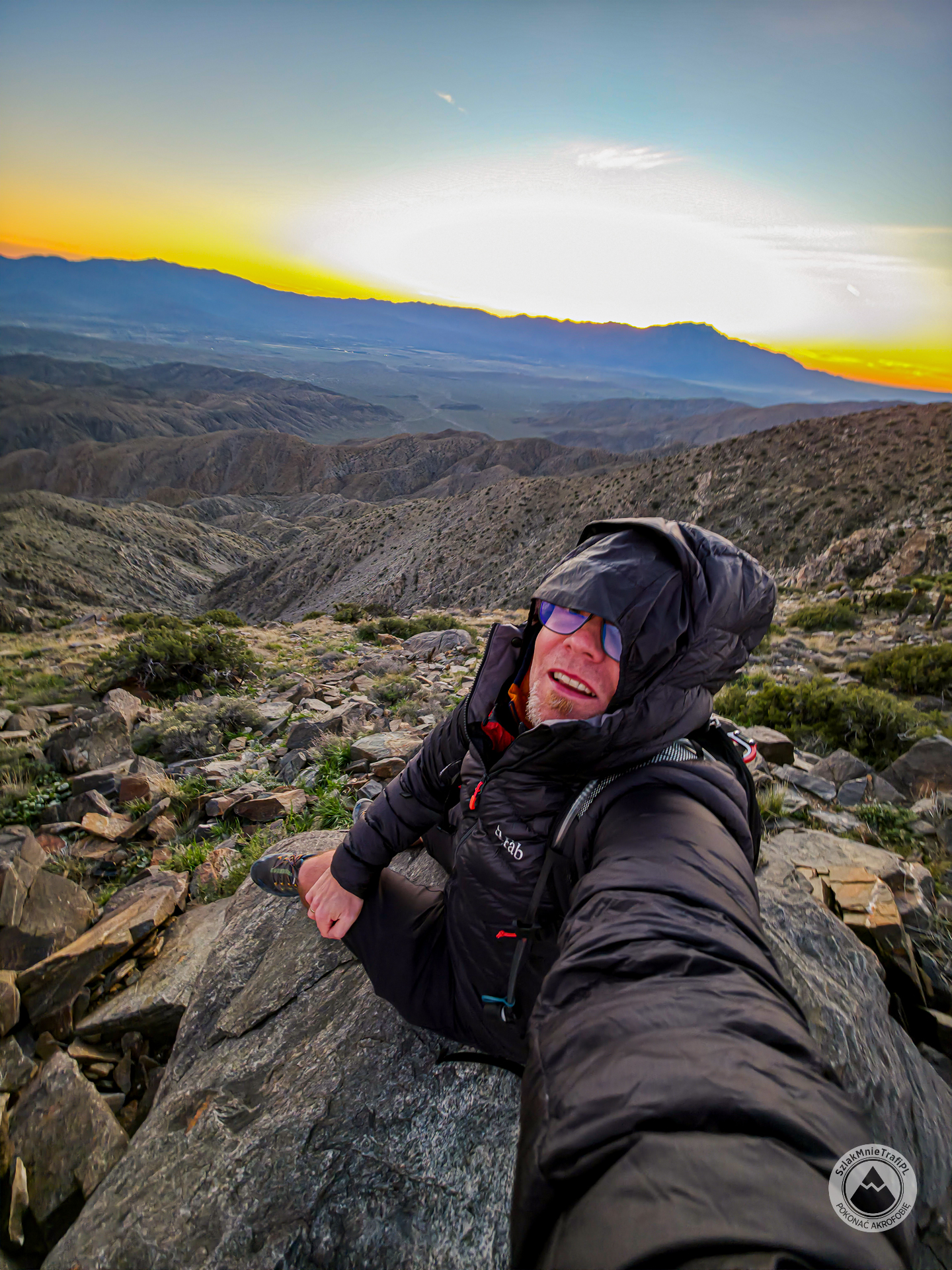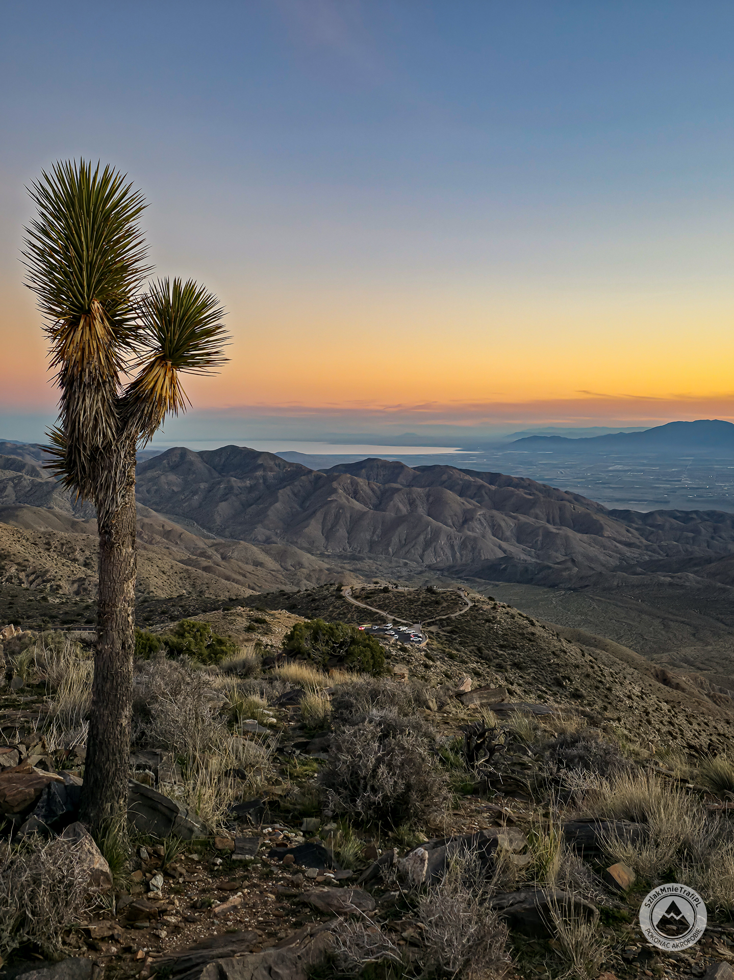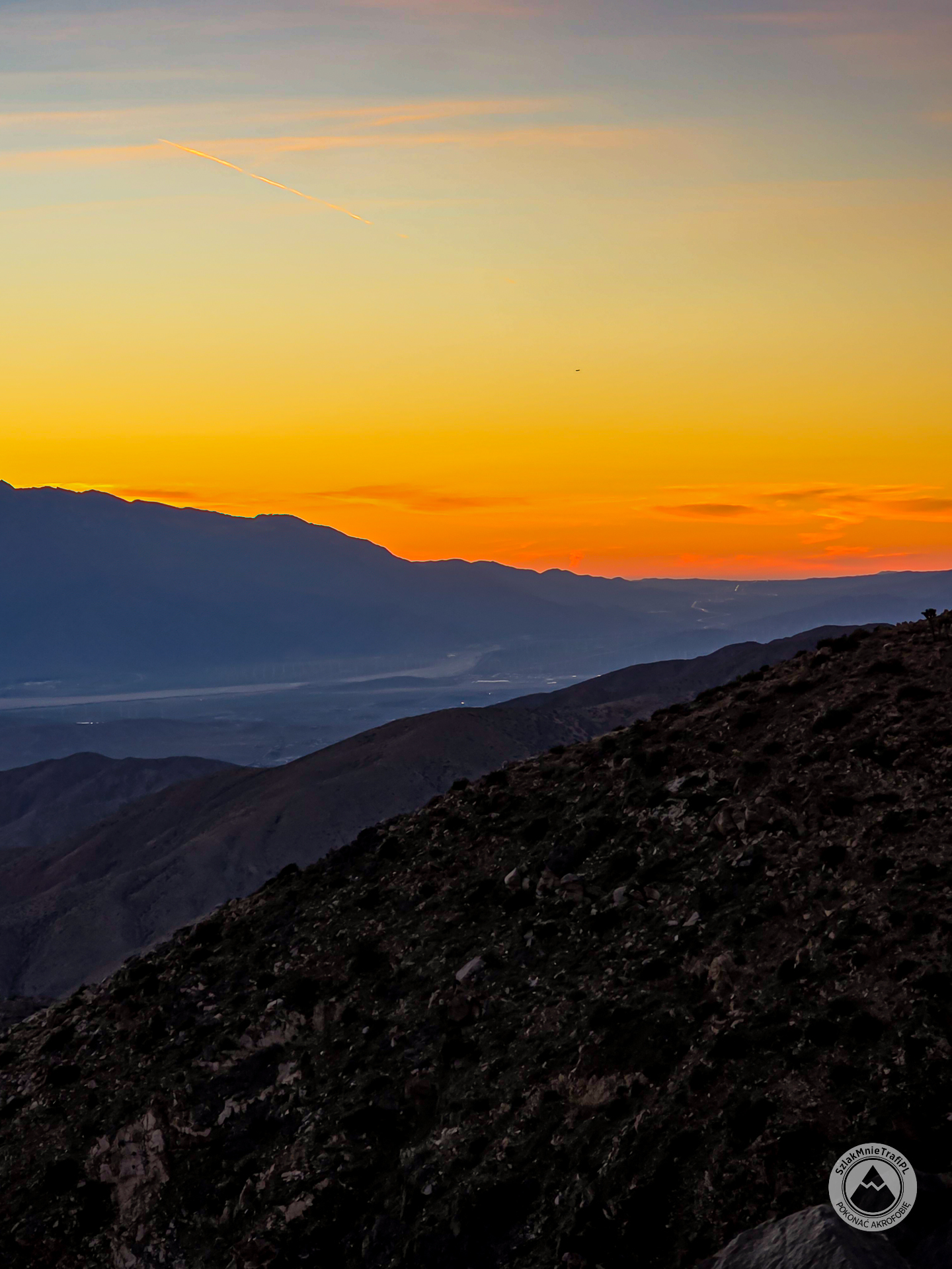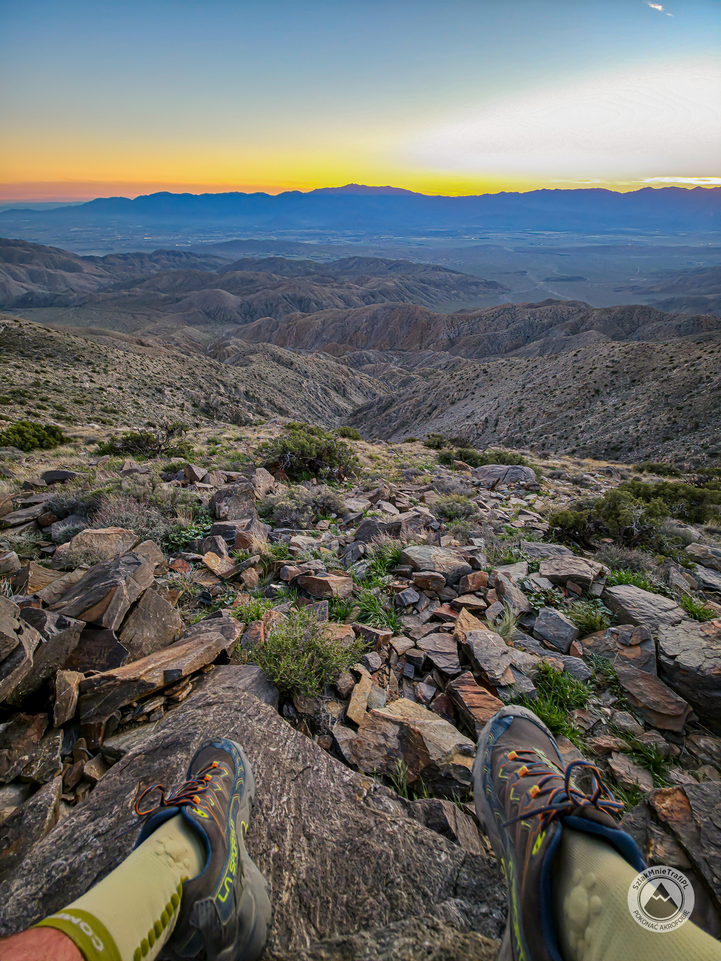 Z tego miejsca widok był podwójnie satysfakcjonujący. Z jednej strony zachód słońca obserwowany już bez tłumu, z drugiej — Keys View i Salton Sea widziane z góry, z zupełnie innej perspektywy. Dopiero później okazało się, że do właściwego wierzchołka Inspiration Peak pozostawał jeszcze prawie płaski kilometr, ale ten krótki sprint w pogoni za światłem i tak był dokładnie tym, czego w tamtej chwili potrzebowałem.