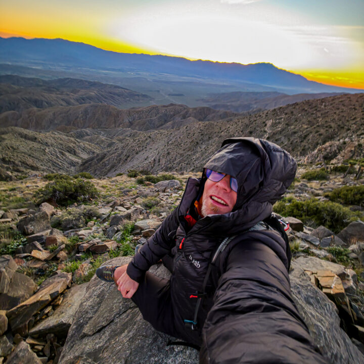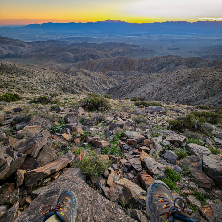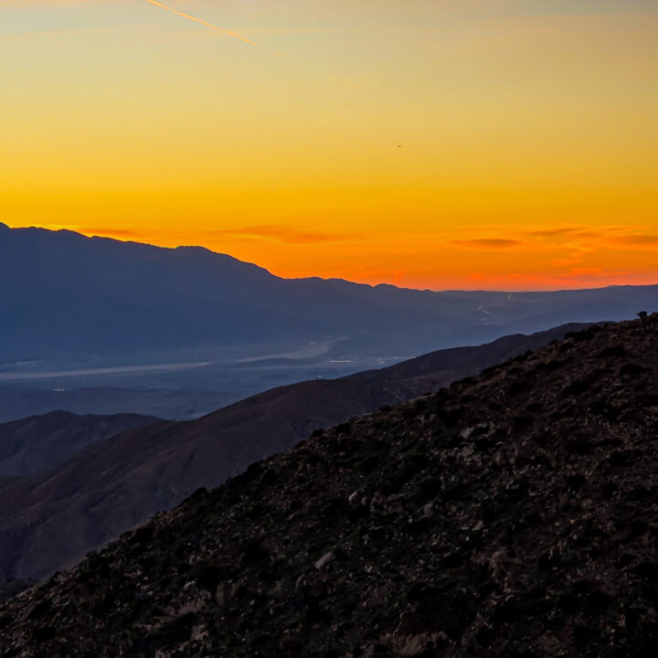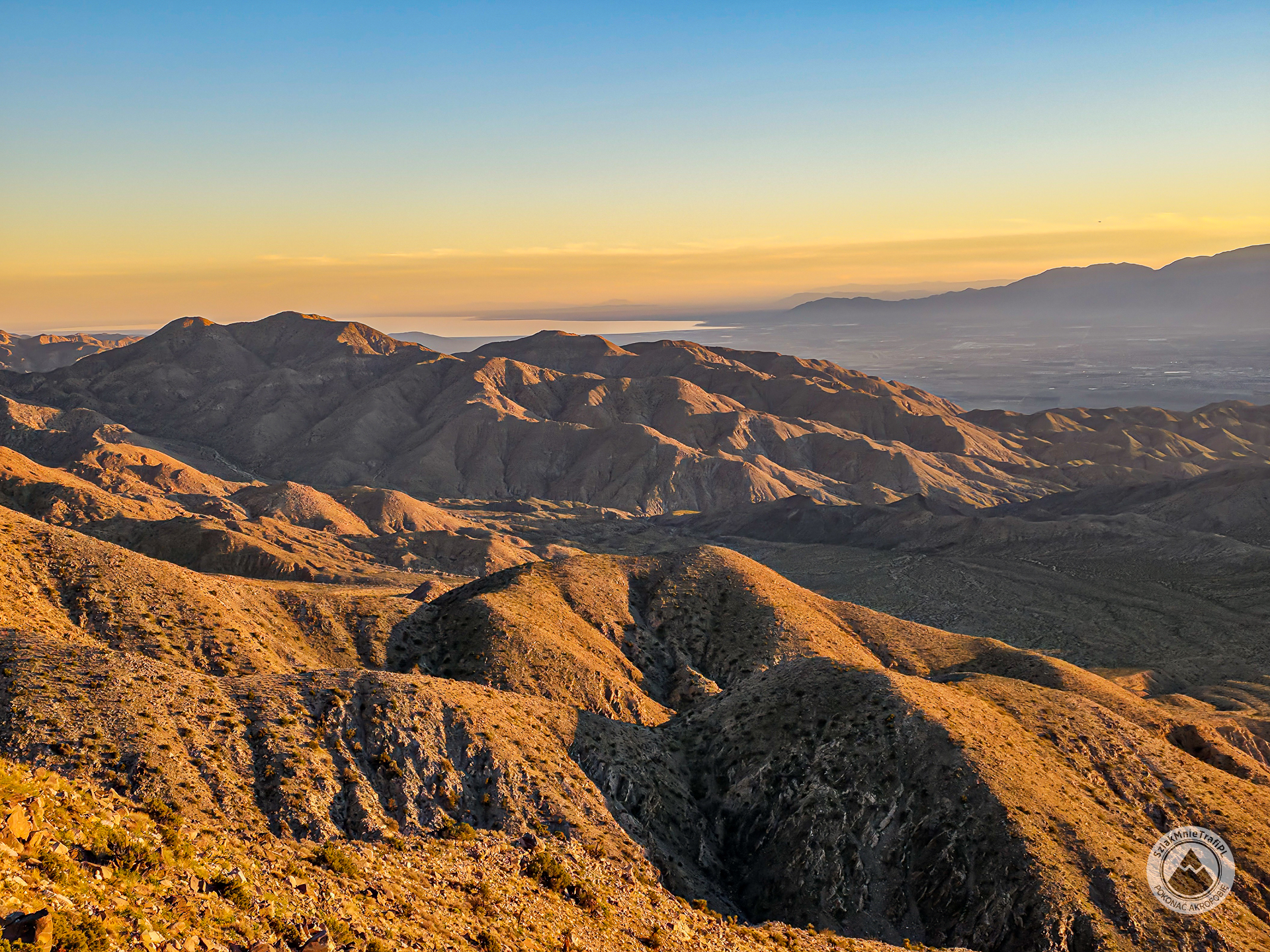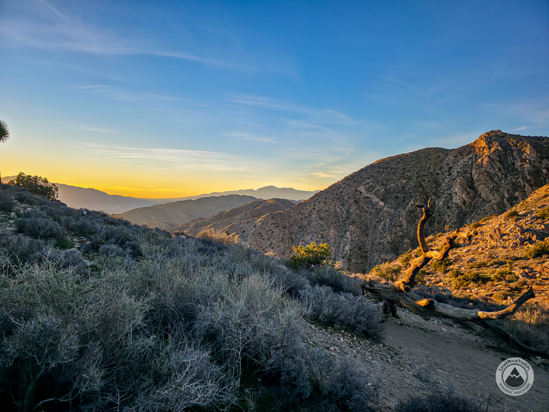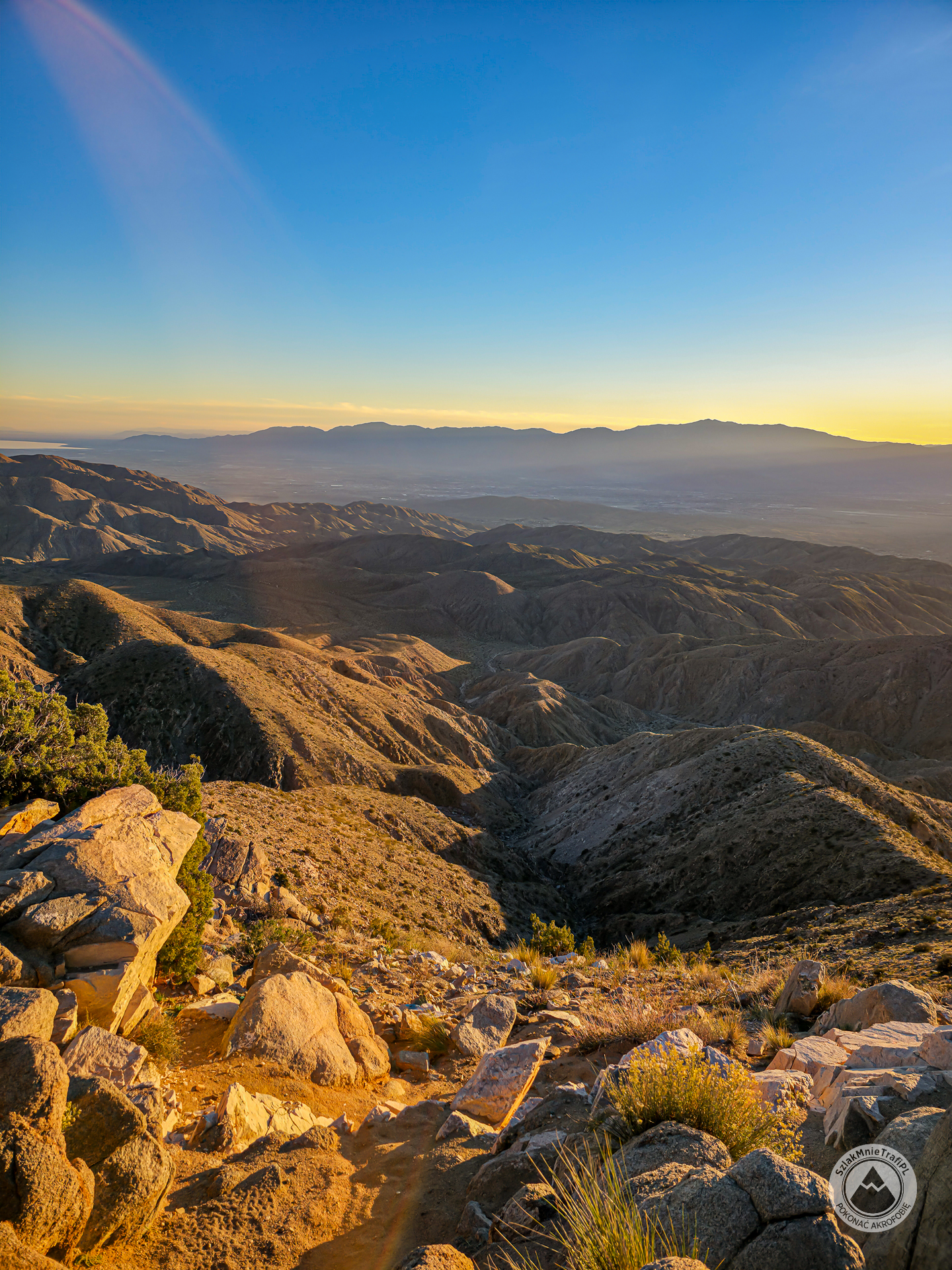Z tego miejsca widok był podwójnie satysfakcjonujący. Z jednej strony zachód słońca obserwowany już bez tłumu, z drugiej — Keys View i Salton Sea widziane z góry, z zupełnie innej perspektywy. Dopiero później okazało się, że do właściwego wierzchołka Inspiration Peak pozostawał jeszcze prawie płaski kilometr, ale ten krótki sprint w pogoni za światłem i tak był dokładnie tym, czego w tamtej chwili potrzebowałem.
