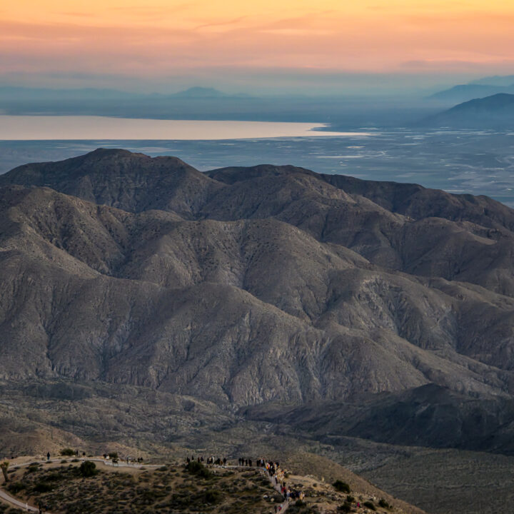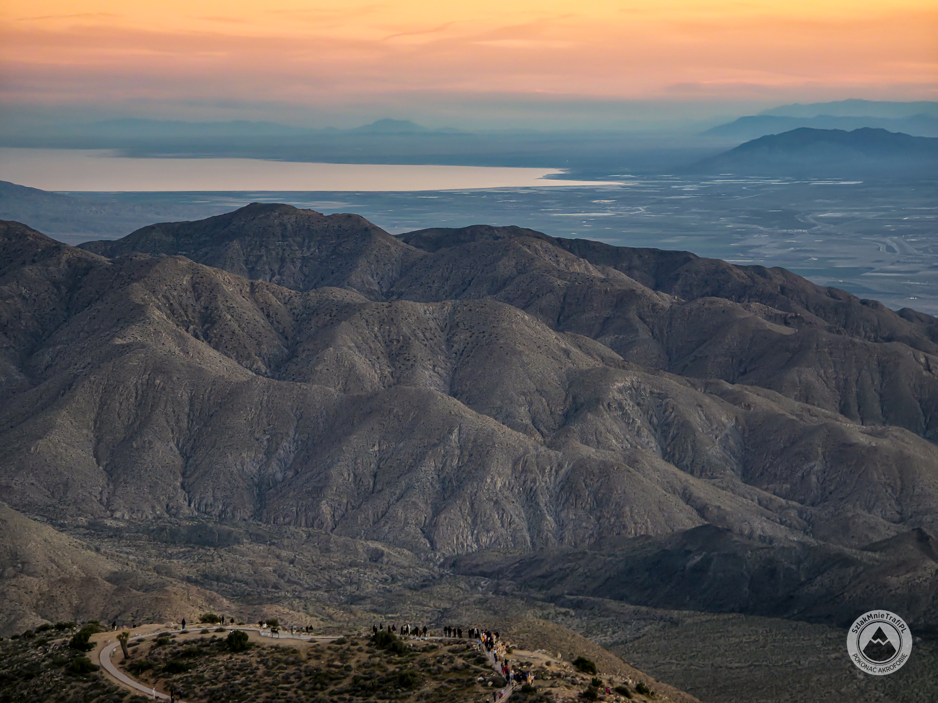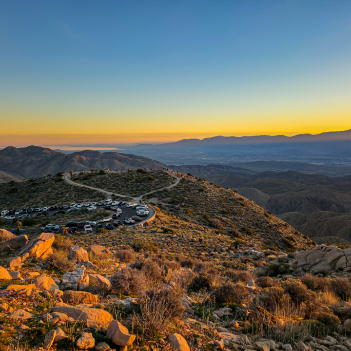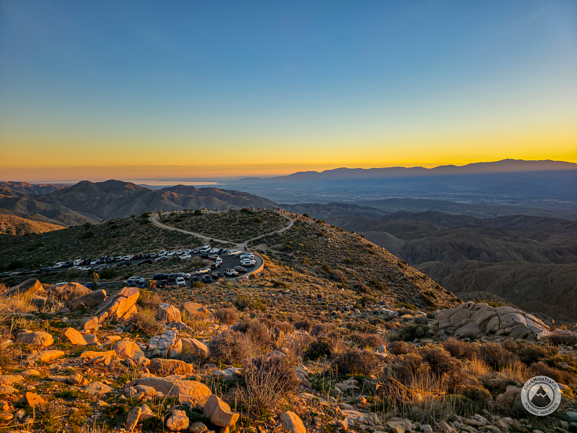 Nie tylko my pędziliśmy na Keys View na zachód słońca. Parking na szczycie, mieszczący około 50 samochodów, był już kompletnie zapchany, więc – jak wielu innych – zaparkowaliśmy w nie do końca regulaminowym miejscu, wzdłuż parkingowej zawrotki. Na górze szybko dało się odczuć chłód. Bez puchówki nie miałbym tam czego szukać. Ludzie zasiedli na murkach, skałach i każdej wolnej krawędzi, jak w naturalnym amfiteatrze, wpatrując się w czerwoną tarczę słońca powoli znikającą za pasmem San Jacinto Mountains.