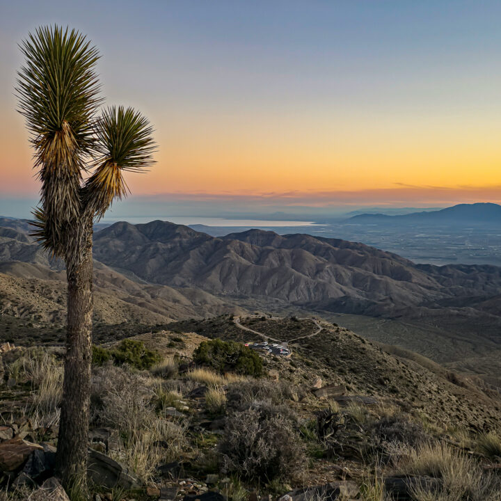 Widok ze szczytu, oznaczonego tabliczką i niewielkim kopcem kamieni, to niemal pełna, 360-stopniowa panorama. Całość wygląda jak precyzyjnie wykonana makieta – z miniaturowymi górami, pustynną równiną i charakterystycznymi roślinami porozrzucanymi w idealnych proporcjach. Mógłbym stać tam bez końca, ale wiatr szybko zagonił nas za rozłożysty krzew jukki Mojave, który dawał zaskakująco skuteczną osłonę. Zdjęcie z moim pierwszym „pięciotysięcznikiem” i pora było ruszać w dół.
