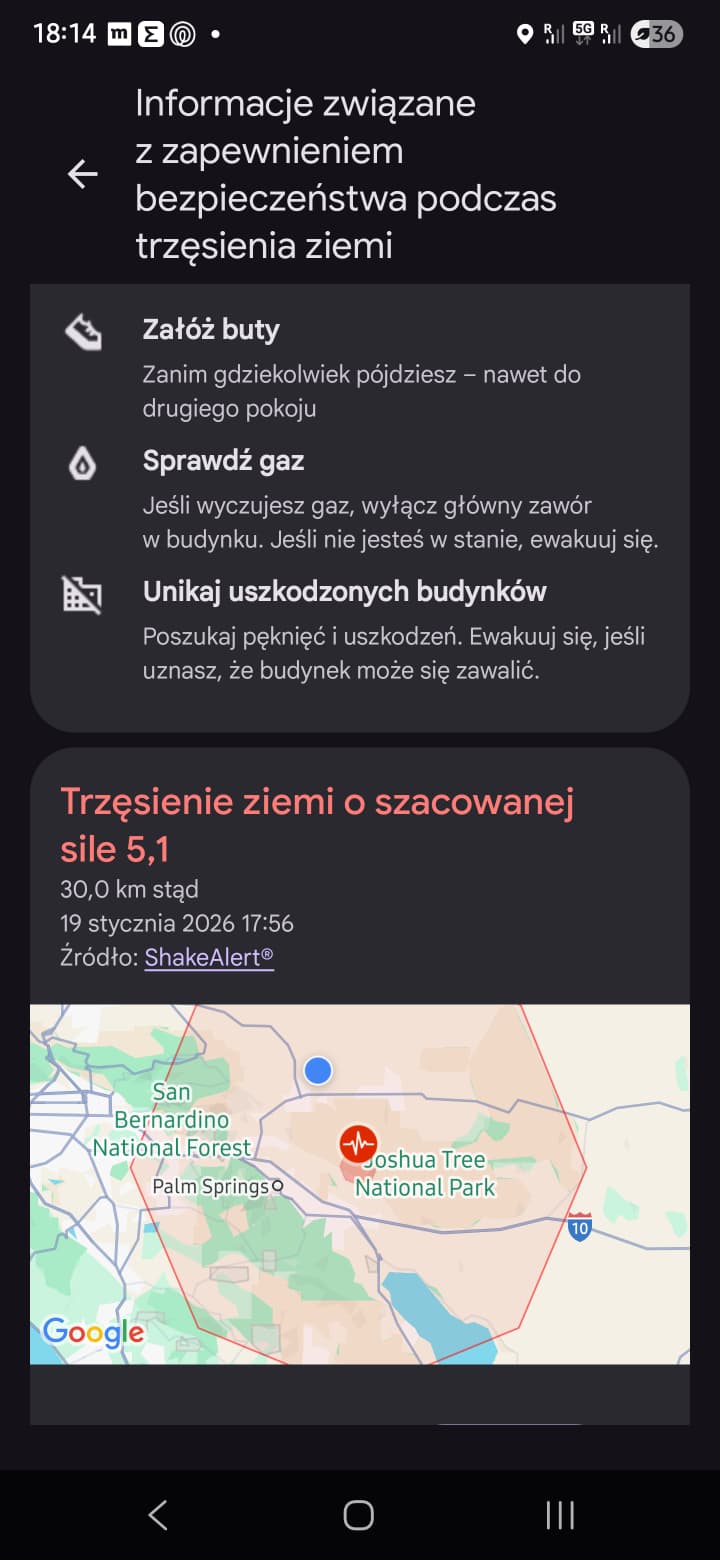 W drodze powrotnej, jeszcze na terenie parku, minęliśmy kilka pojazdów na sygnałach świetlnych. Coś ewidentnie działo się w okolicy, choć wtedy nie mieliśmy pojęcia co. Kilka minut później telefon mojego Wspólnika zawibrował pierwszy. Chwilę po nim — mój. Alert systemu ShakeAlert®. Informacja była krótka i konkretna: trzęsienie ziemi o sile 5,1. Około 30 kilometrów od miejsca, w którym się znajdowaliśmy.